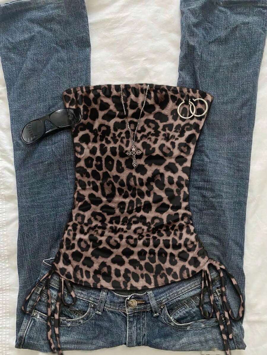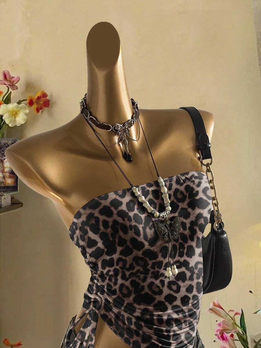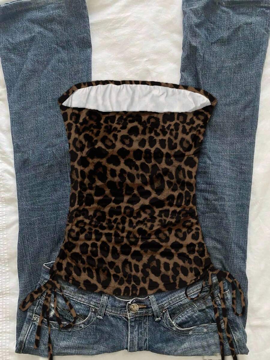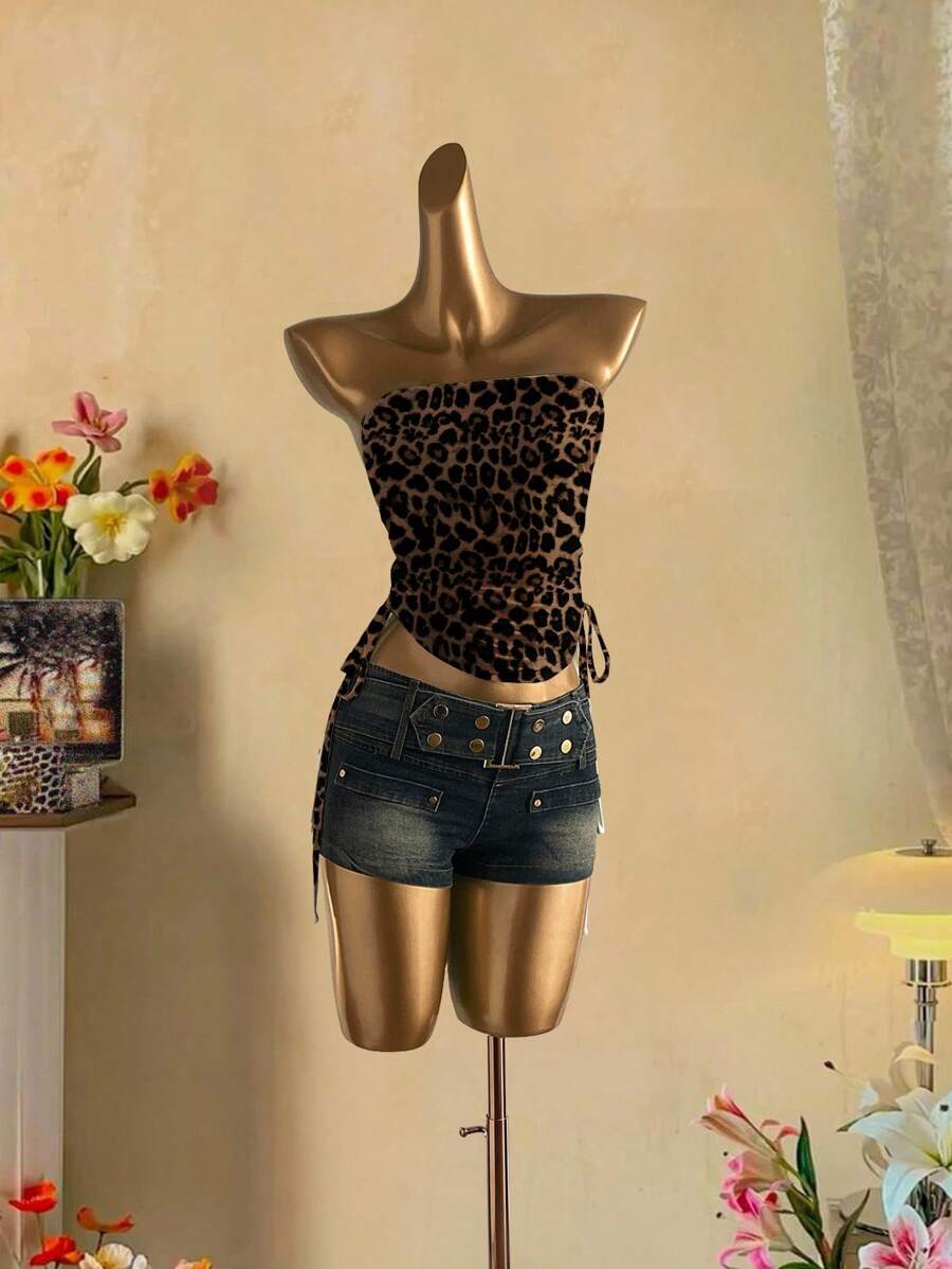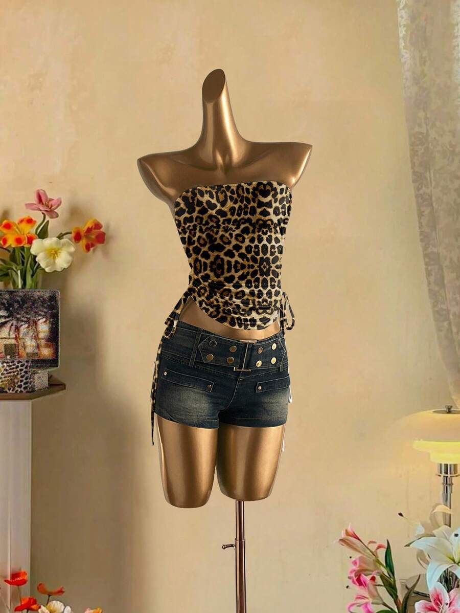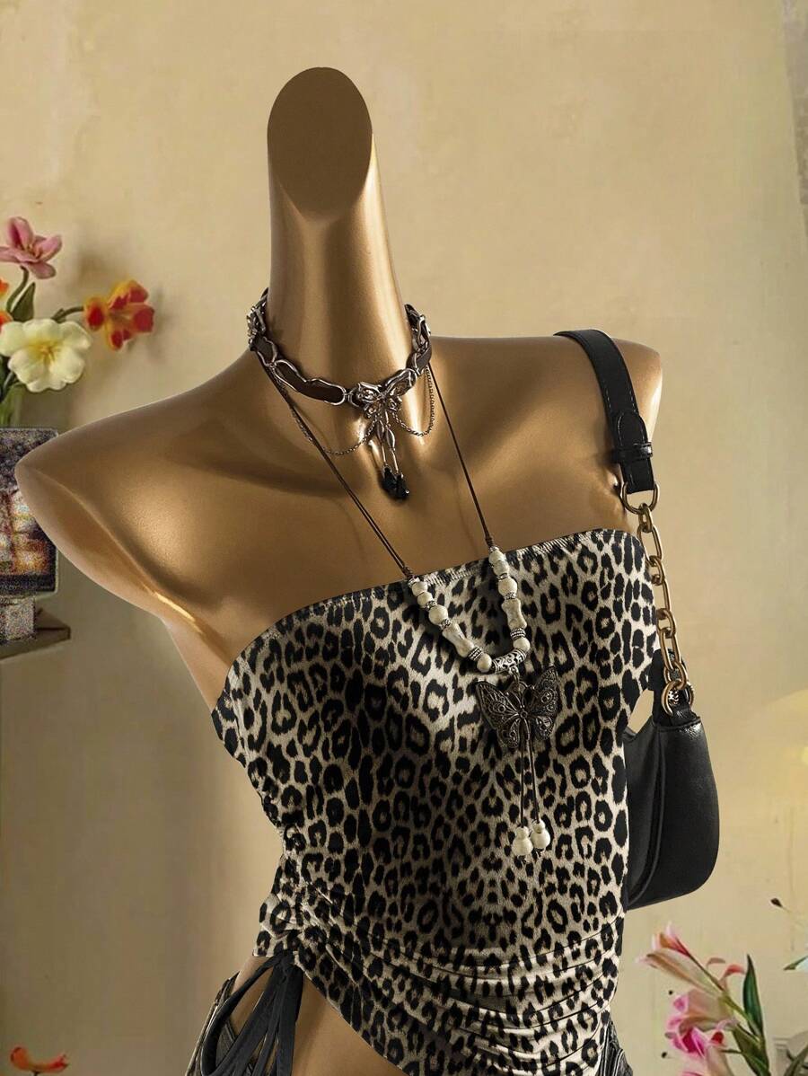 Attitoon parte superior con lazo de estilo sexy y fruncido con estampado de leopardo para mujeres