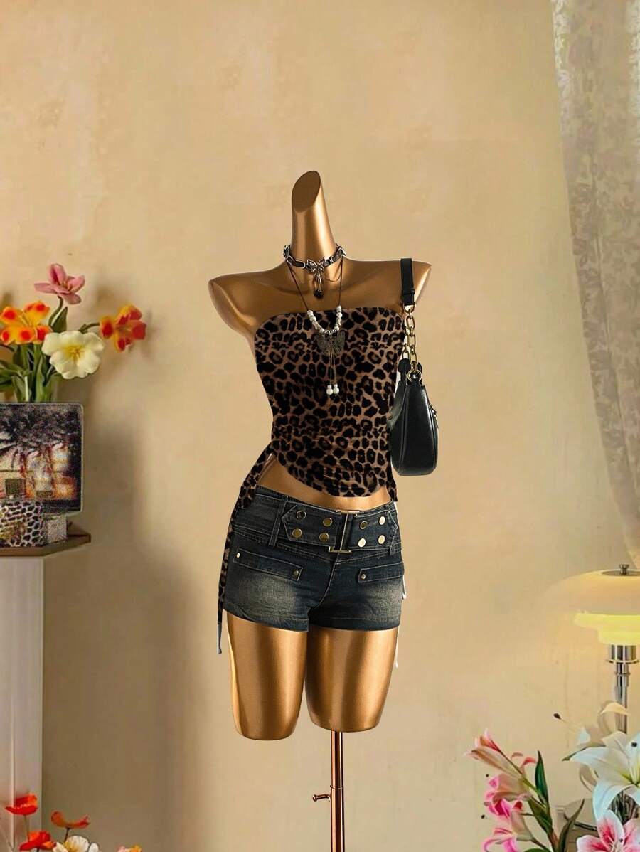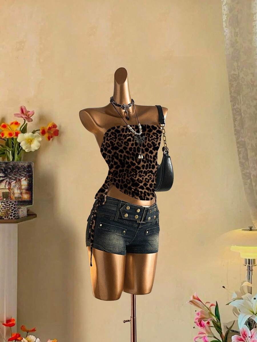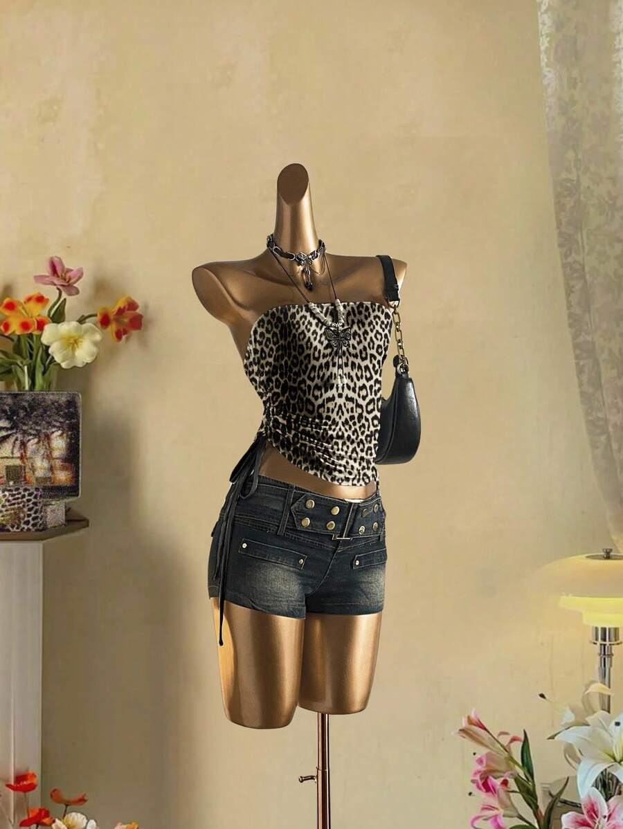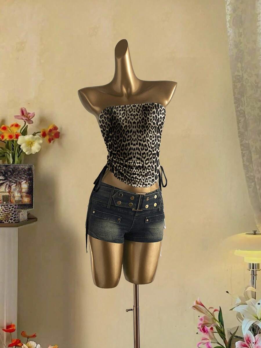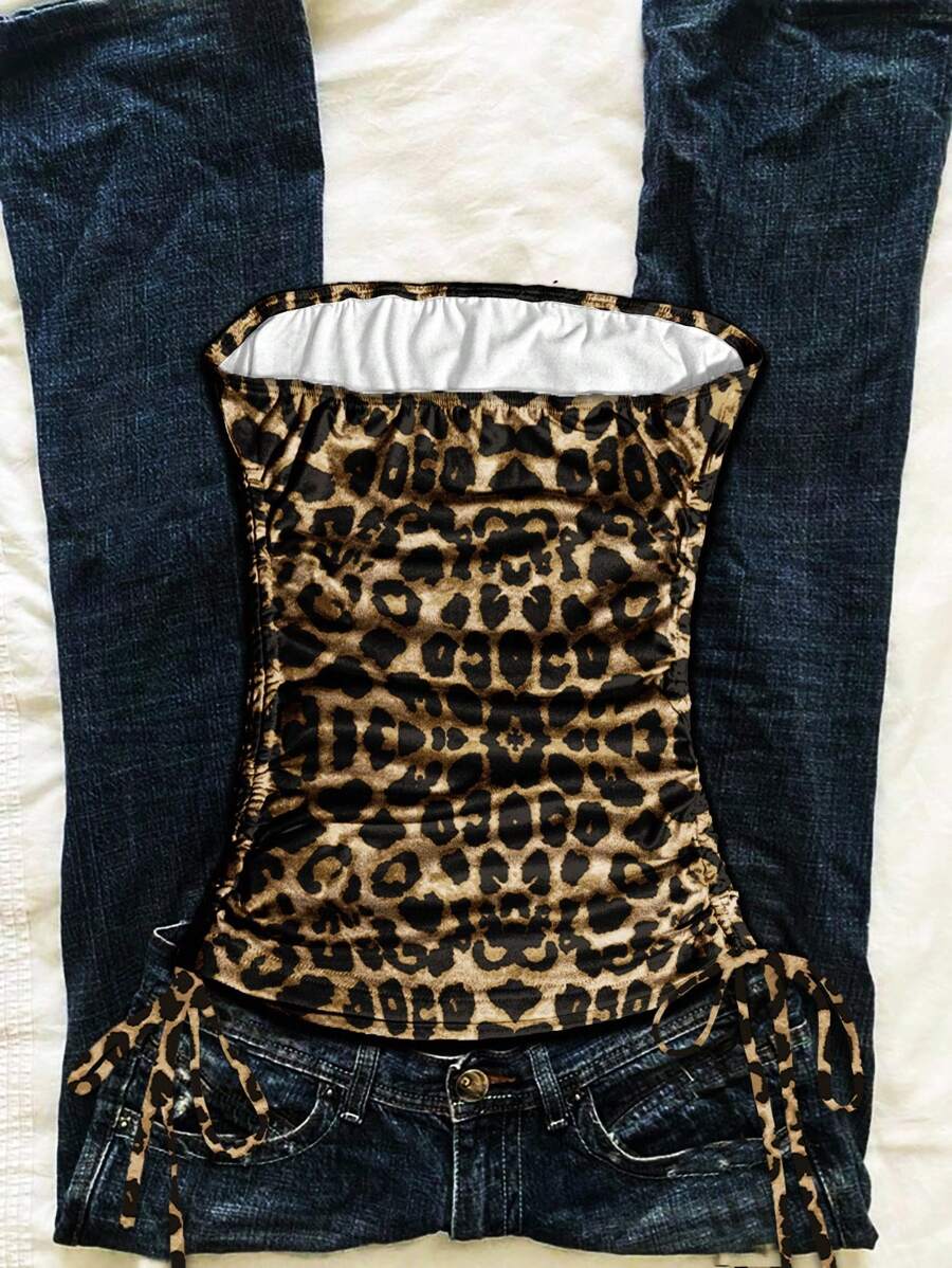 Attitoon parte superior con lazo de estilo sexy y fruncido con estampado de leopardo para mujeres