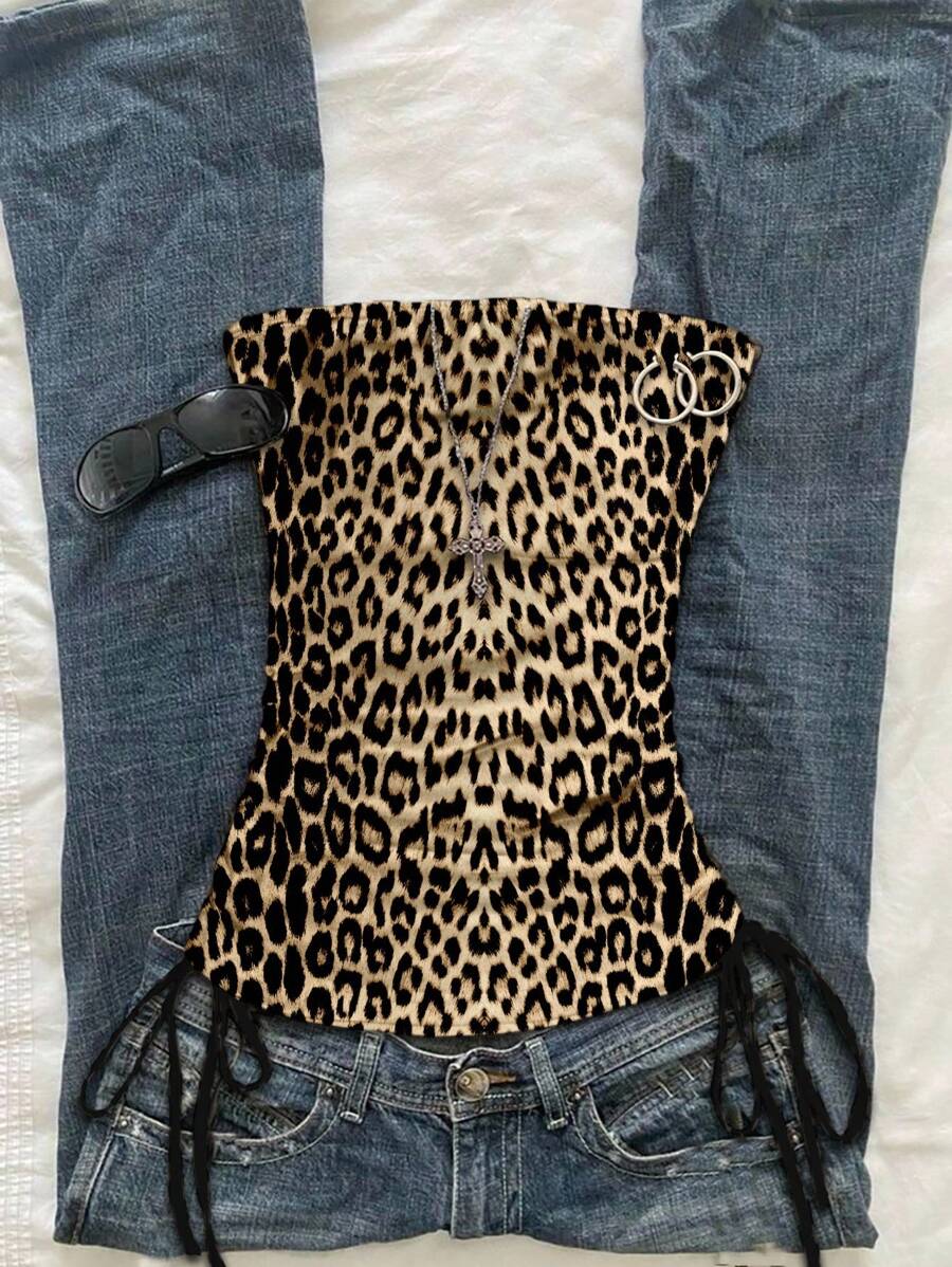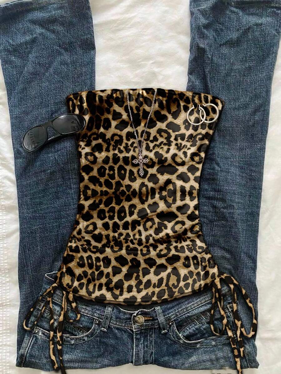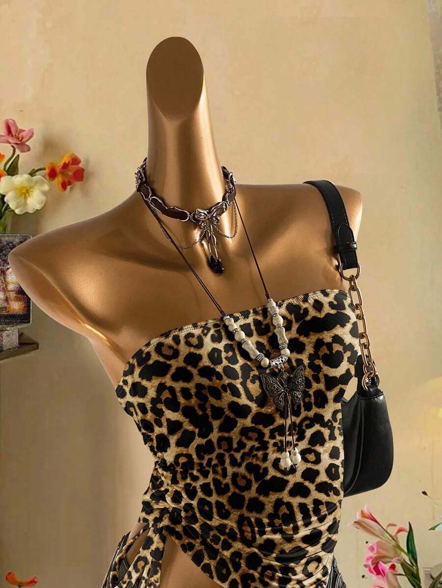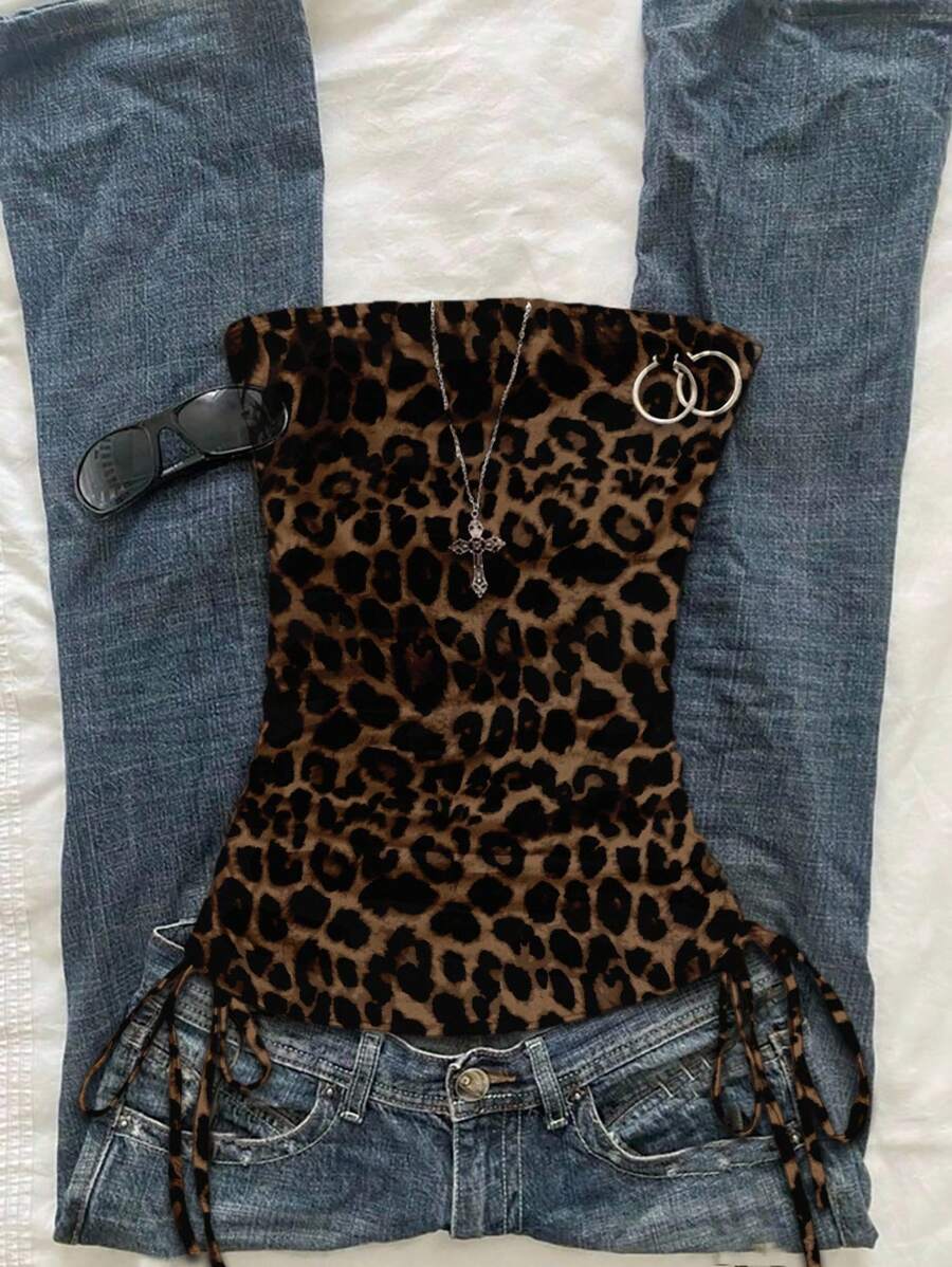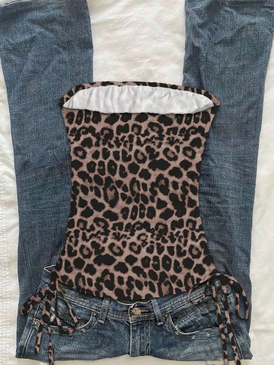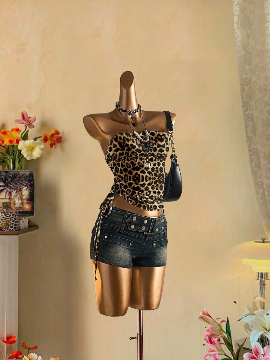 Attitoon parte superior con lazo de estilo sexy y fruncido con estampado de leopardo para mujeres