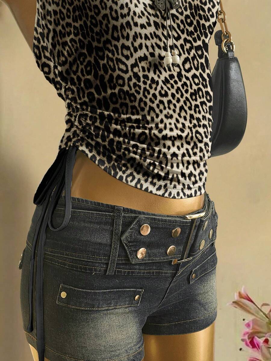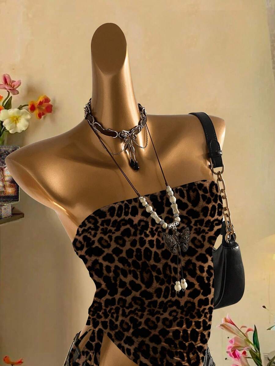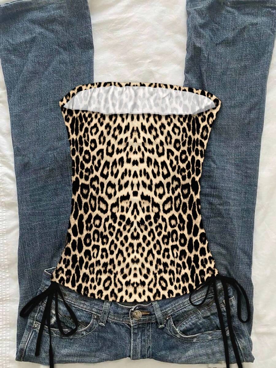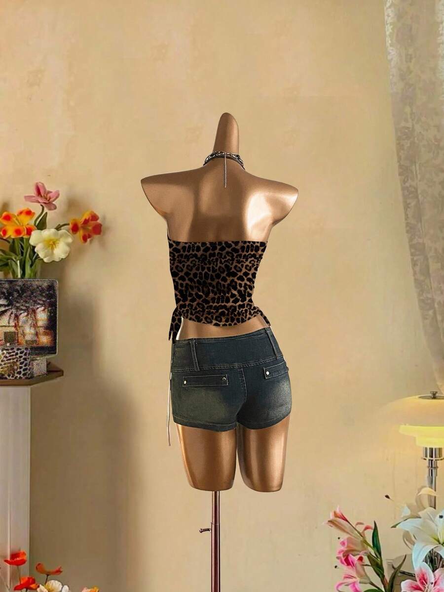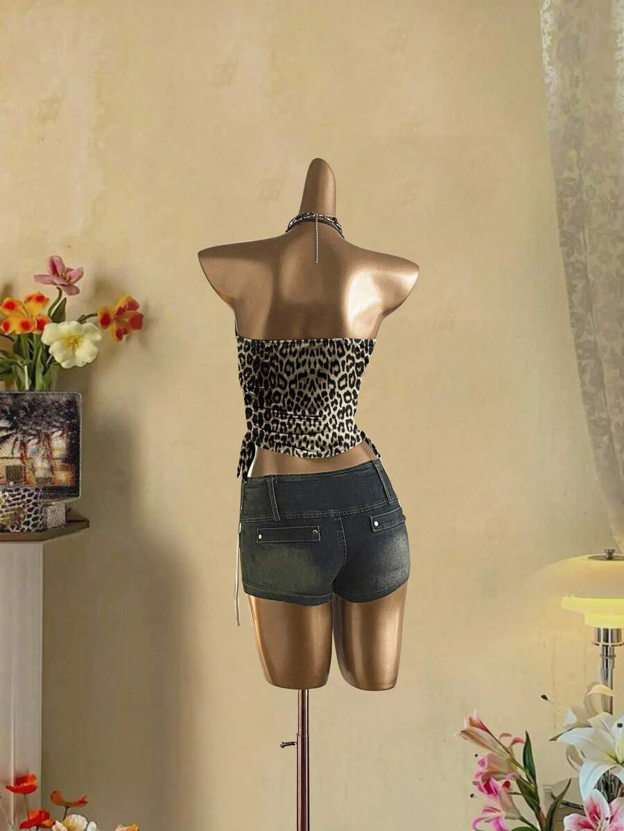 Attitoon parte superior con lazo de estilo sexy y fruncido con estampado de leopardo para mujeres