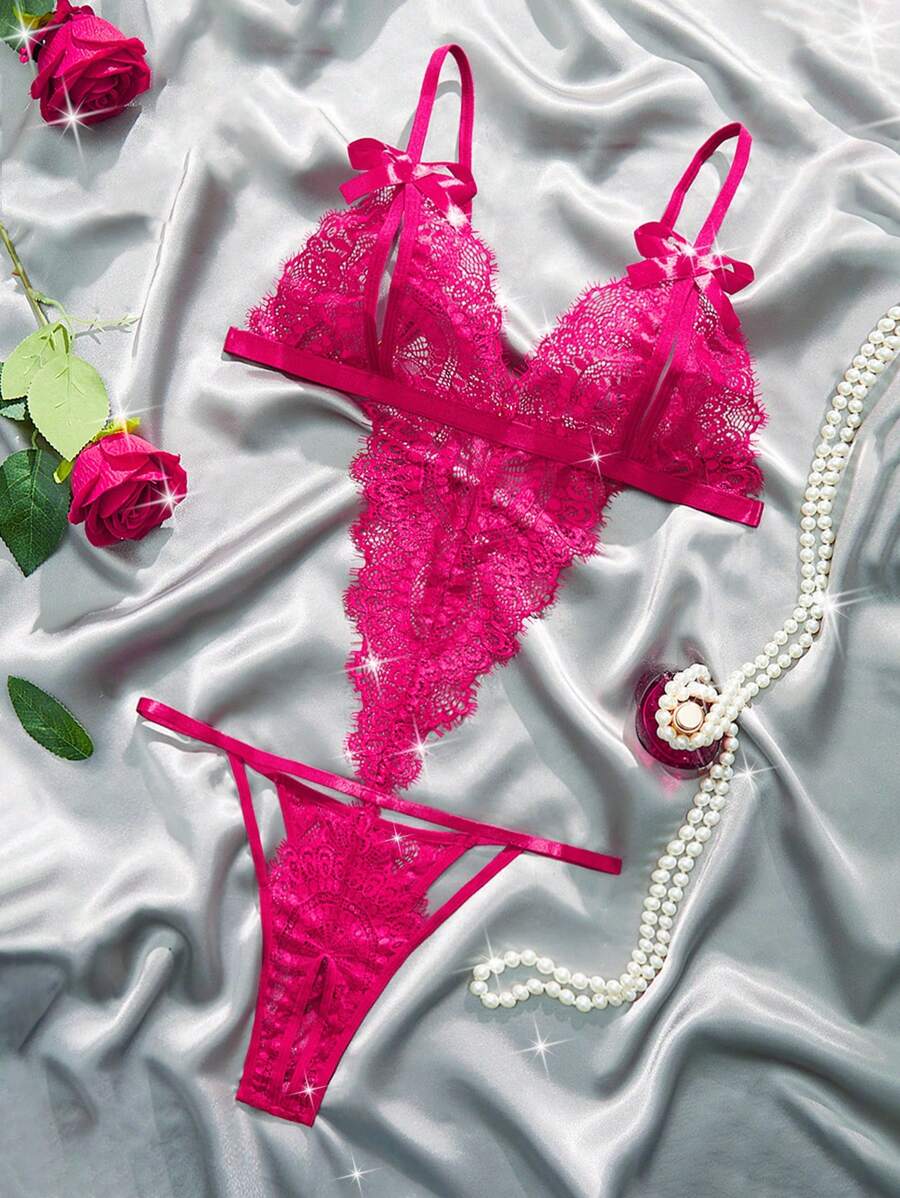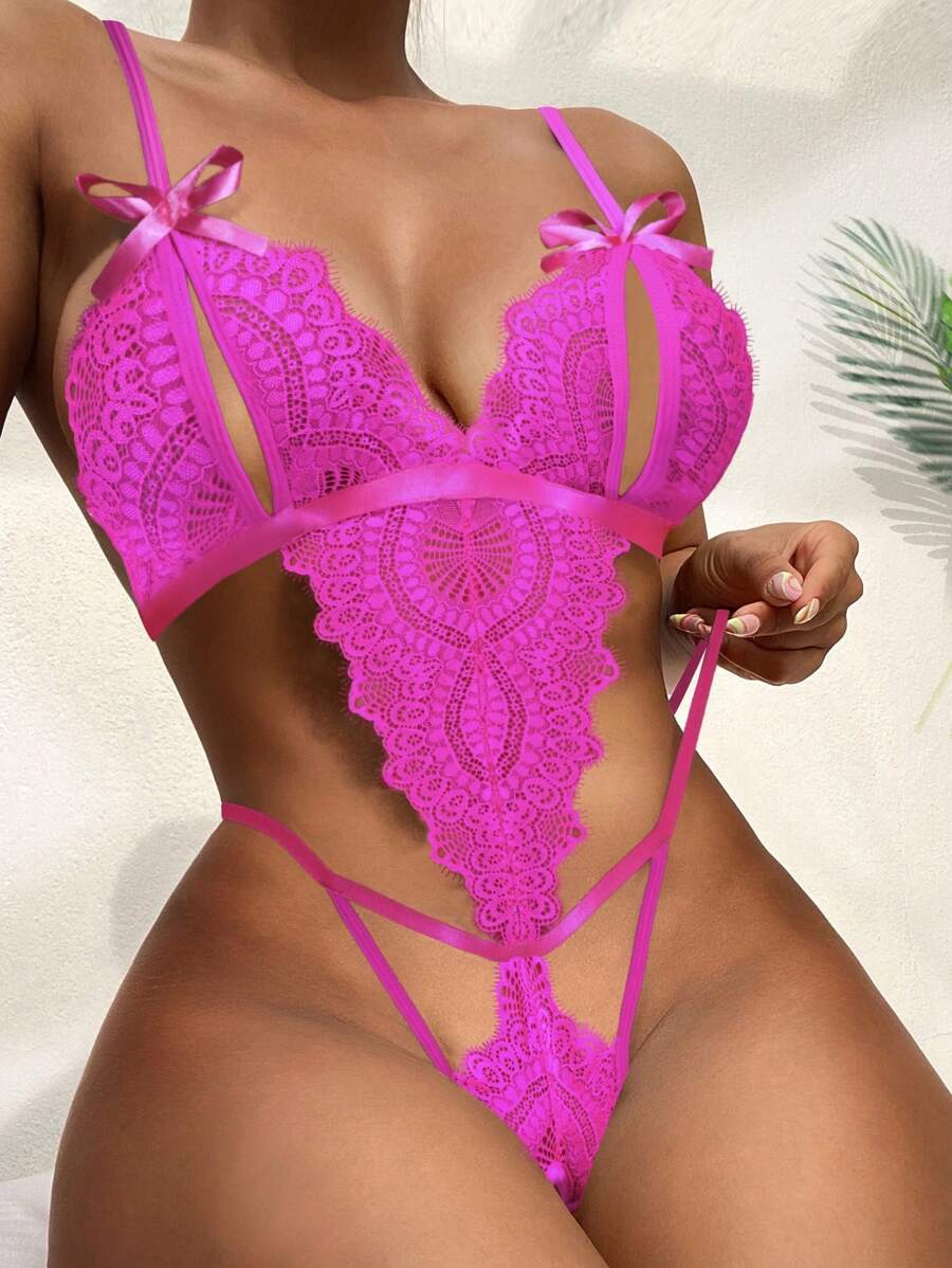 Enterizo lencero con corte de encaje de pestanas, lazo delantero