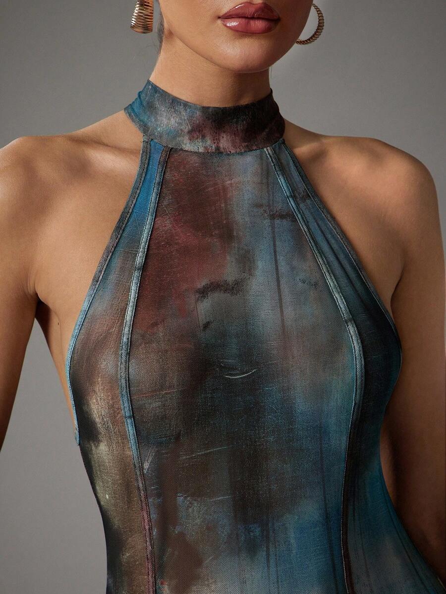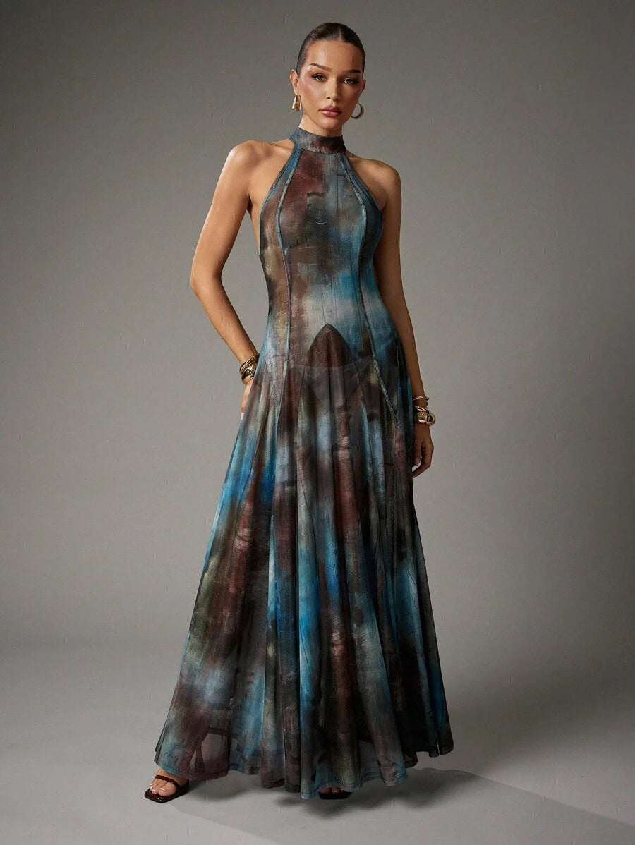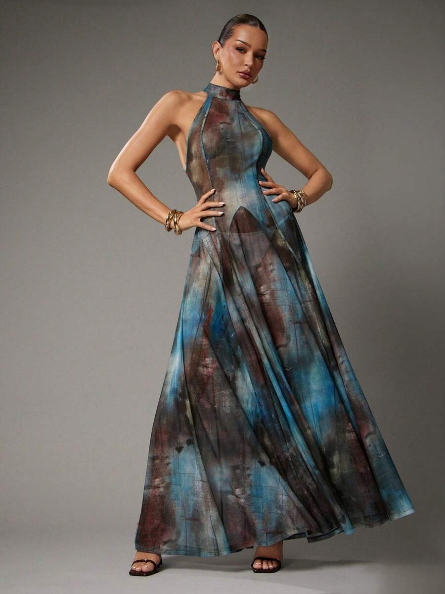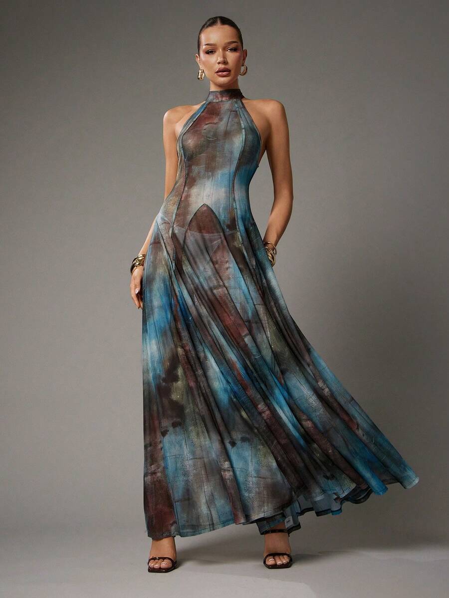 Vestido maxi elegante de mujer para vacaciones de verano con estampado abstracto sexy tipo halter