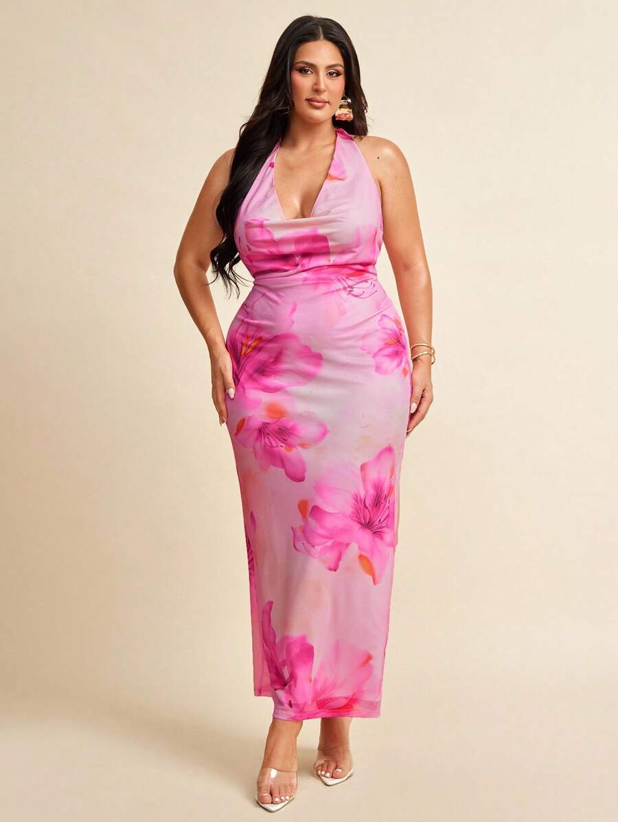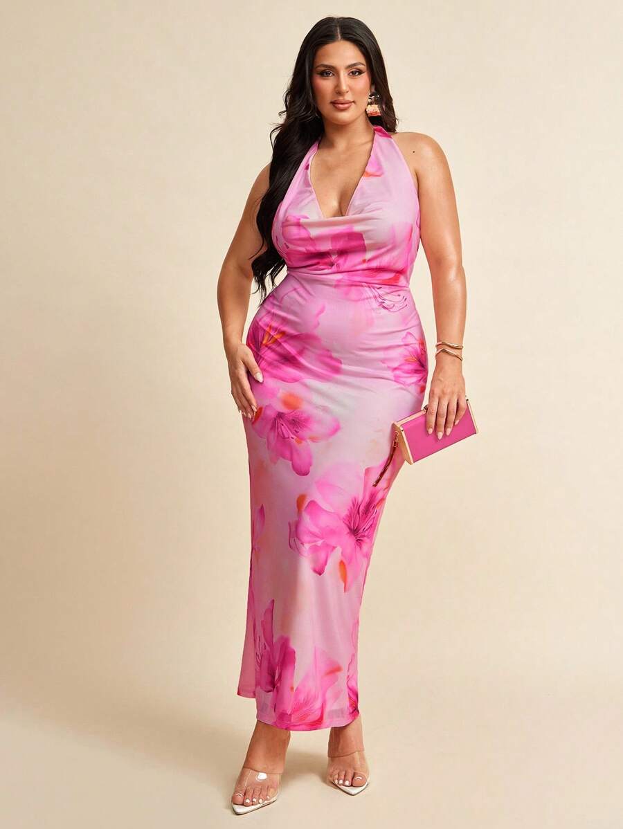Vestido de playa estilo resort con estampado floral y cuello halter para mujer de talla grande, vestido con estampado floral y caida en el cuello, primavera/verano