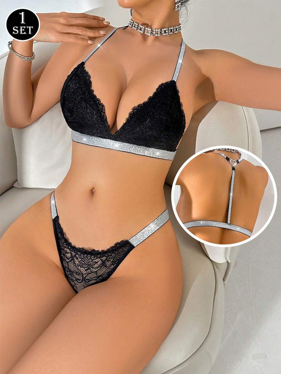 Conjunto de ropa interior para mujer con encaje bordado, malla, tirantes de spaghetti plateados, copas triangulares francesas, diseno espalda descubierta en forma de corazon y tanga