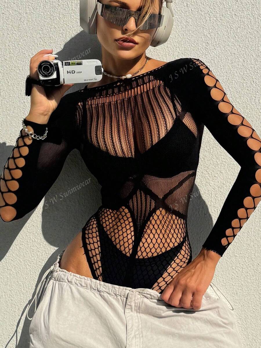 1 pieza vestido de cobertura sexy para mujer de manga larga de red (sin bikini para vestido ajustado de festival de musica, calado, transparente, ropa de playa de verano para vacaciones)