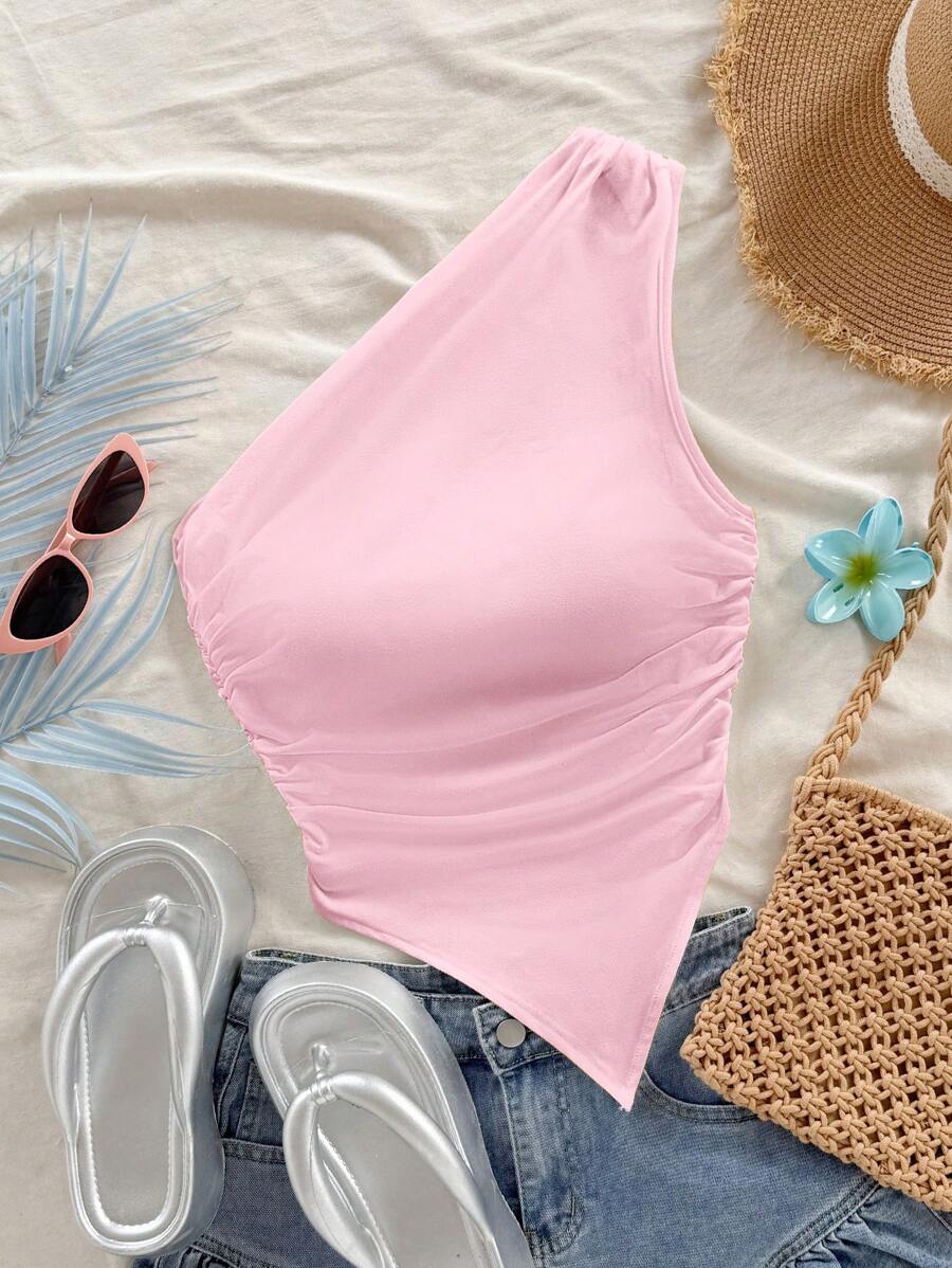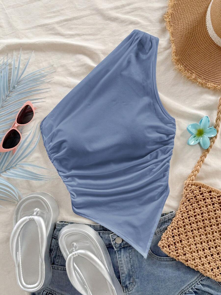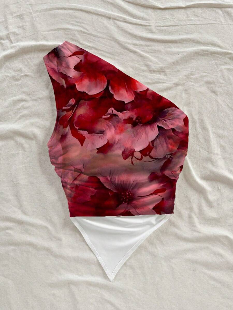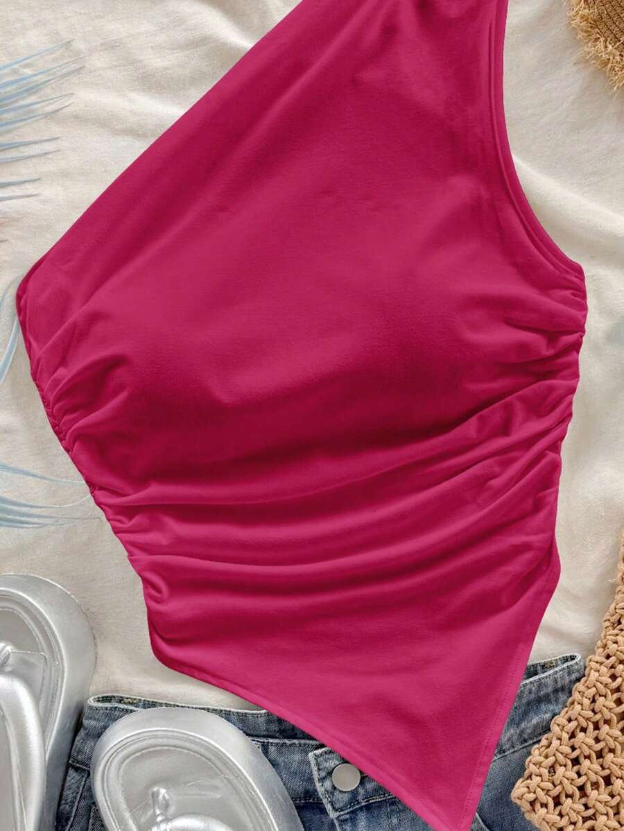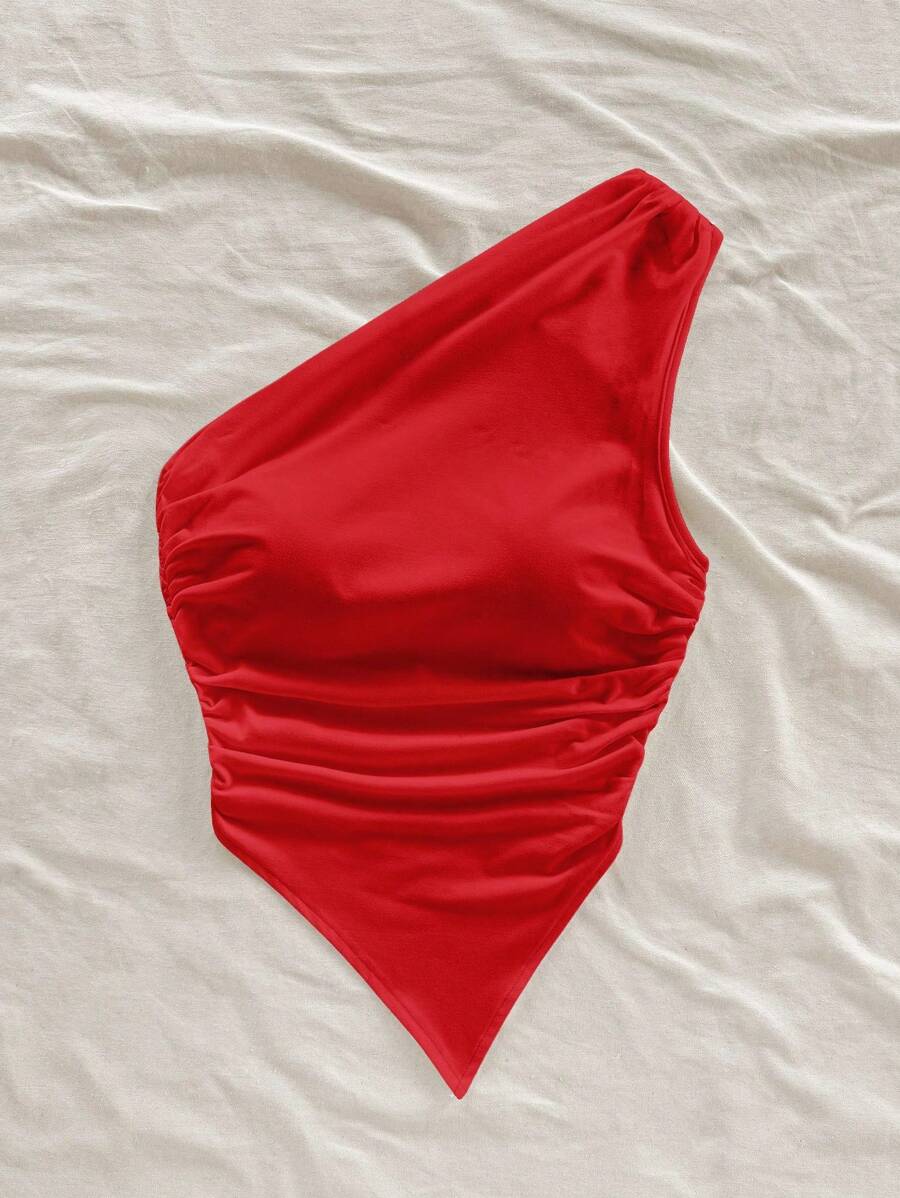 Blusa roja con dobladillo asimetrico que revela los hombros, adecuada para el verano