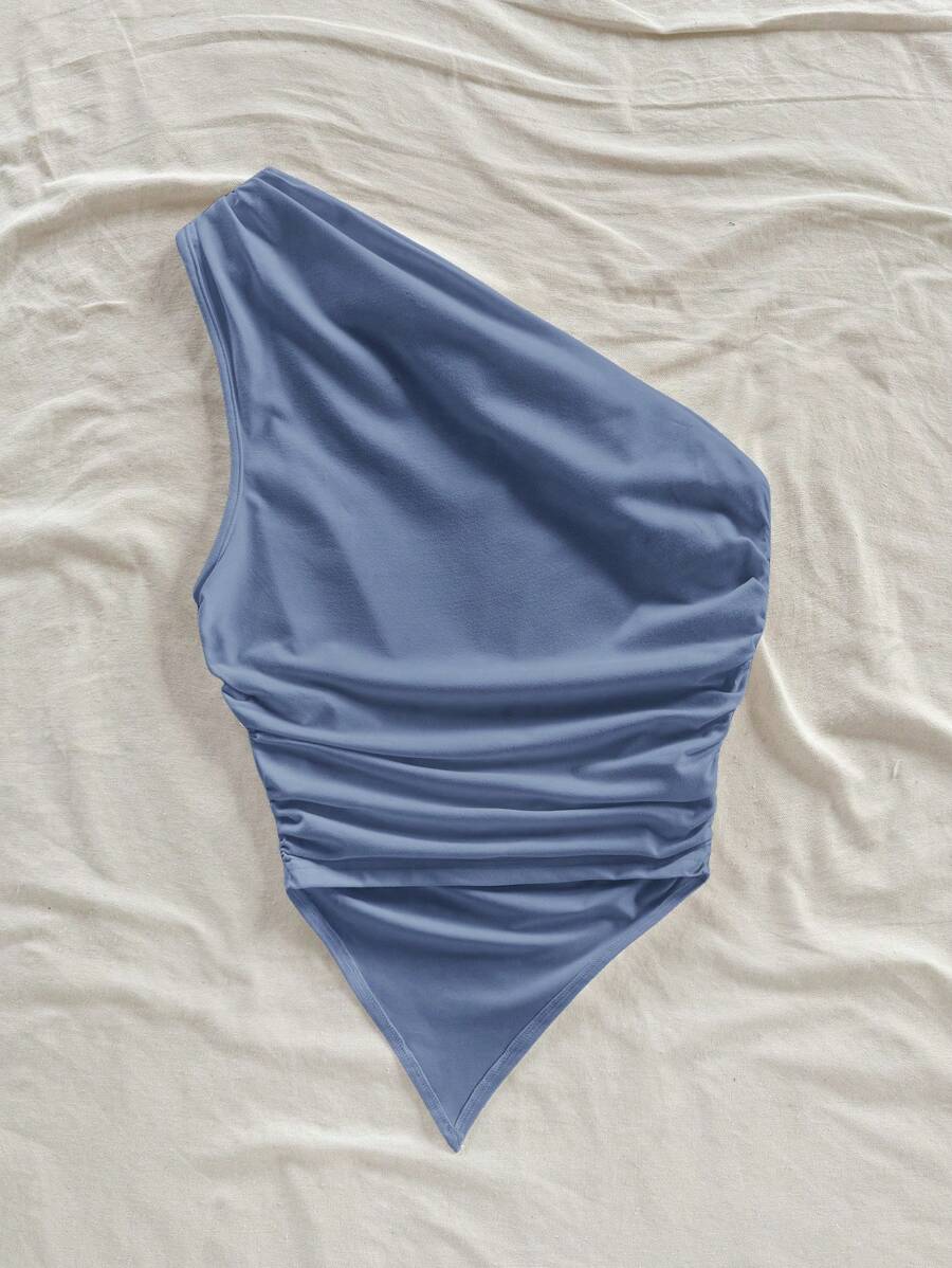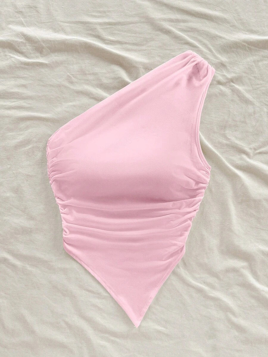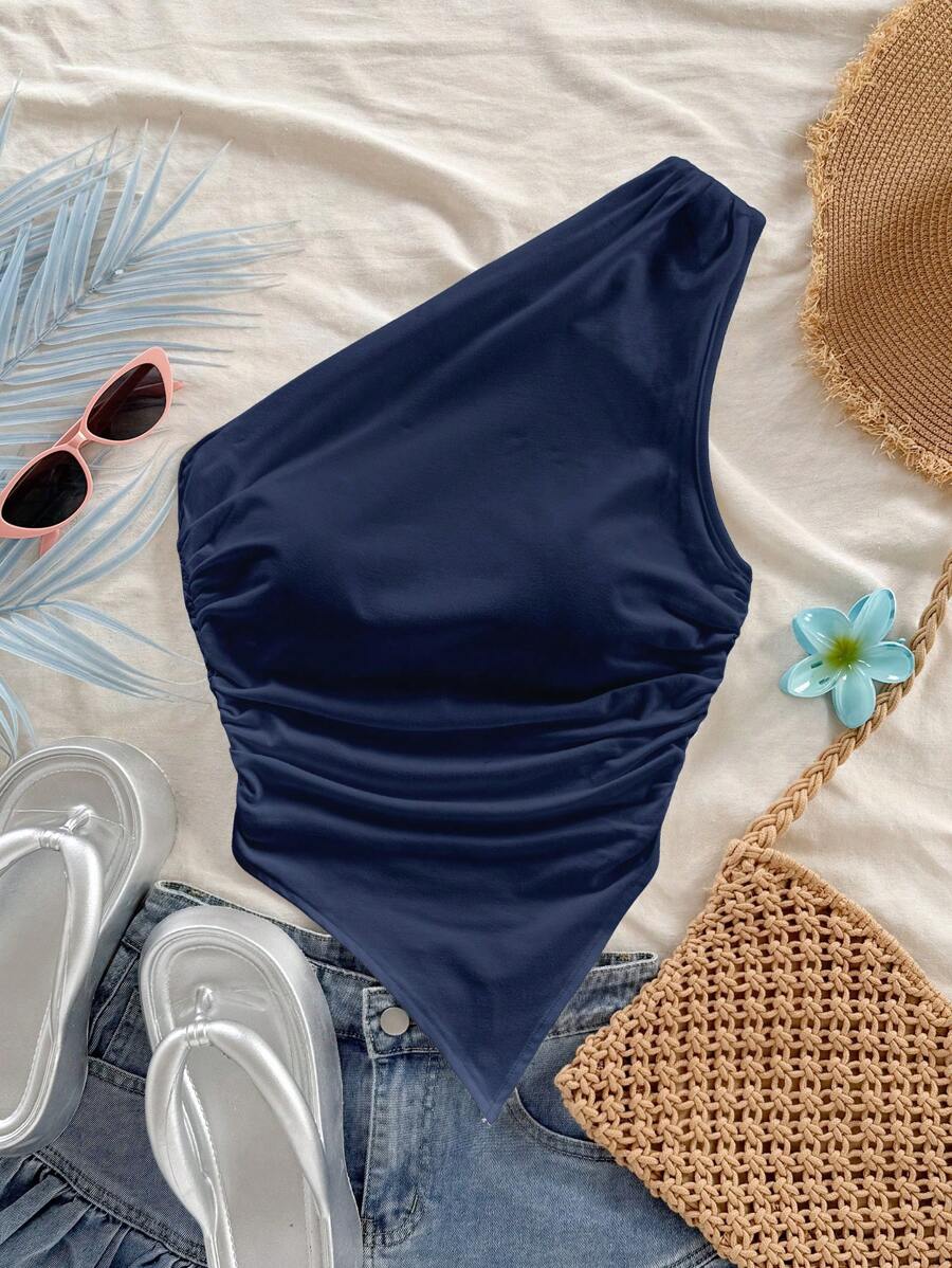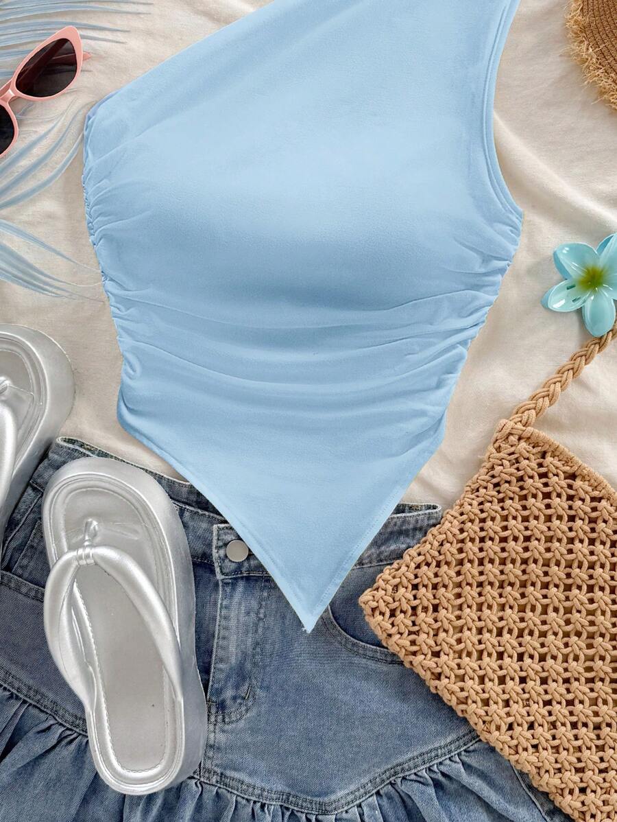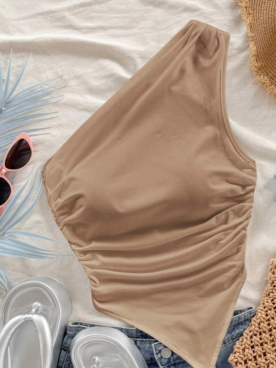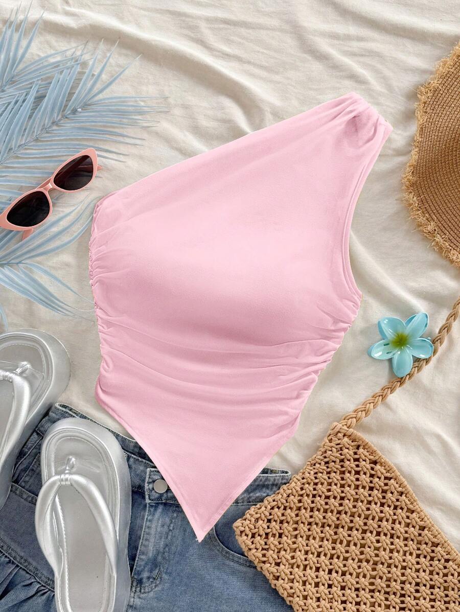 Blusa roja con dobladillo asimetrico que revela los hombros, adecuada para el verano