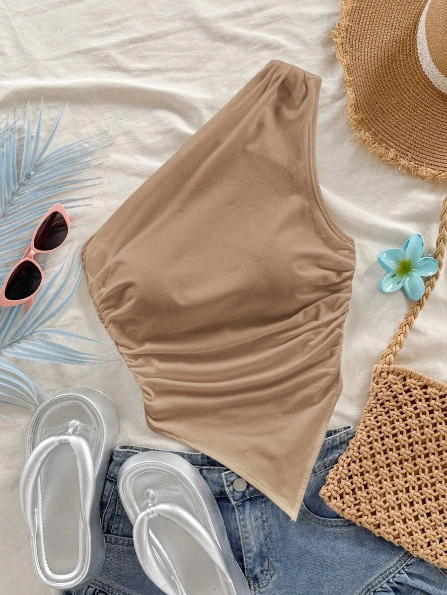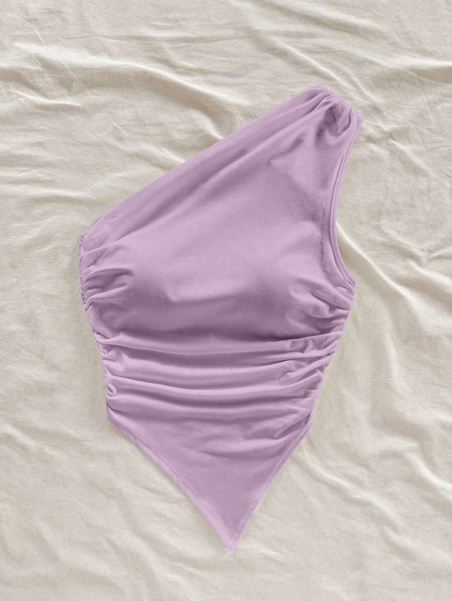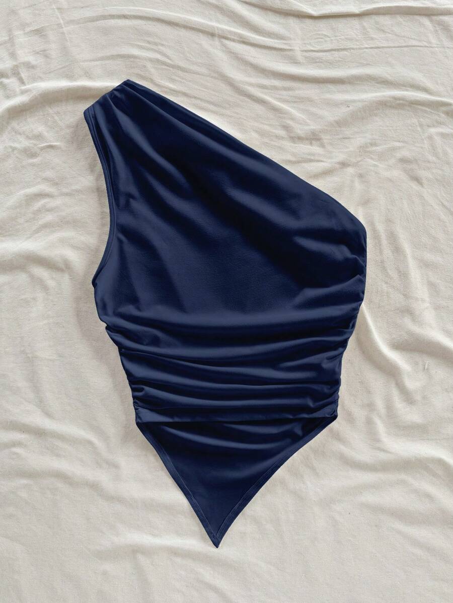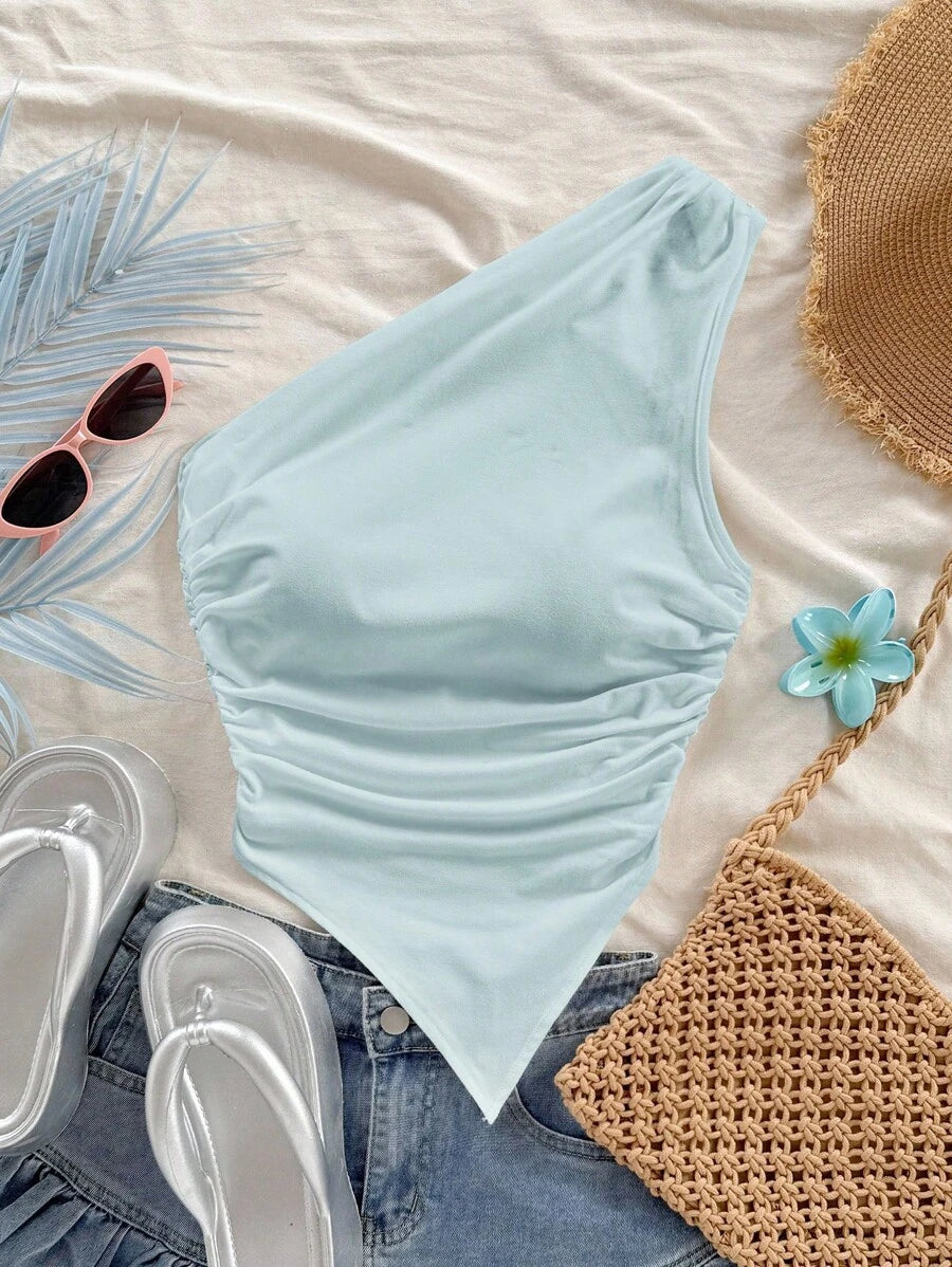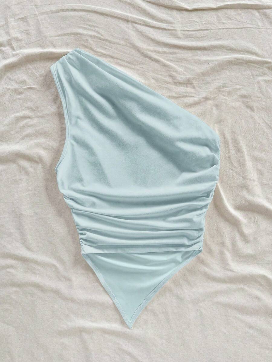 Blusa roja con dobladillo asimetrico que revela los hombros, adecuada para el verano