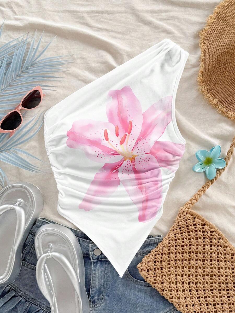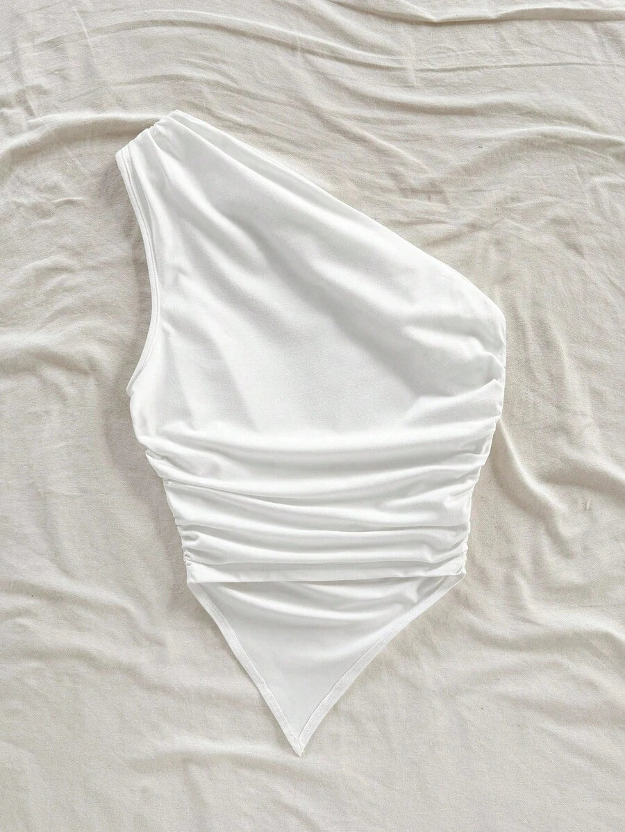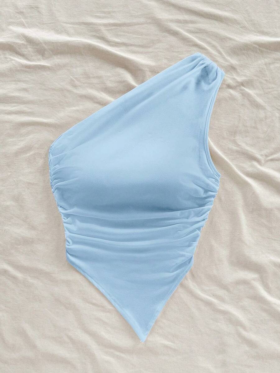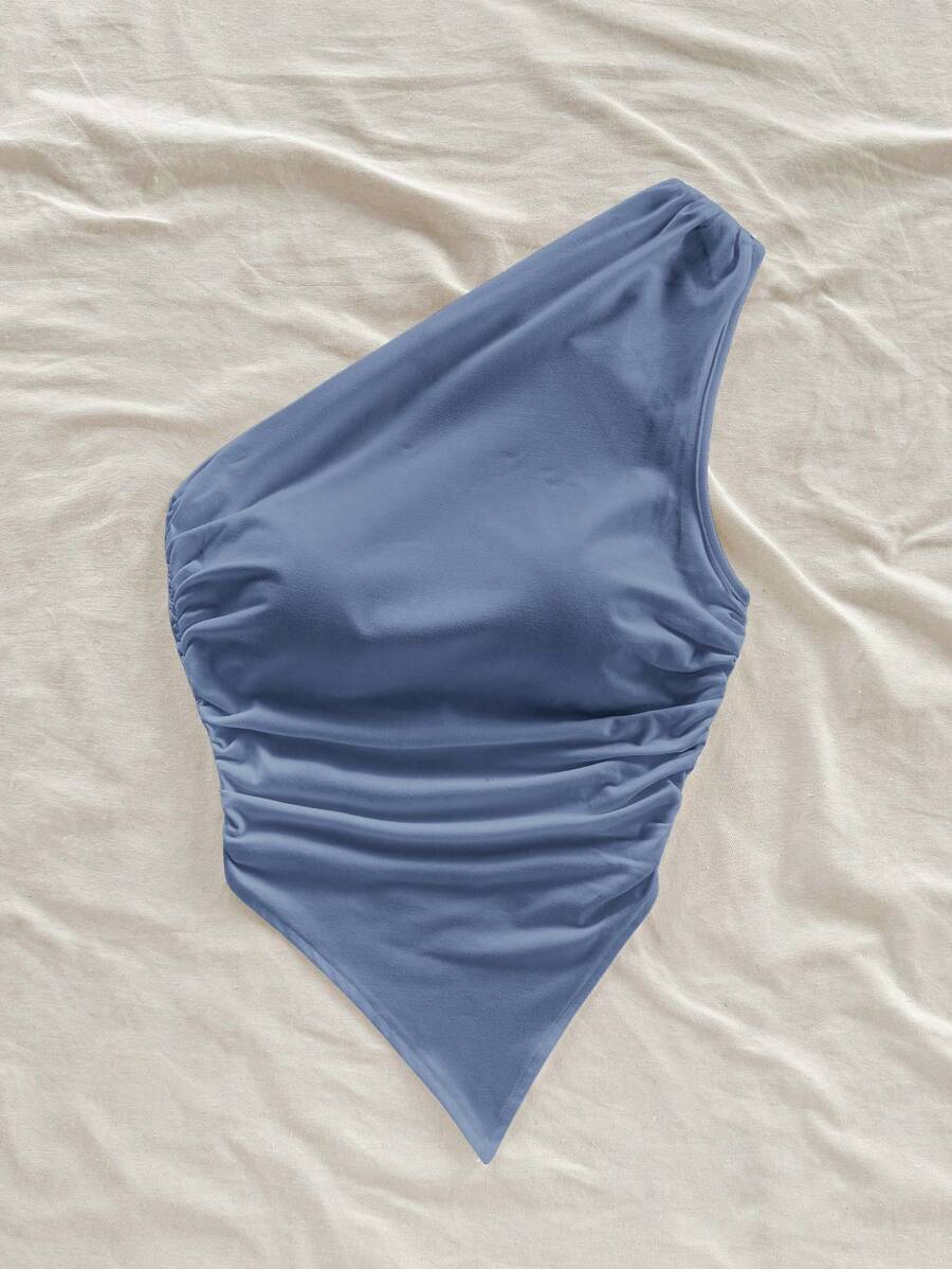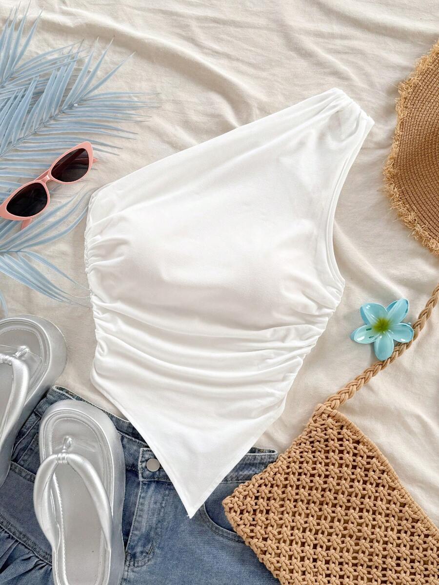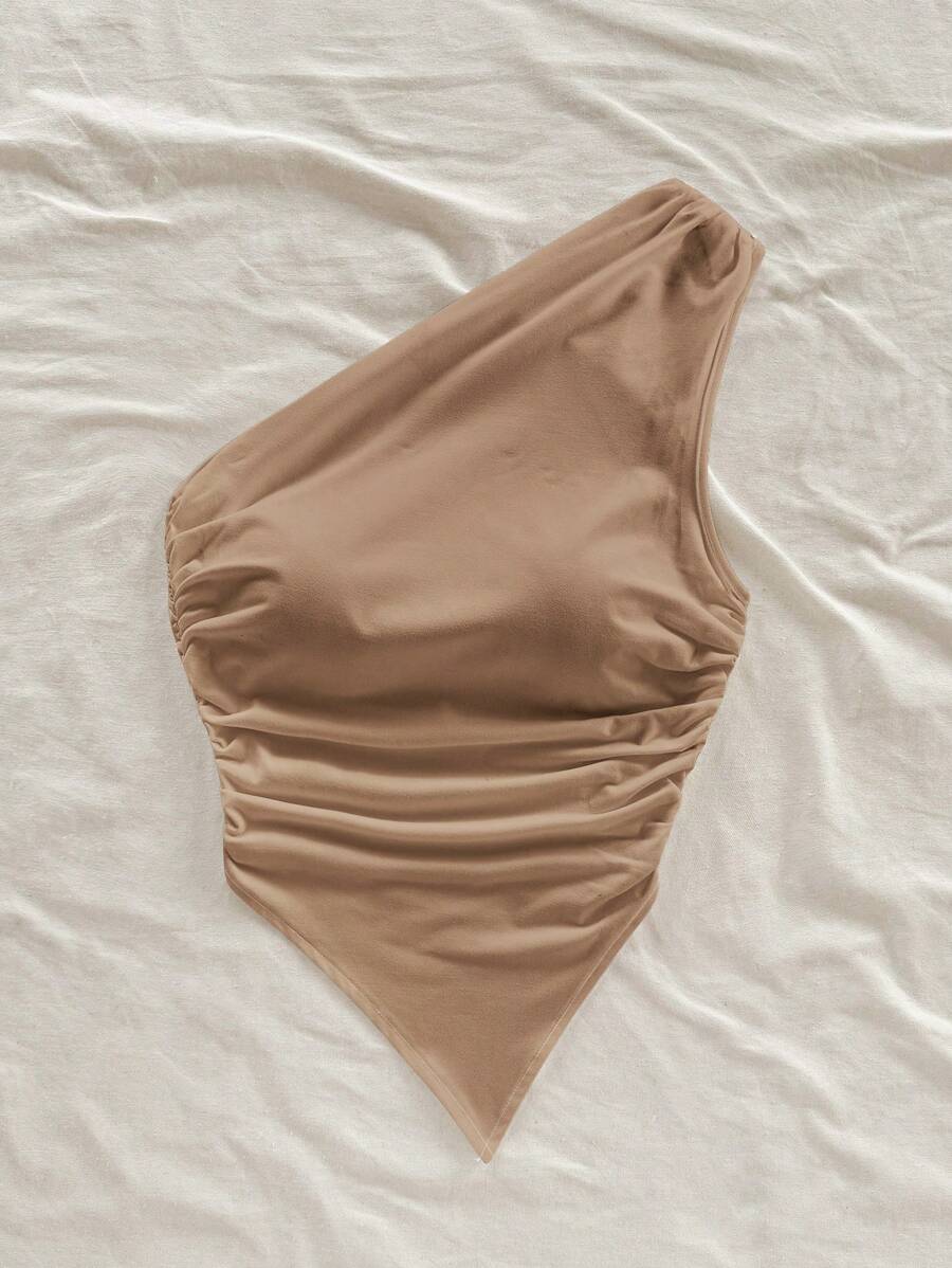 Blusa roja con dobladillo asimetrico que revela los hombros, adecuada para el verano