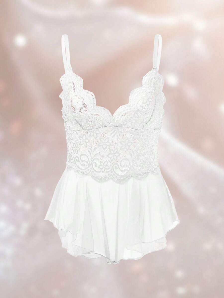 1 pieza bodyduit sexy de mujer con encaje frances, contraste de malla, decoracion de lazo y tirantes ajustables sin aros, para salir