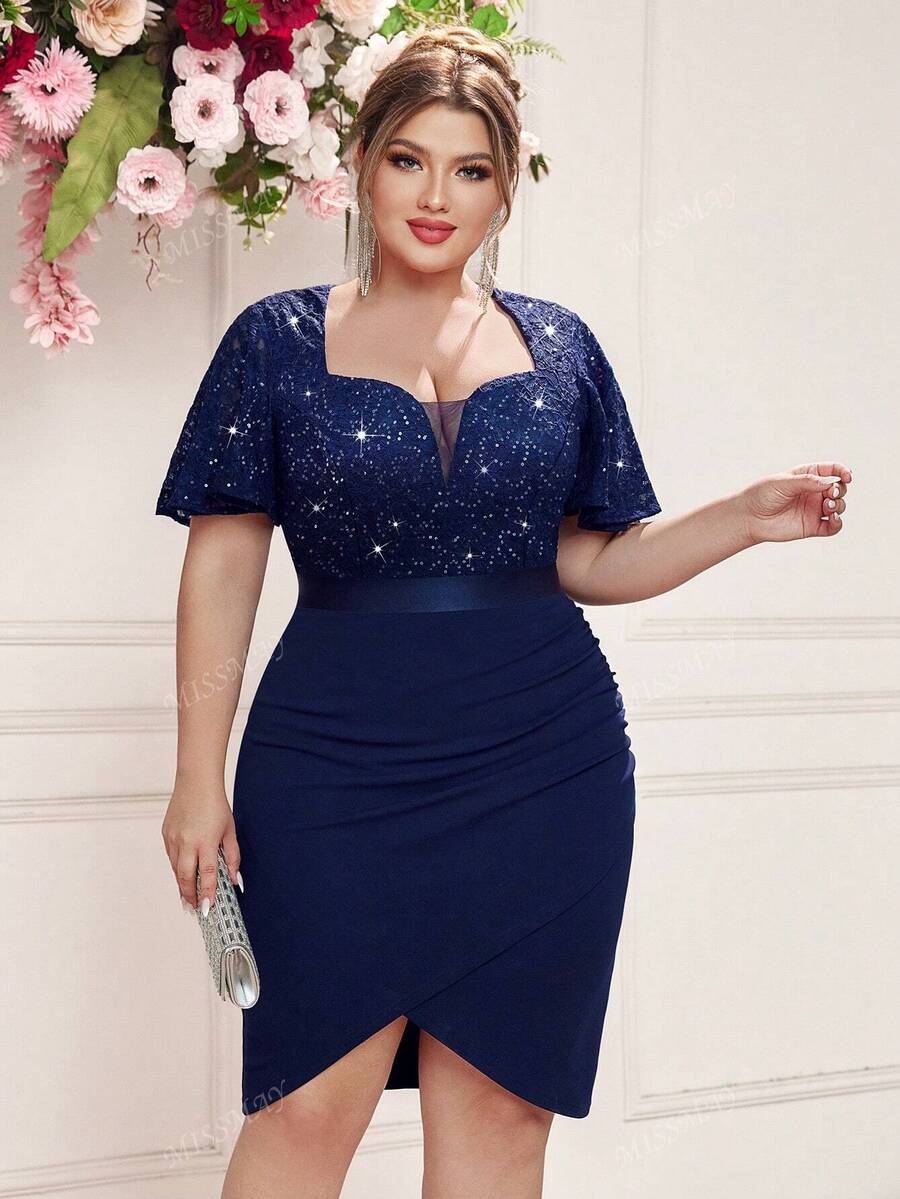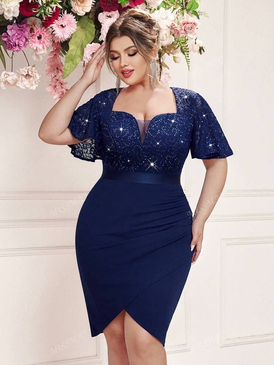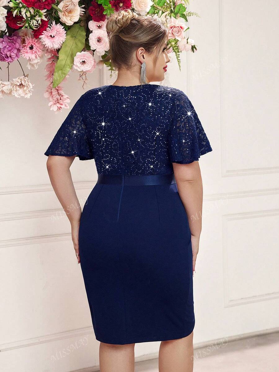 Vestido de coctel ajustado con cuello en v profundo, contraste de lentejuelas, encaje floral, mangas de mariposa, fruncido y bajo envolvente, para fiesta, invitada de boda, salida nocturna, cumpleanos, cena