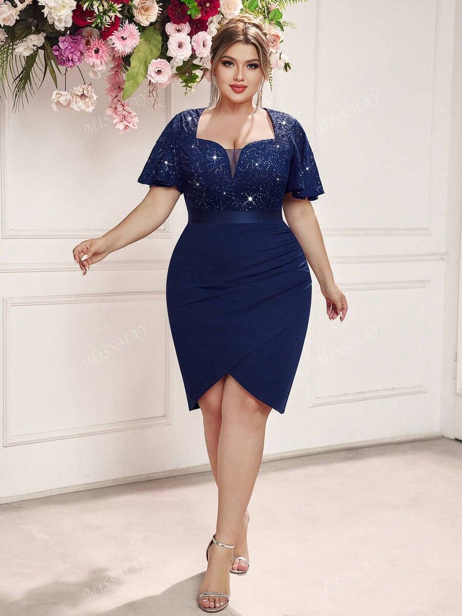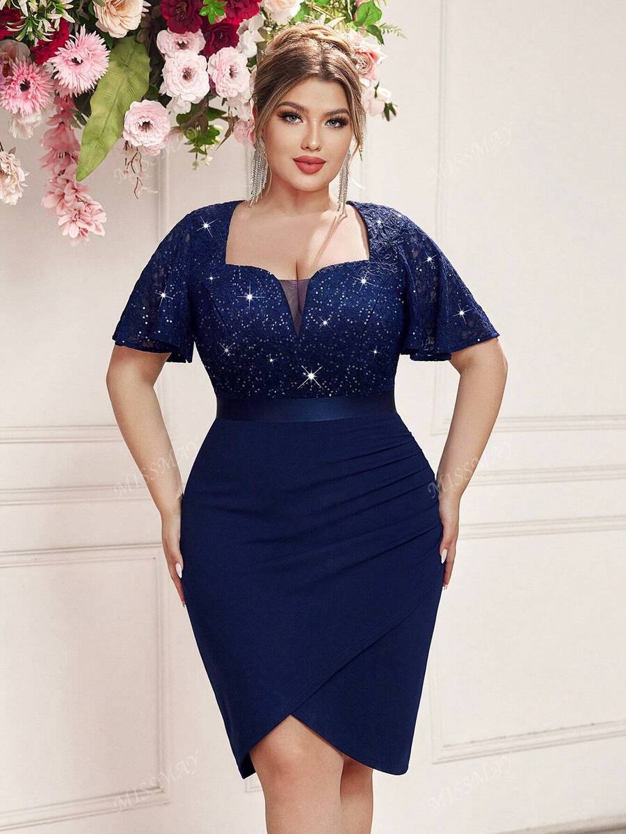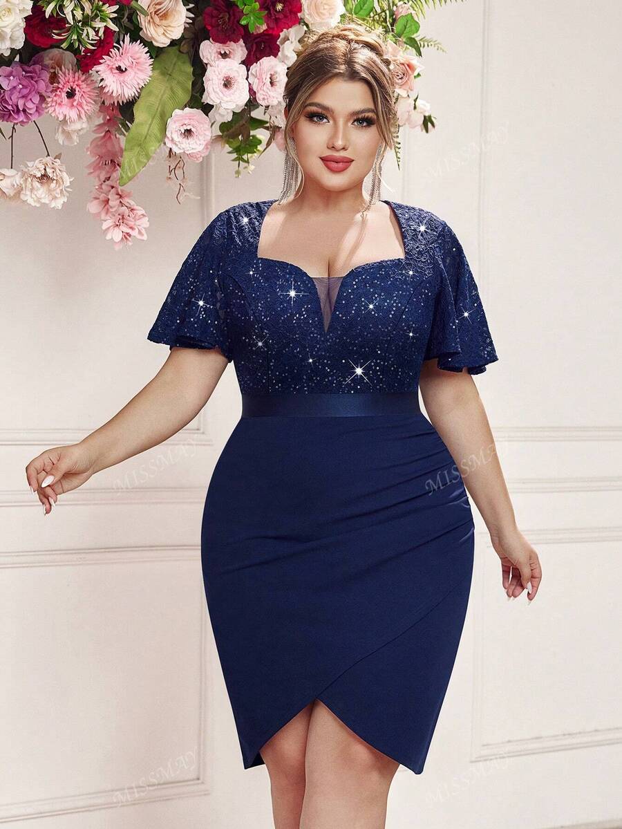 Vestido de coctel ajustado con cuello en v profundo, contraste de lentejuelas, encaje floral, mangas de mariposa, fruncido y bajo envolvente, para fiesta, invitada de boda, salida nocturna, cumpleanos, cena