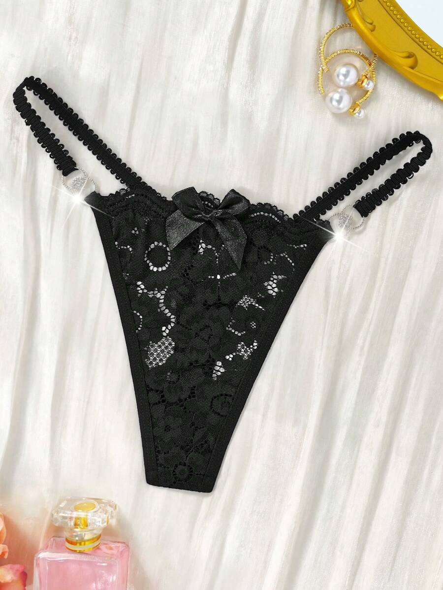 Lenceria sexy tanga de g con encaje floral, strass y lazo delantero