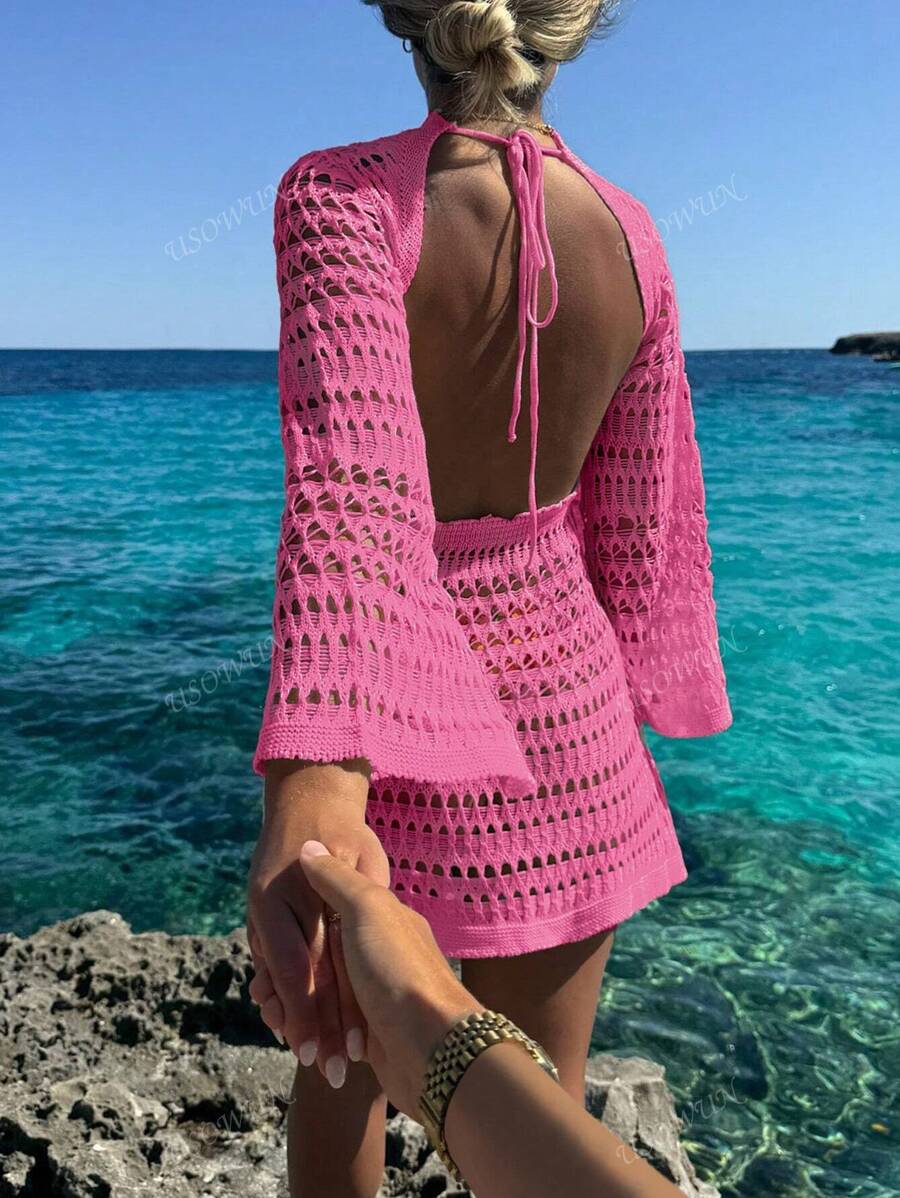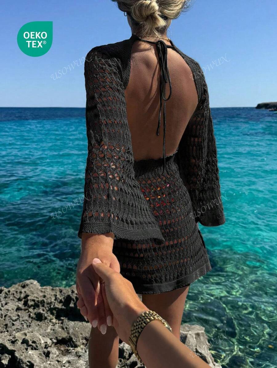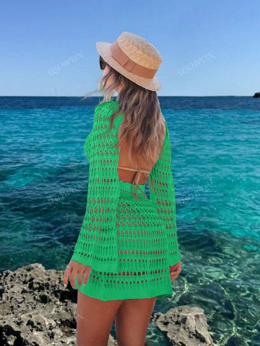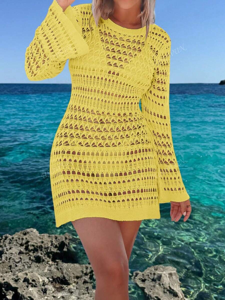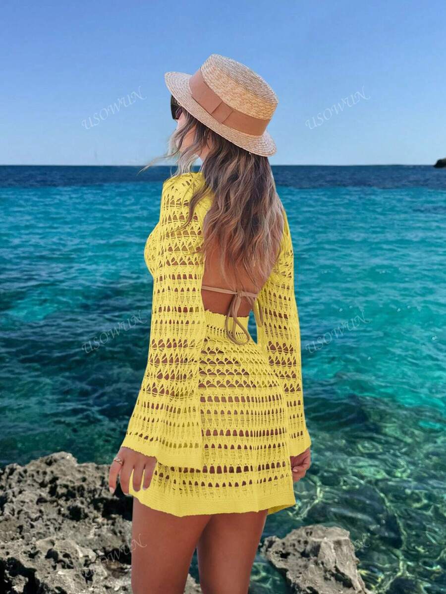 Vestido crochet de manga larga con espalda descubierta, estilo bohemio y sexy, para uso como cubrecosturas en la playa, de color amarillo pollito para mujer, para primavera y verano