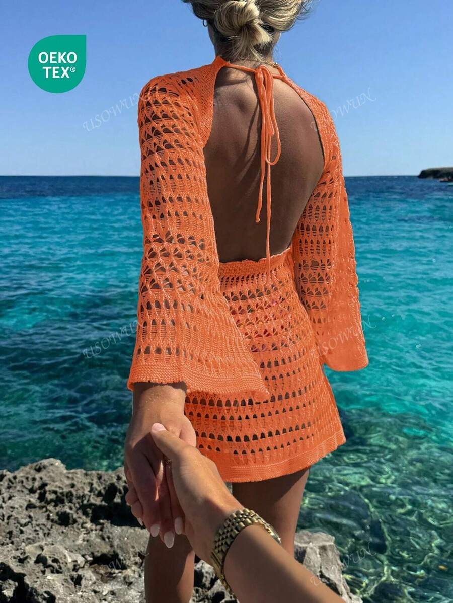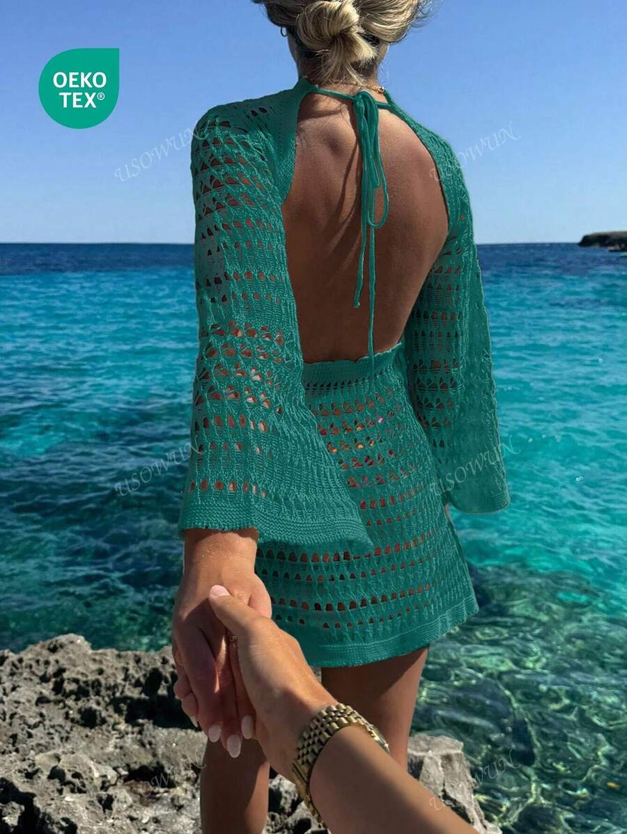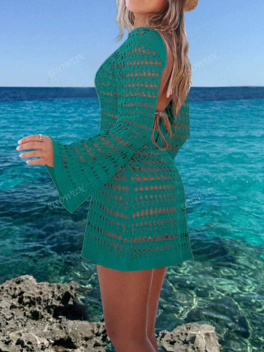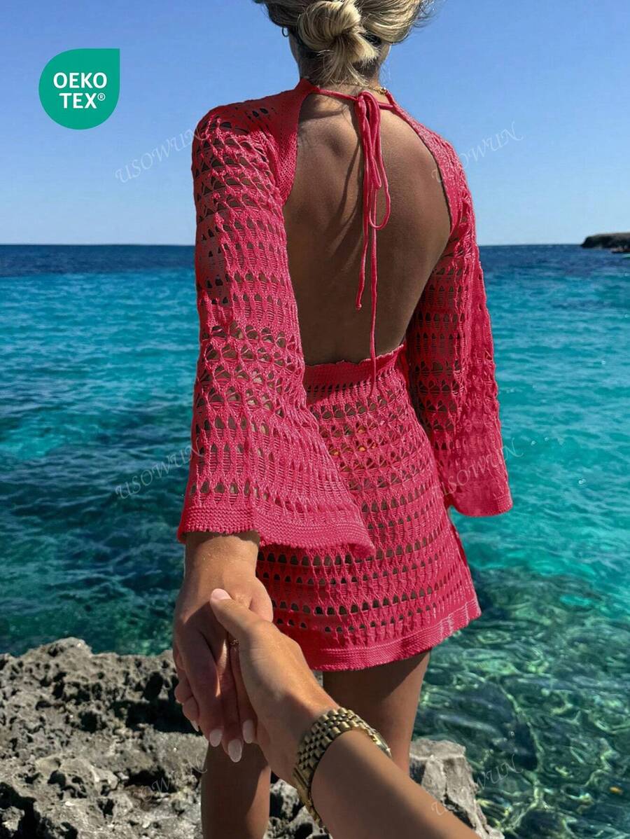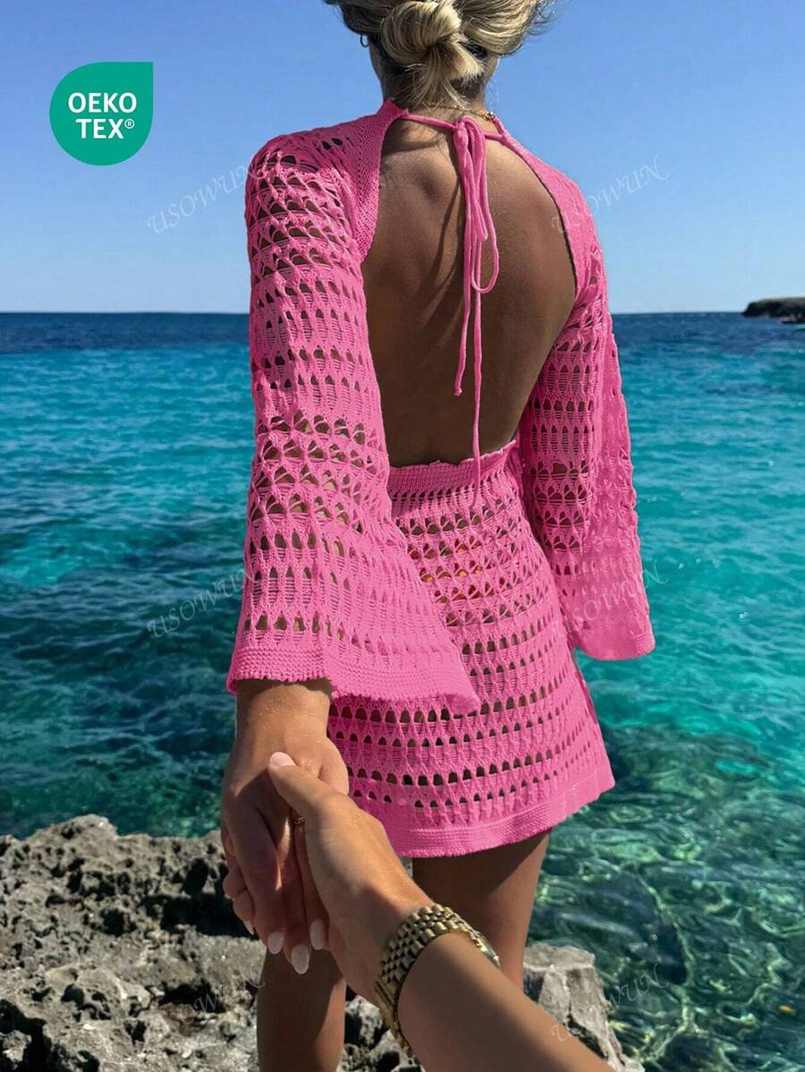 Vestido crochet de manga larga con espalda descubierta, estilo bohemio y sexy, para uso como cubrecosturas en la playa, de color amarillo pollito para mujer, para primavera y verano