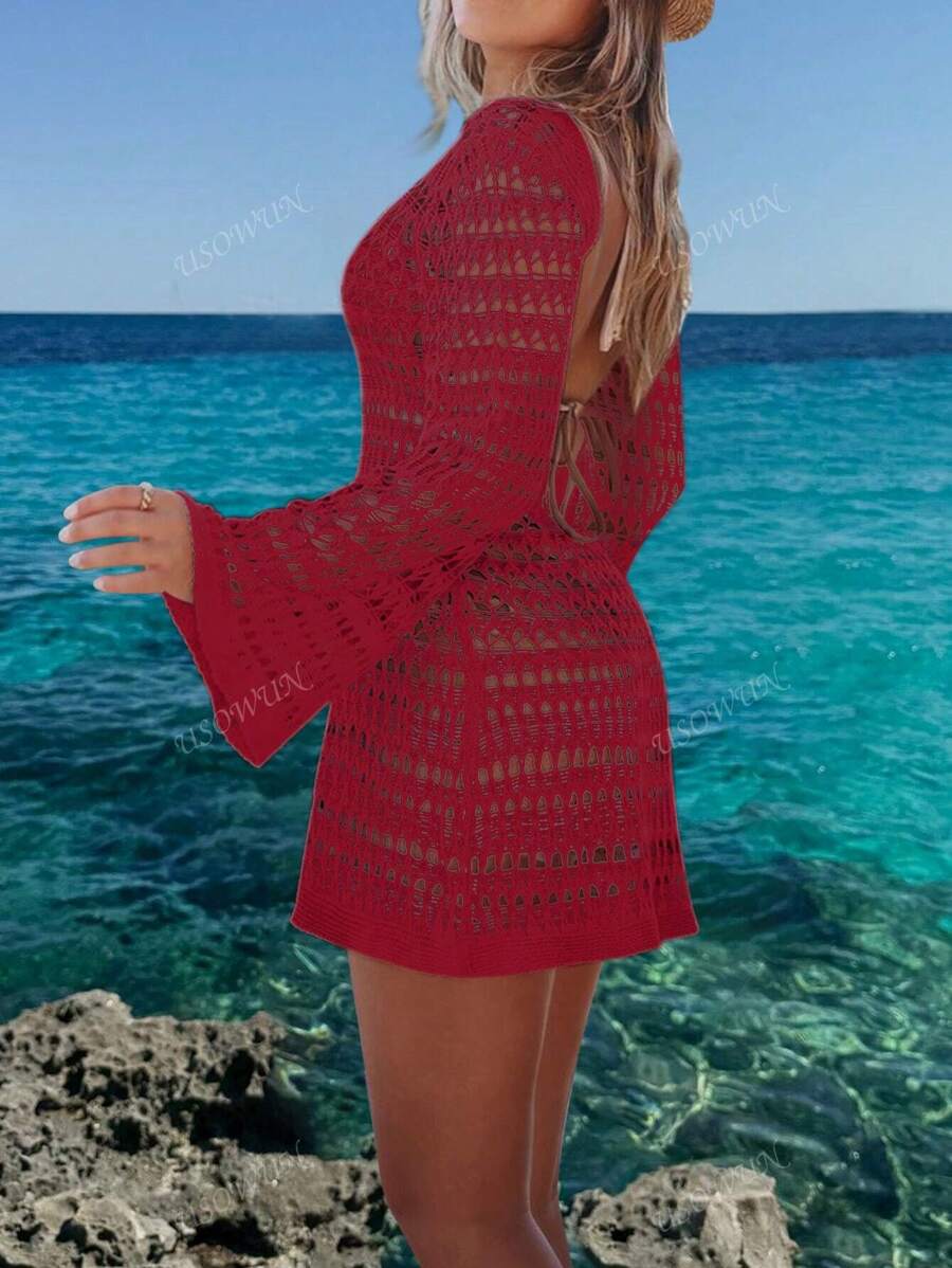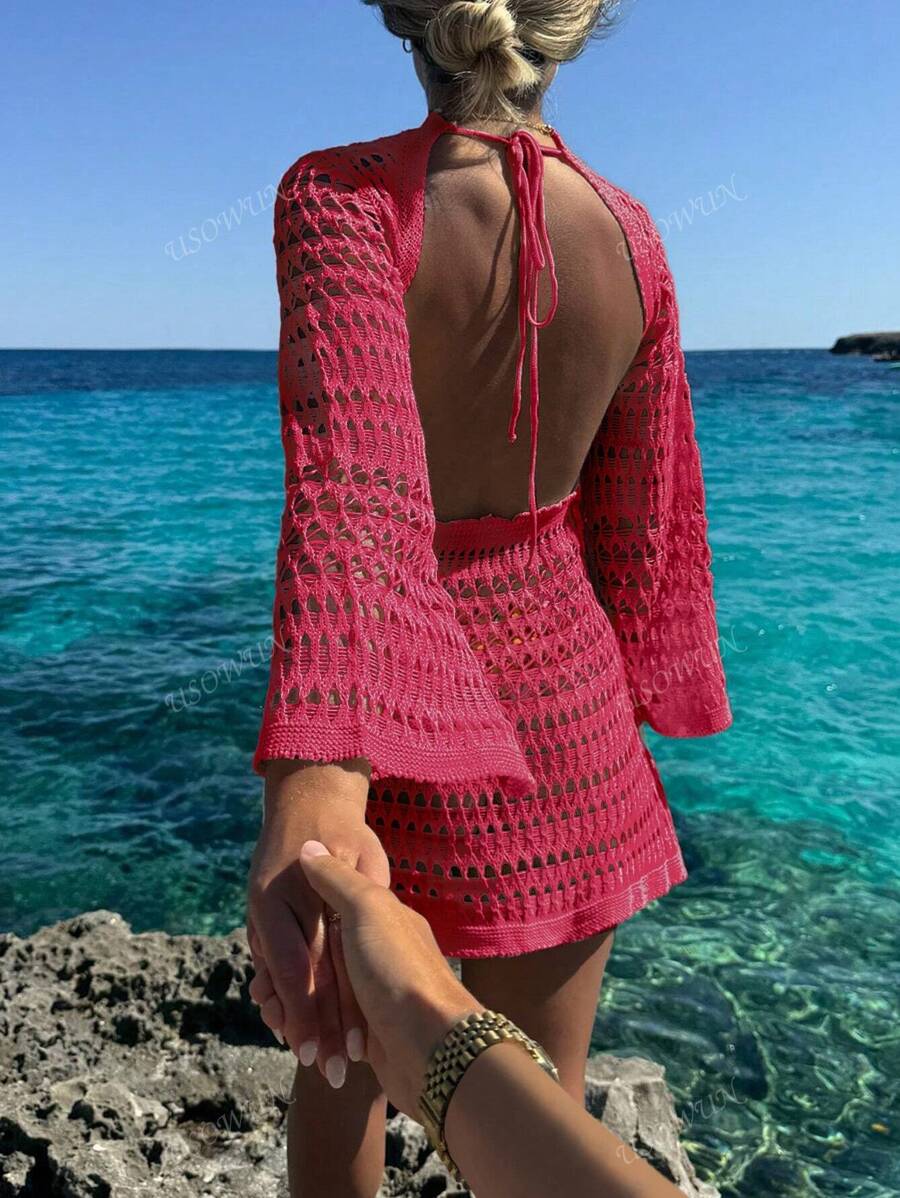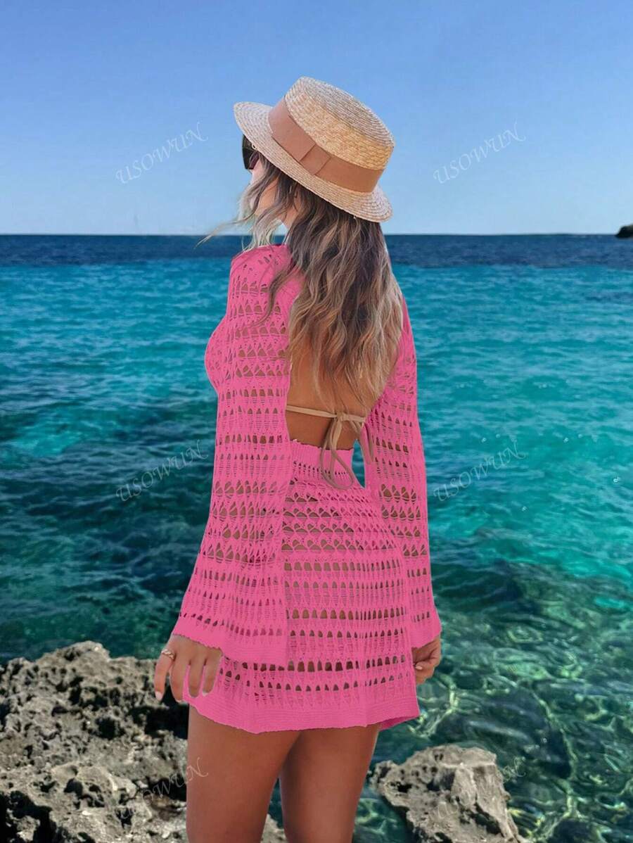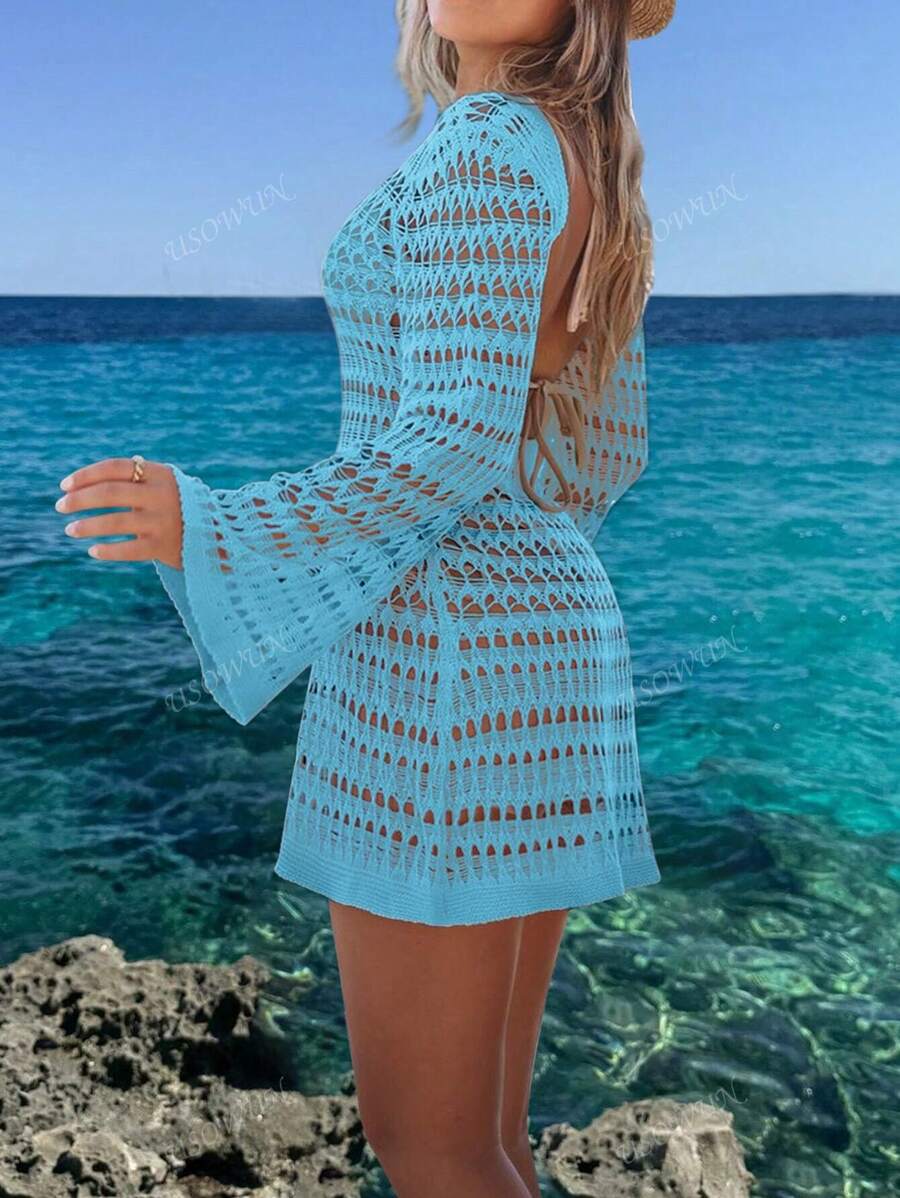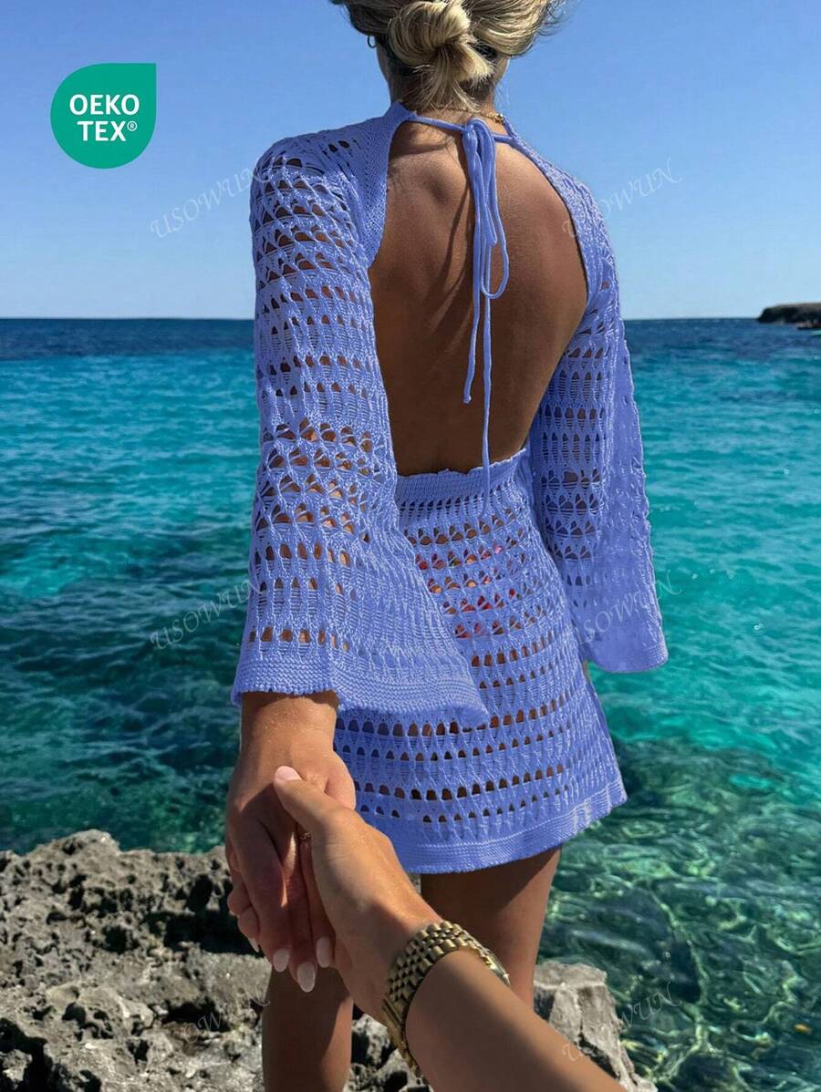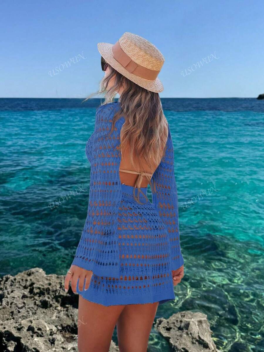 Vestido crochet de manga larga con espalda descubierta, estilo bohemio y sexy, para uso como cubrecosturas en la playa, de color amarillo pollito para mujer, para primavera y verano