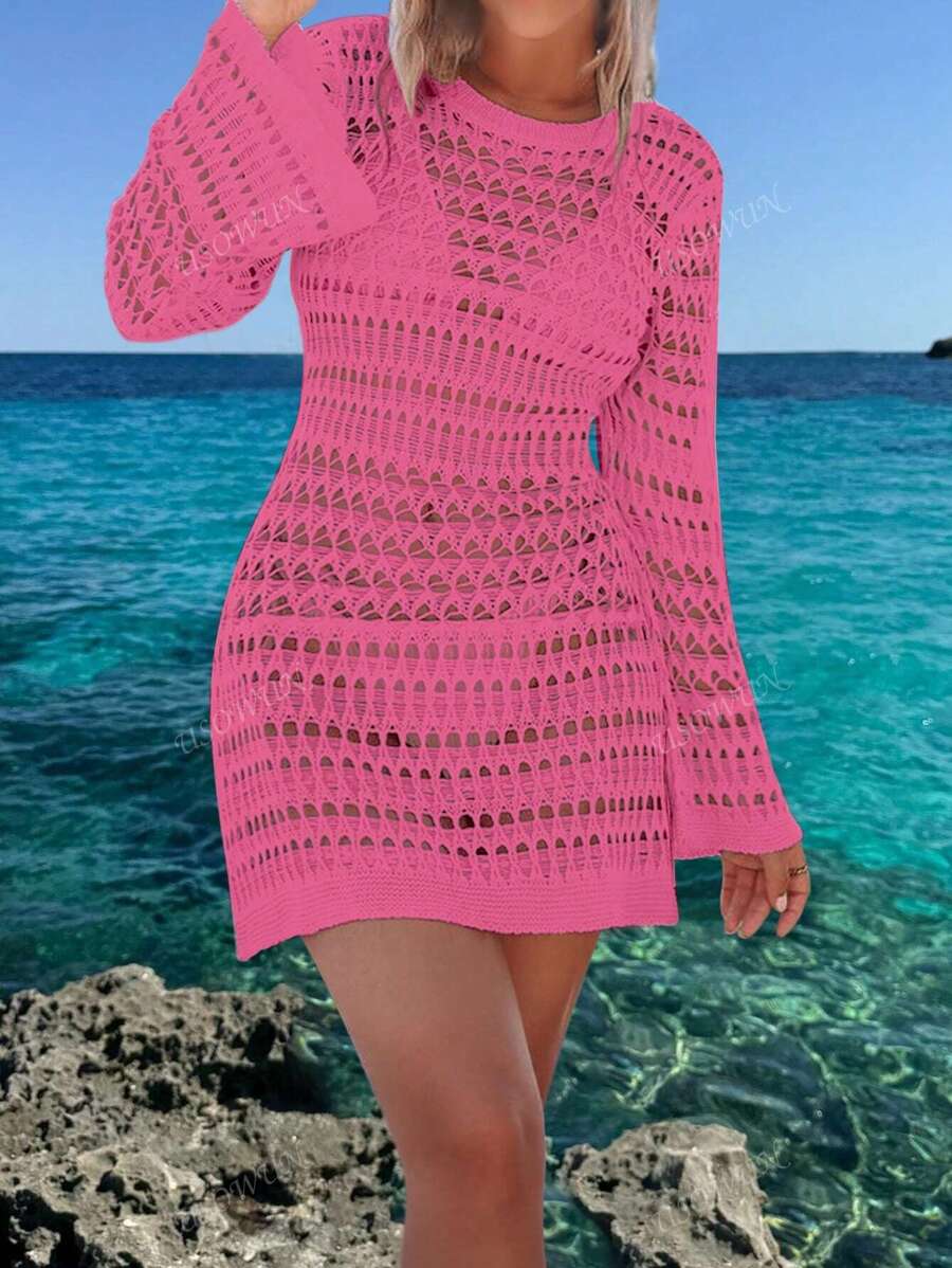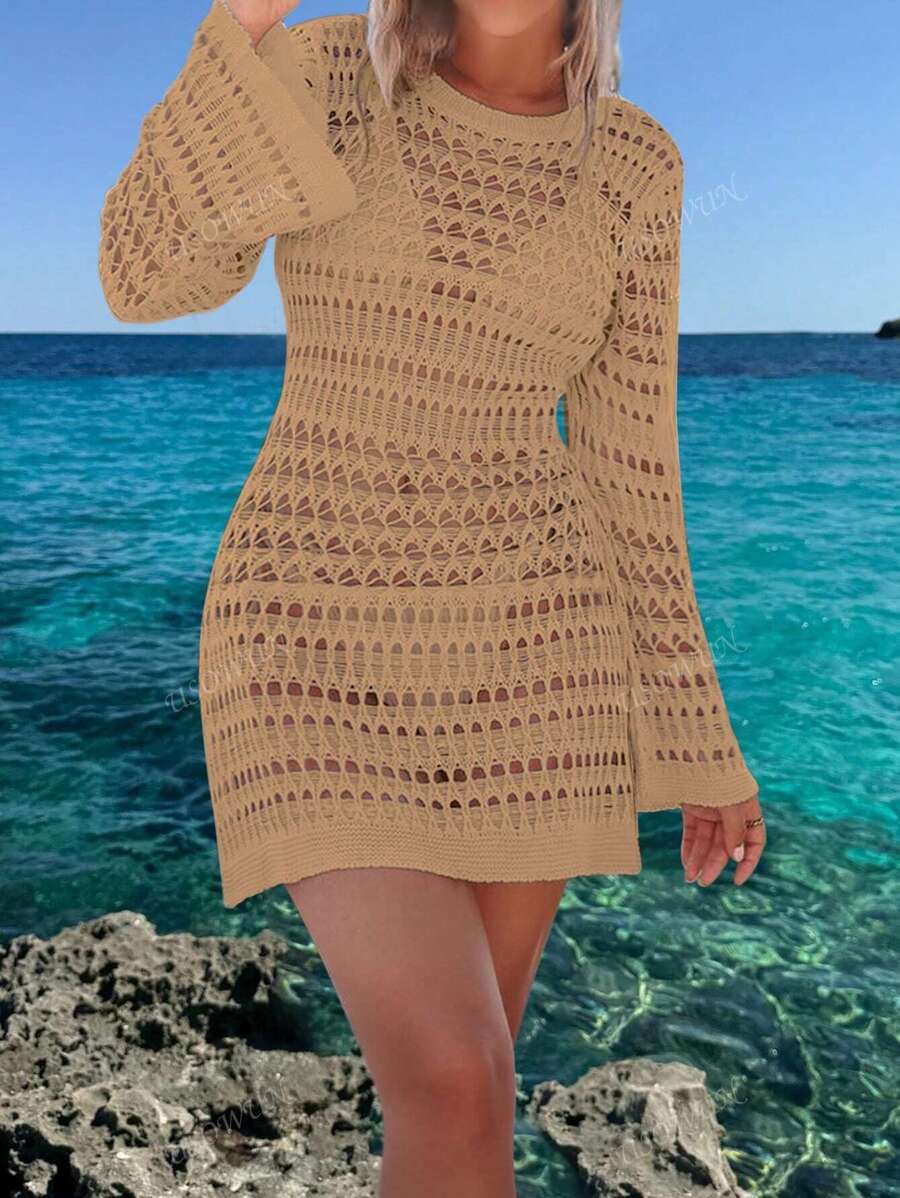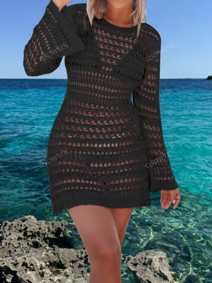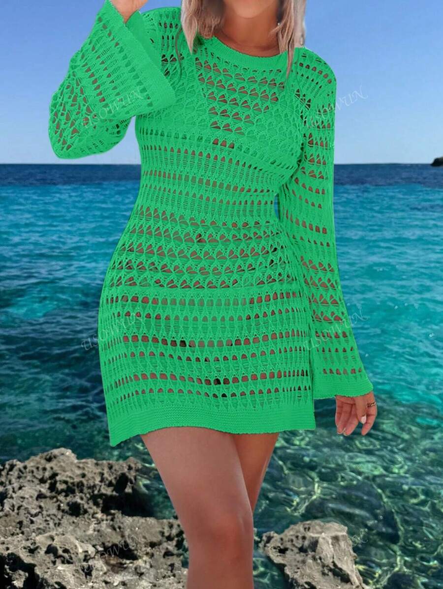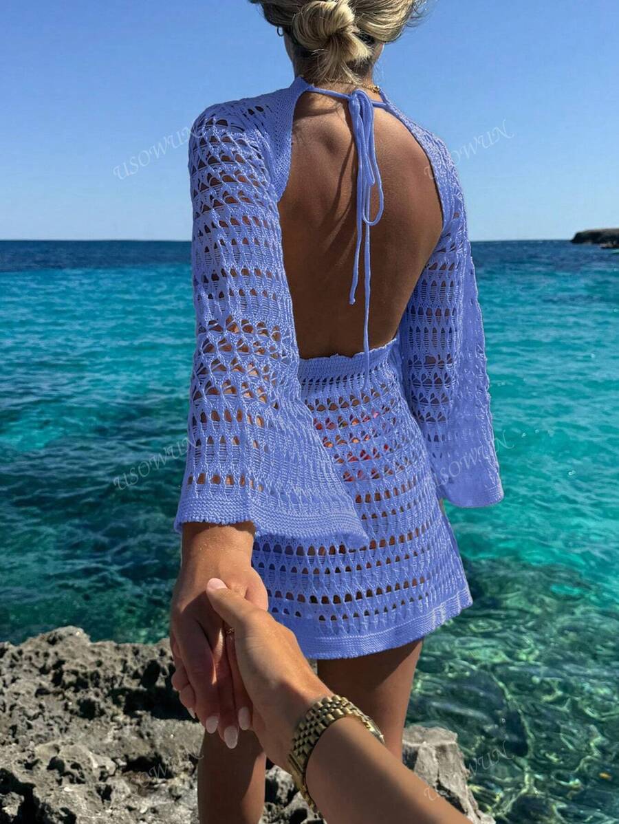 Vestido crochet de manga larga con espalda descubierta, estilo bohemio y sexy, para uso como cubrecosturas en la playa, de color amarillo pollito para mujer, para primavera y verano