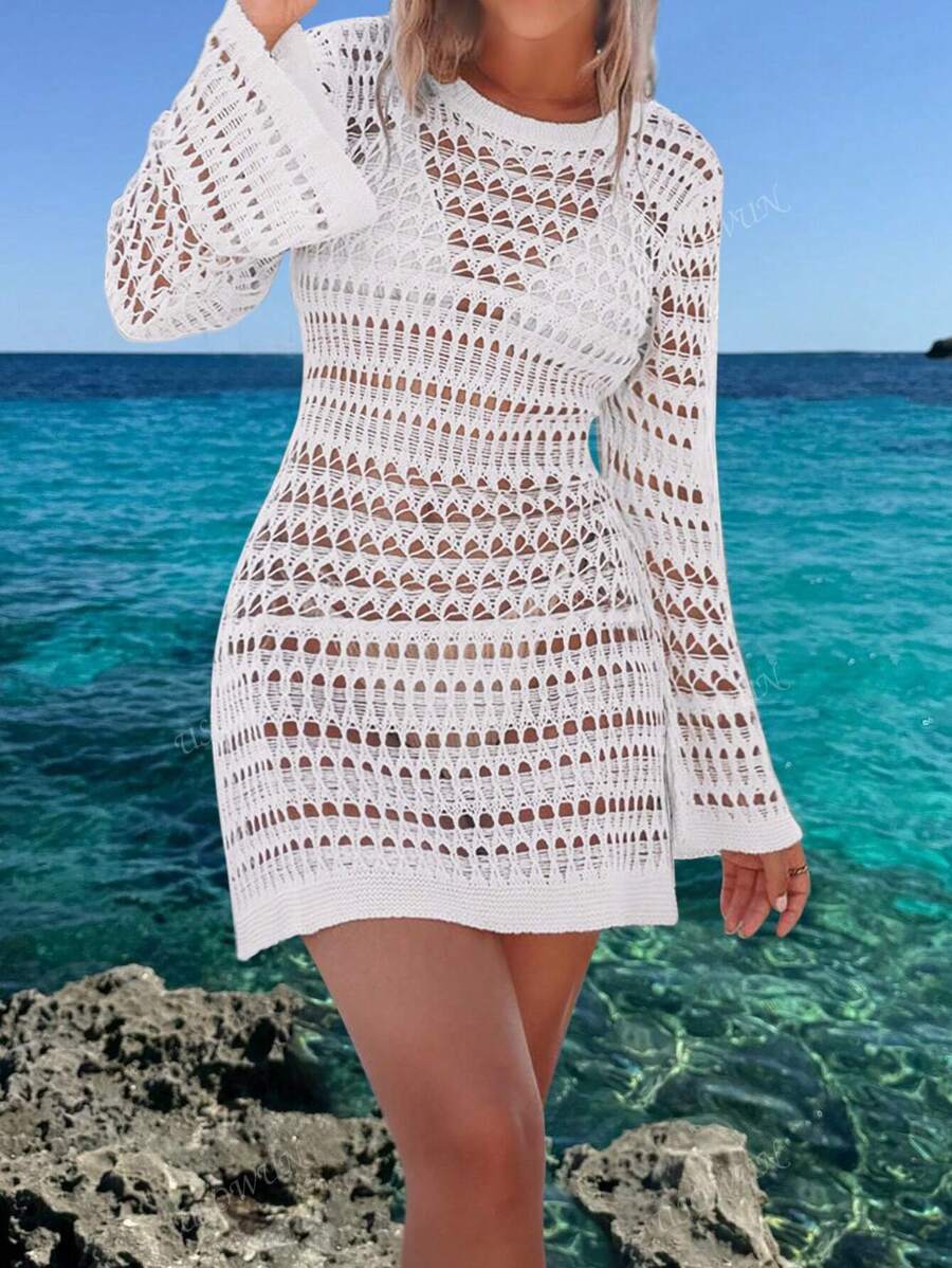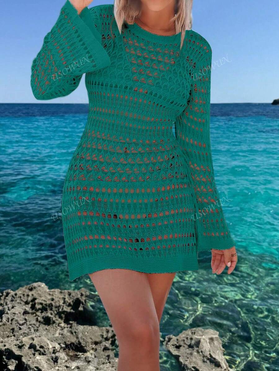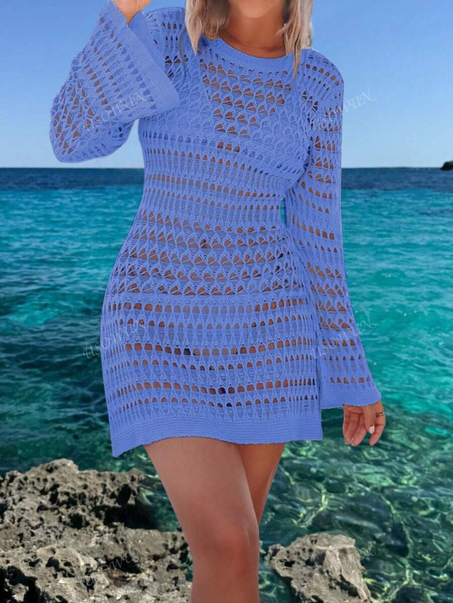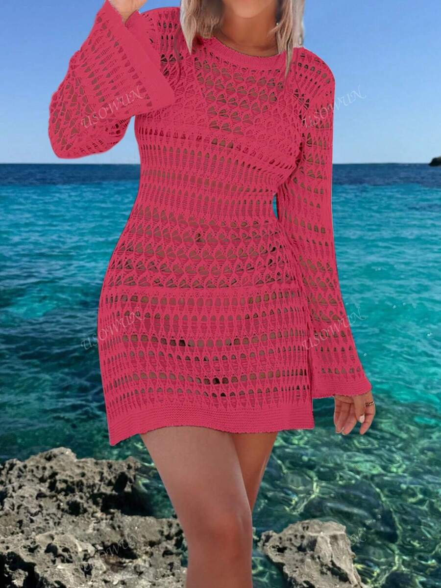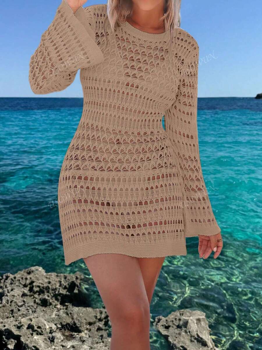 Vestido crochet de manga larga con espalda descubierta, estilo bohemio y sexy, para uso como cubrecosturas en la playa, de color amarillo pollito para mujer, para primavera y verano