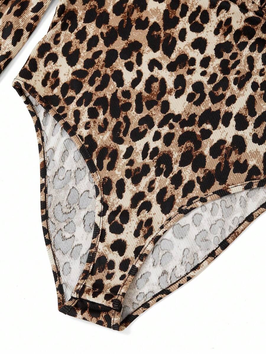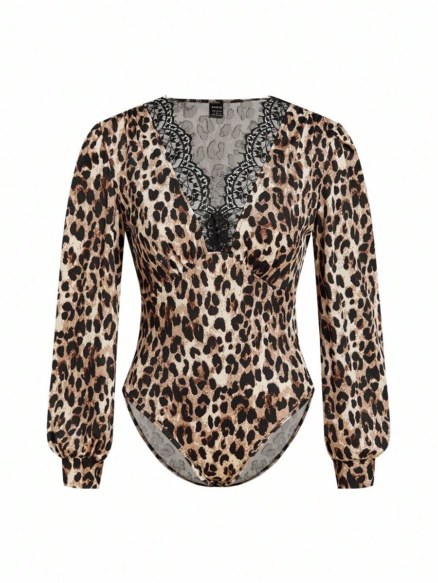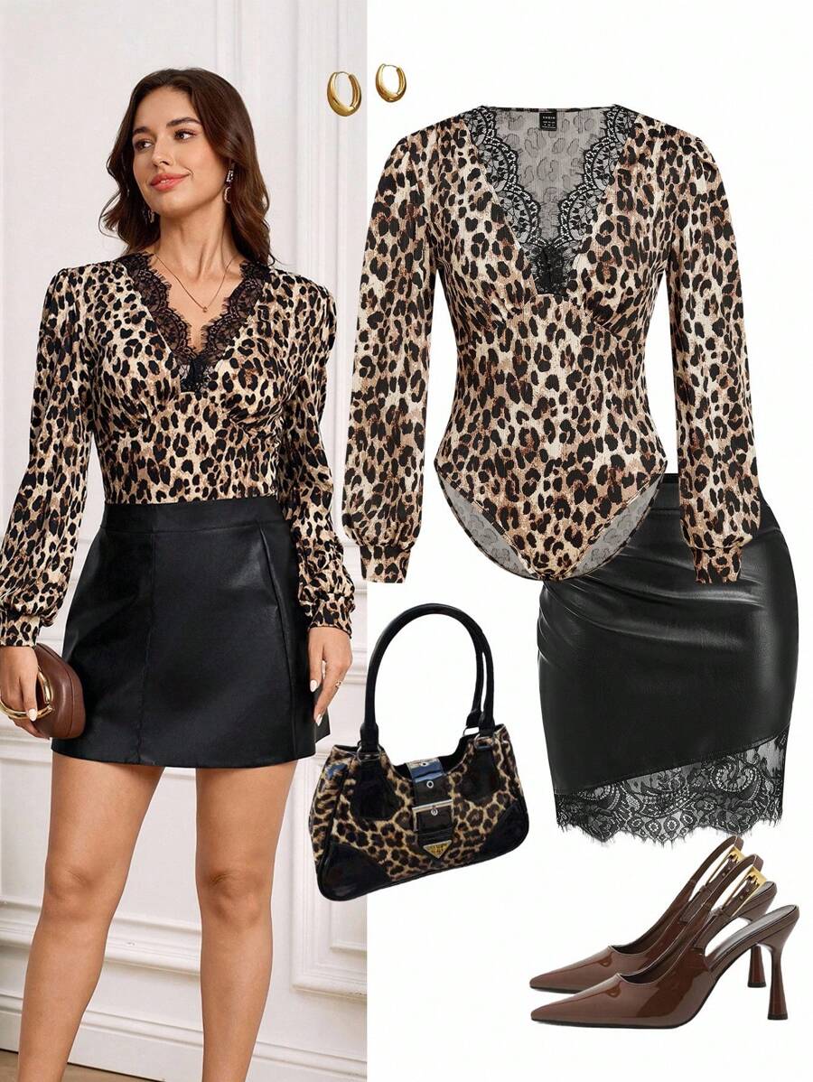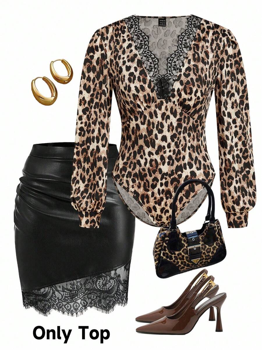 Amorya body de manga larga con cuello en v y estampado de leopardo con encaje para mujer, ropa de mujer para otono, atuendos de vacaciones, body negro con top de encaje