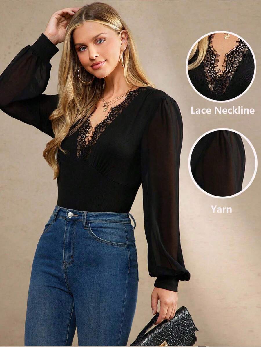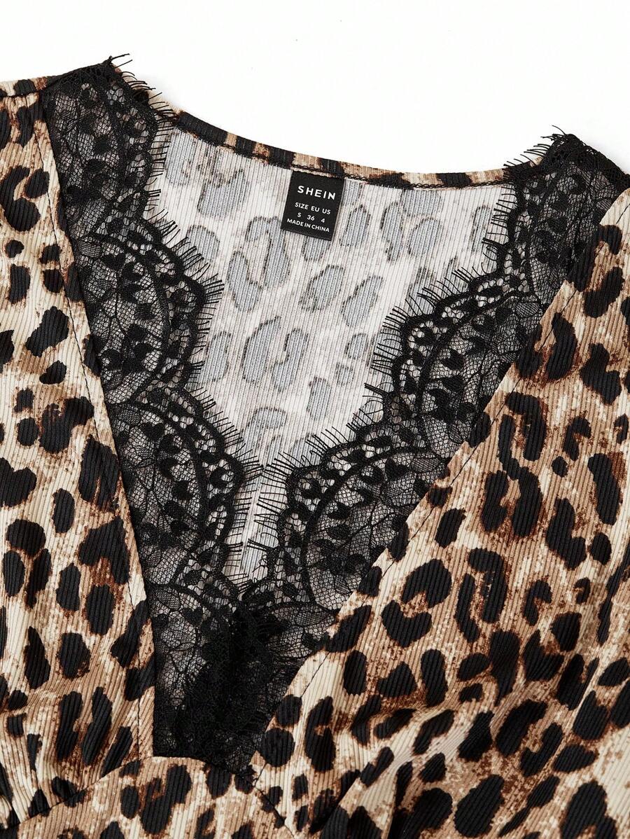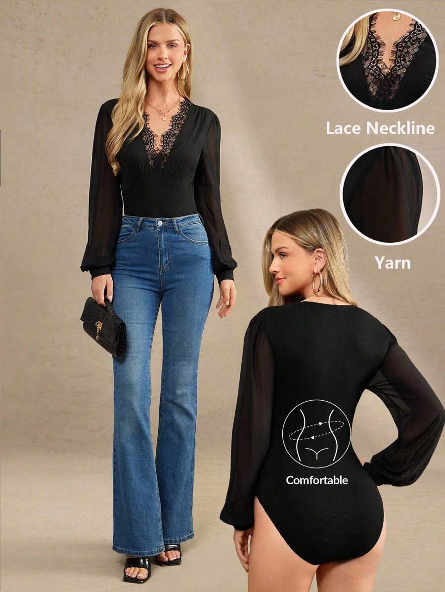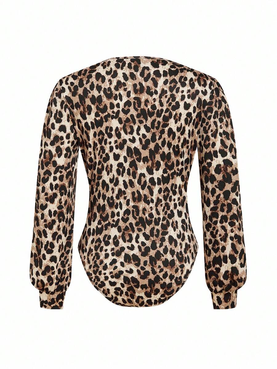 Amorya body de manga larga con cuello en v y estampado de leopardo con encaje para mujer, ropa de mujer para otono, atuendos de vacaciones, body negro con top de encaje