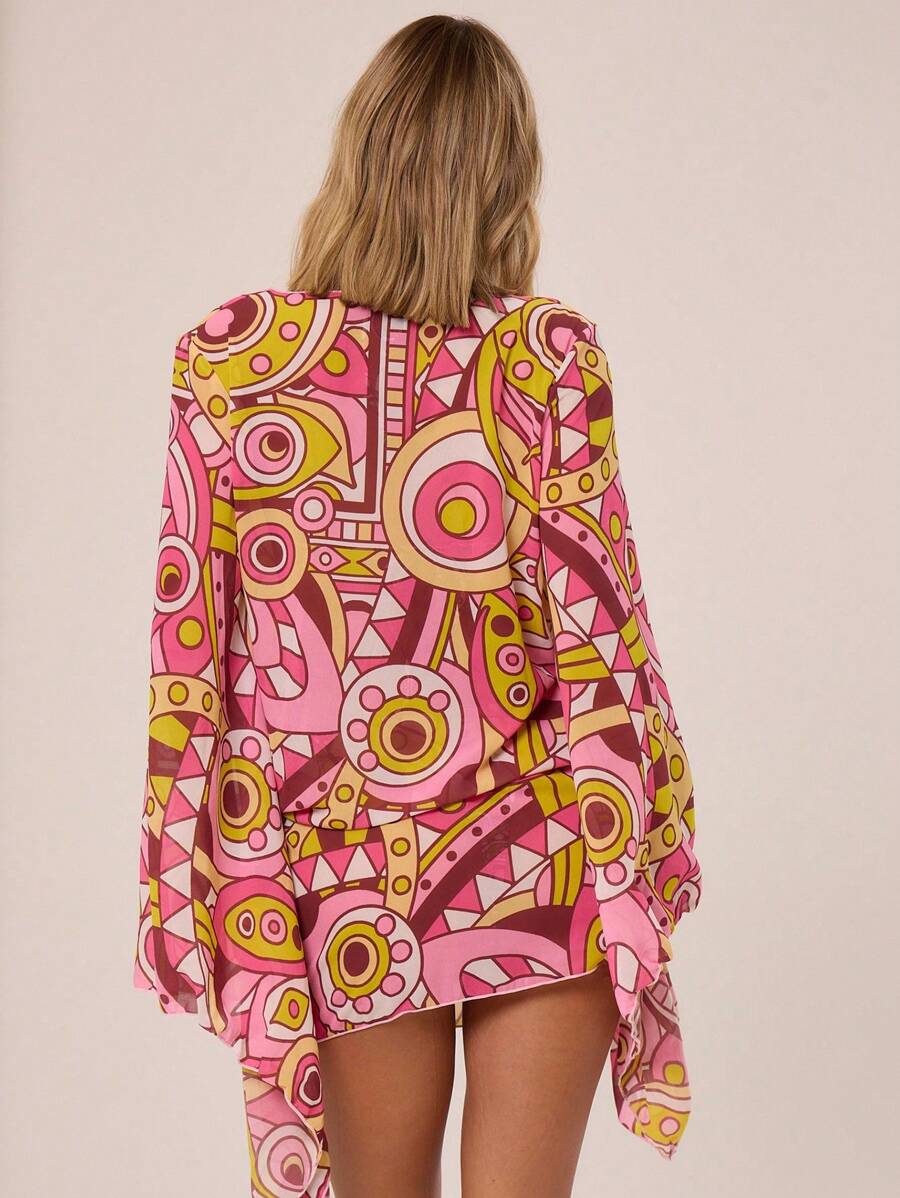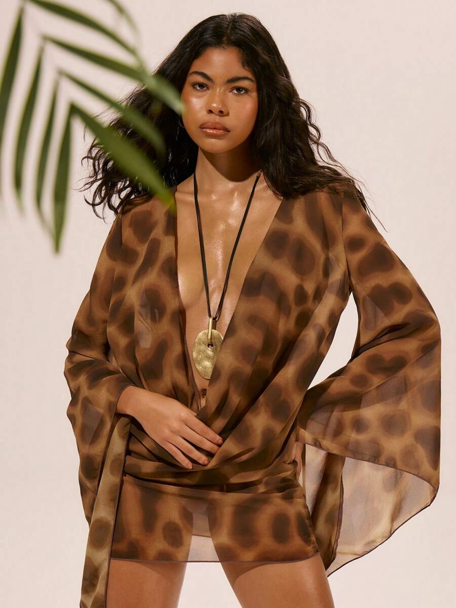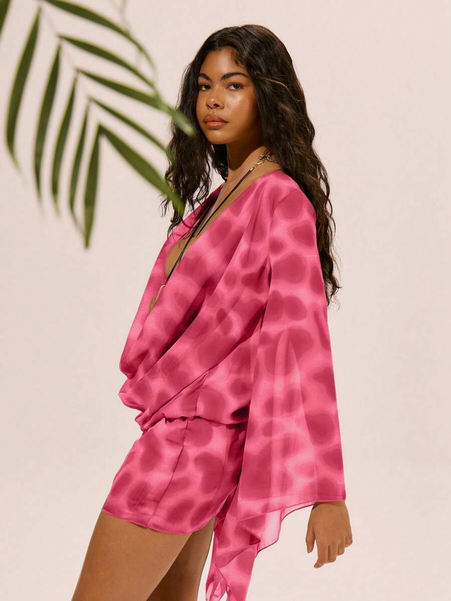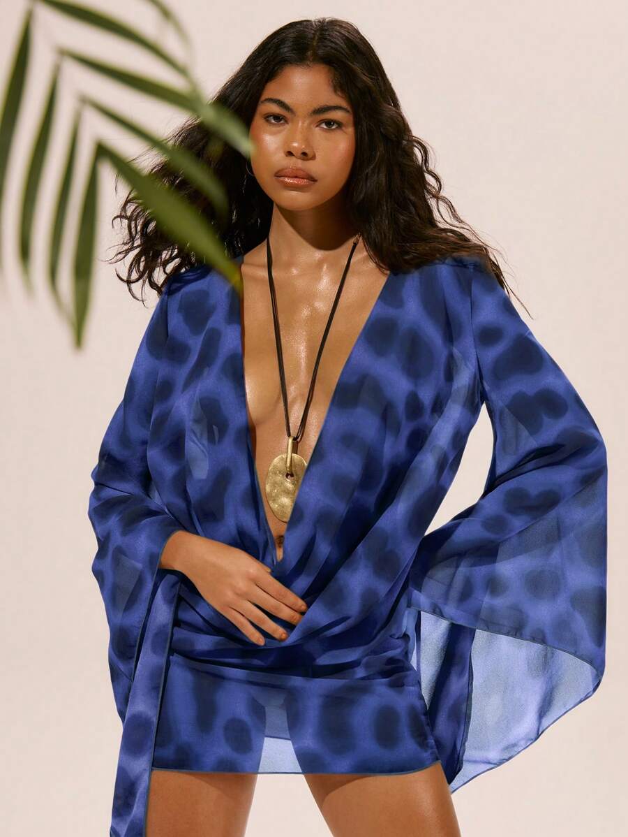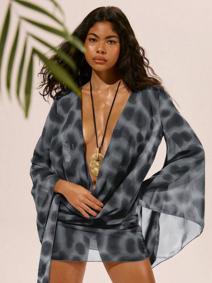 Vestido minifalda con cuello en pico de gasa y malla de manga larga, para cubrir, ideal para primavera, verano, ibiza, vacaciones, lindo, romantico, festival, ropa de playa