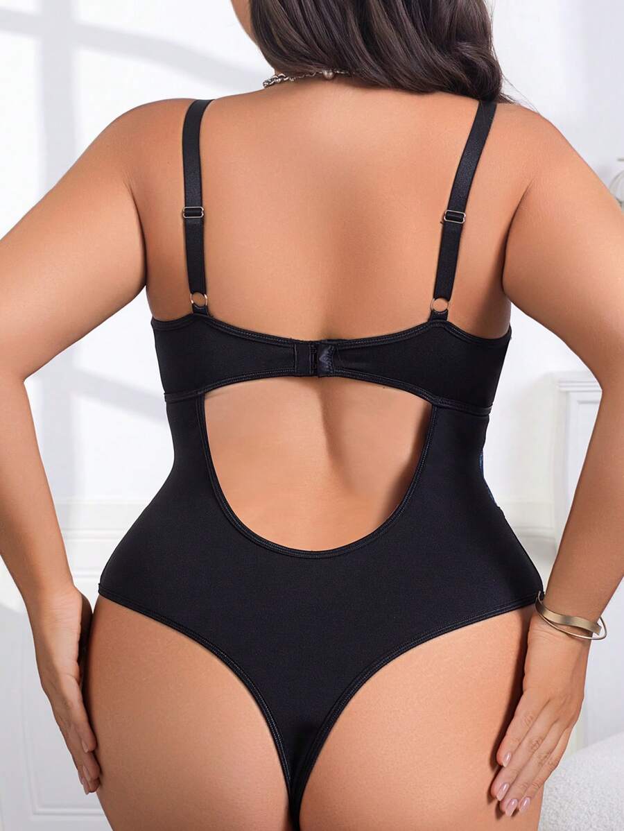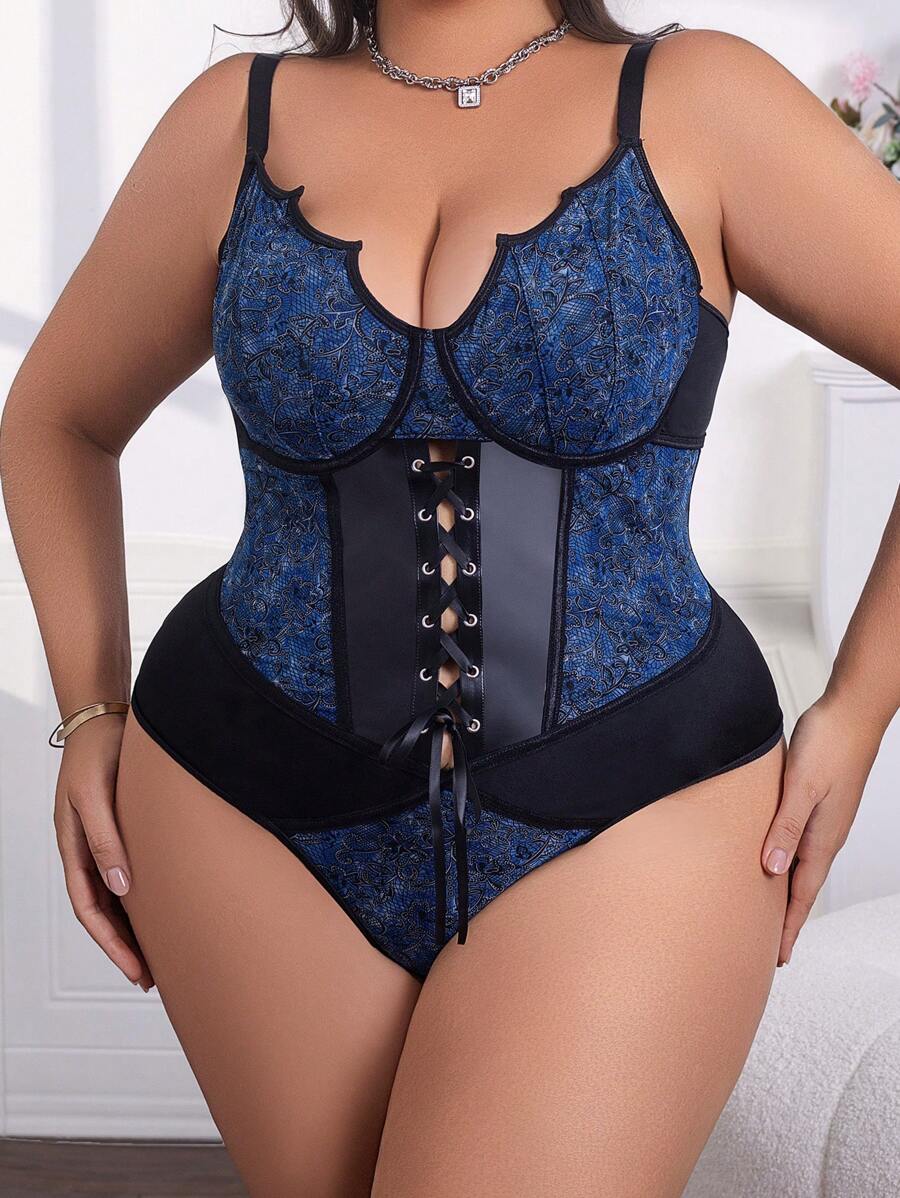 1 pieza body de talla grande con splicing de jacquard floral de pu, detalle de lazo, body sexy de espalda abierta para mujer, con boton a presion en la entrepierna, top corto de ajuste cenido versatil, apto para todas las estaciones