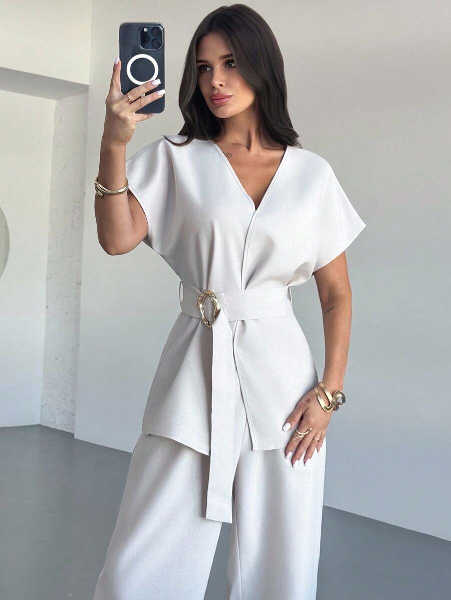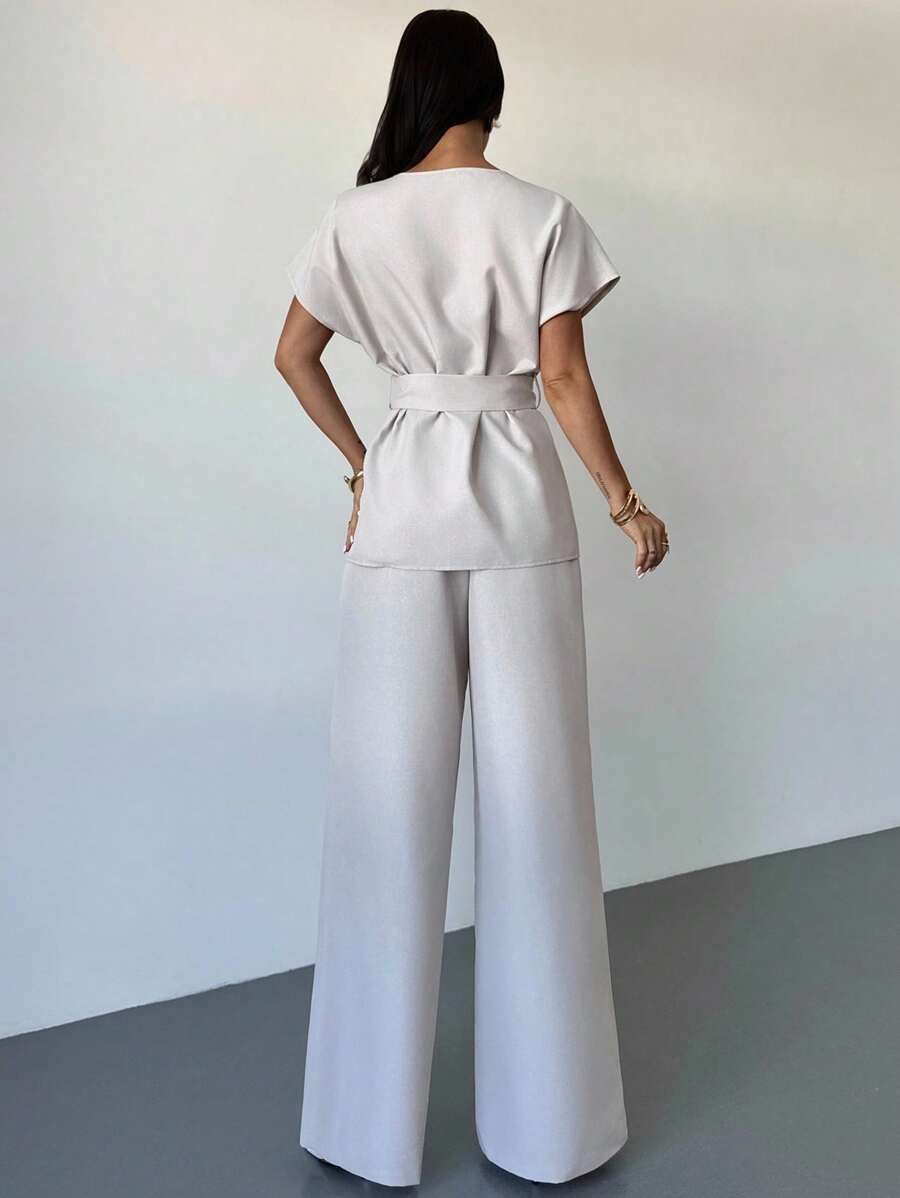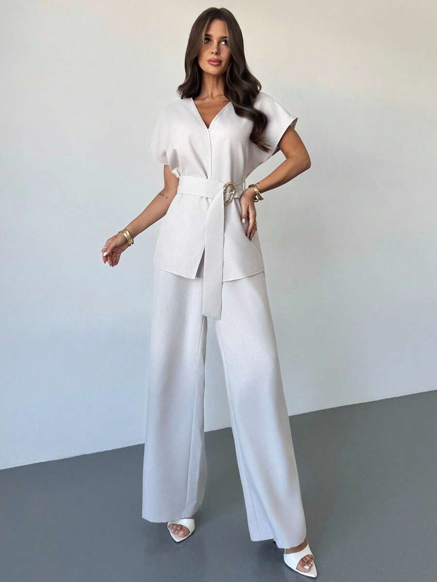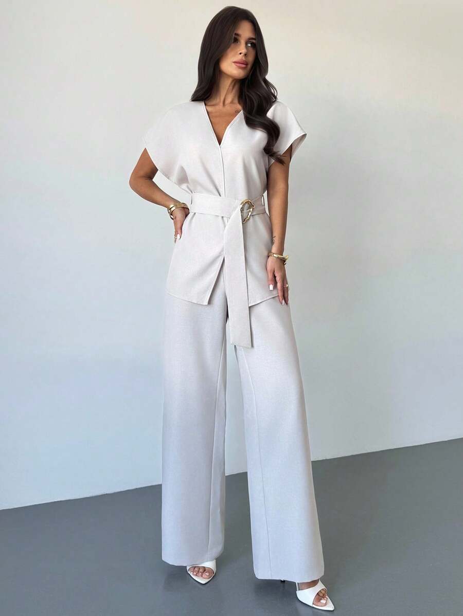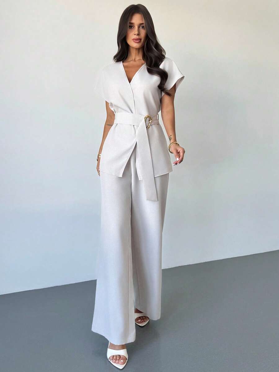 2 piezas conjunto informal de verano para mujer con pantalon de pierna ancha de cintura elastica con cordon y blusa sin mangas de cuello en v de lino de color