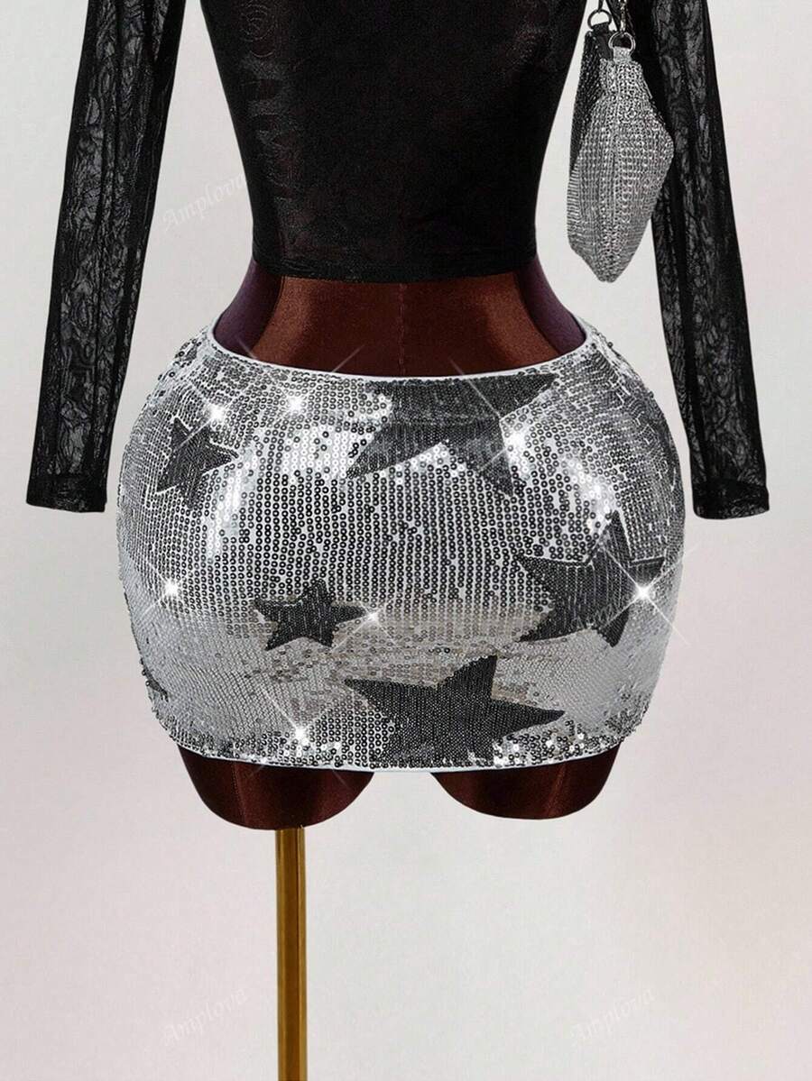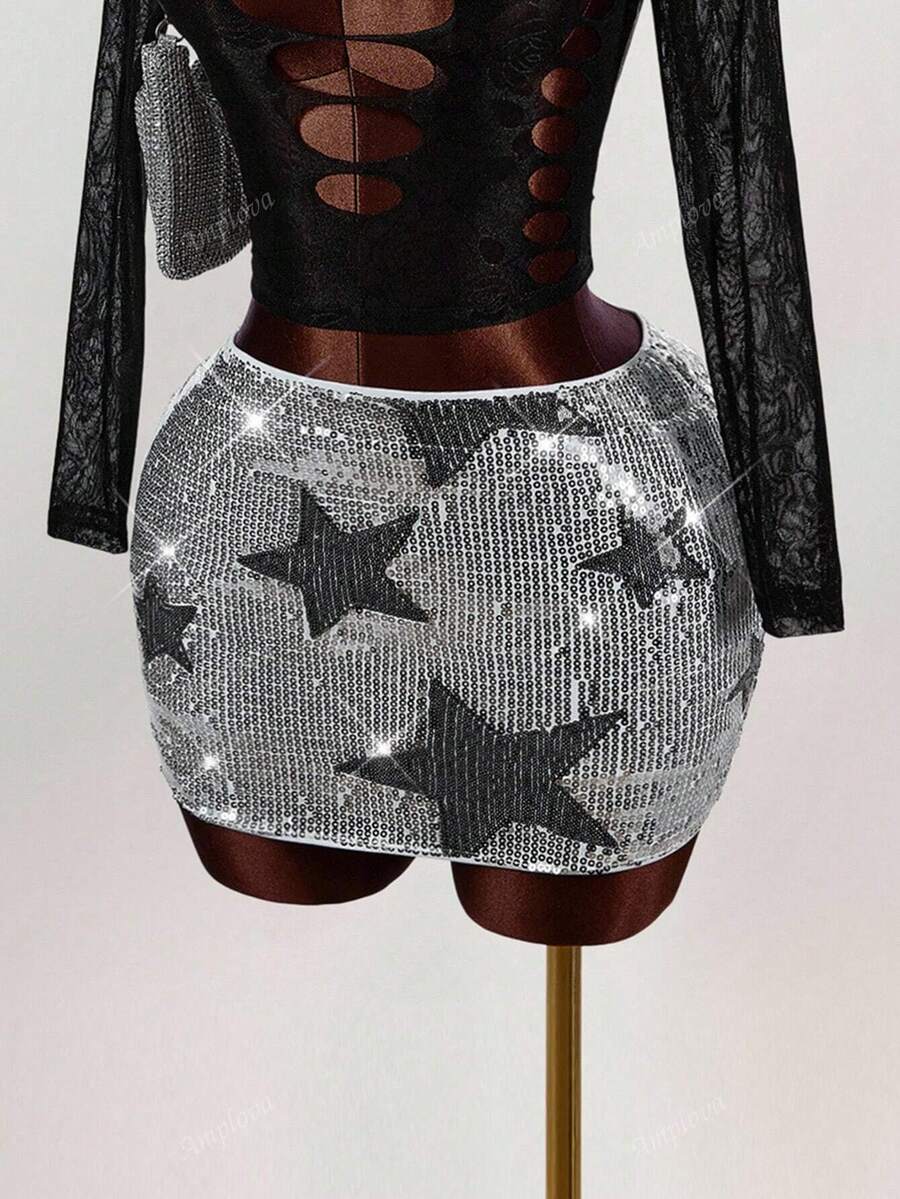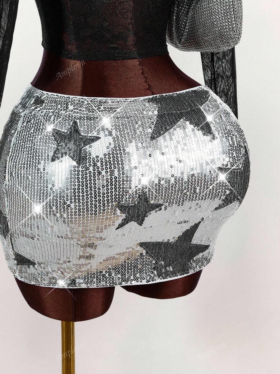 Amplova minifalda ajustada de tiro ultra bajo con estampado de estrellas y lentejuelas