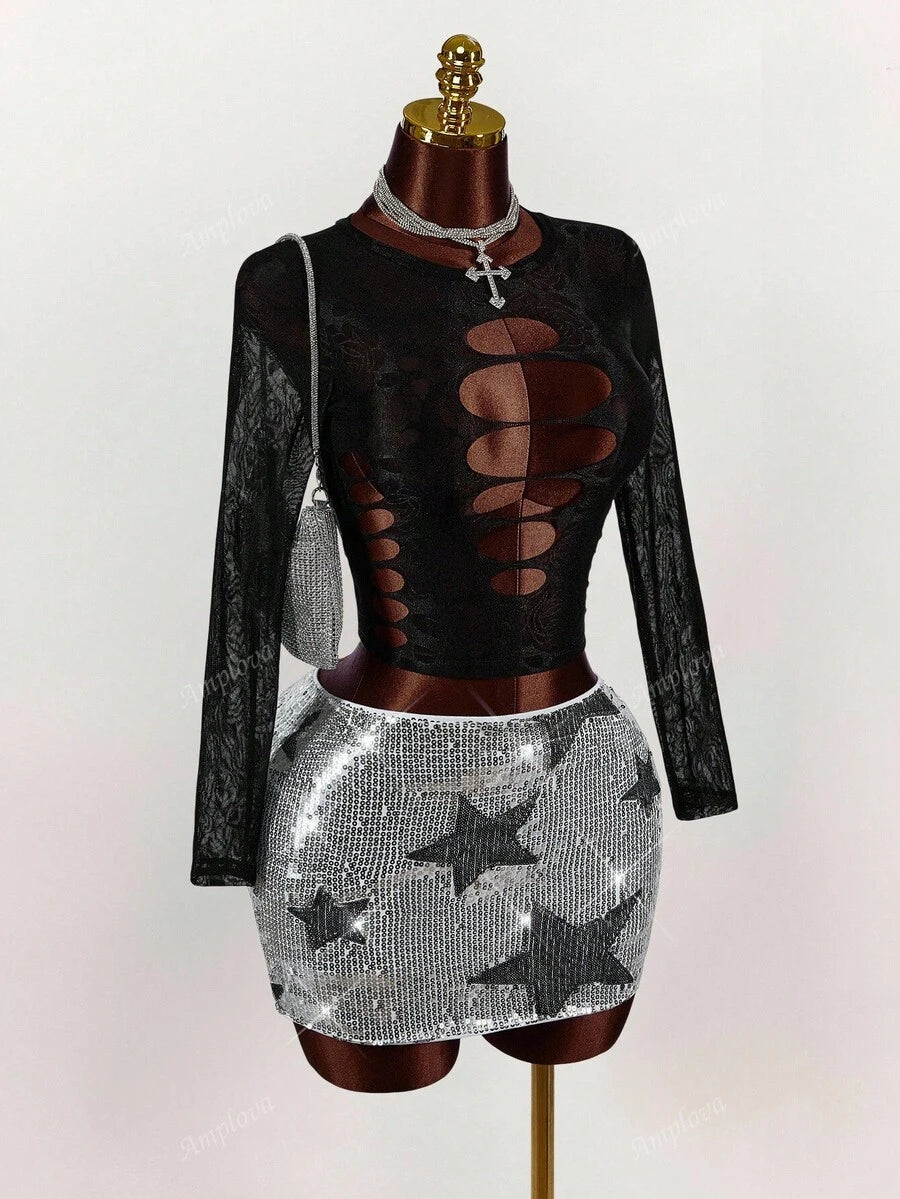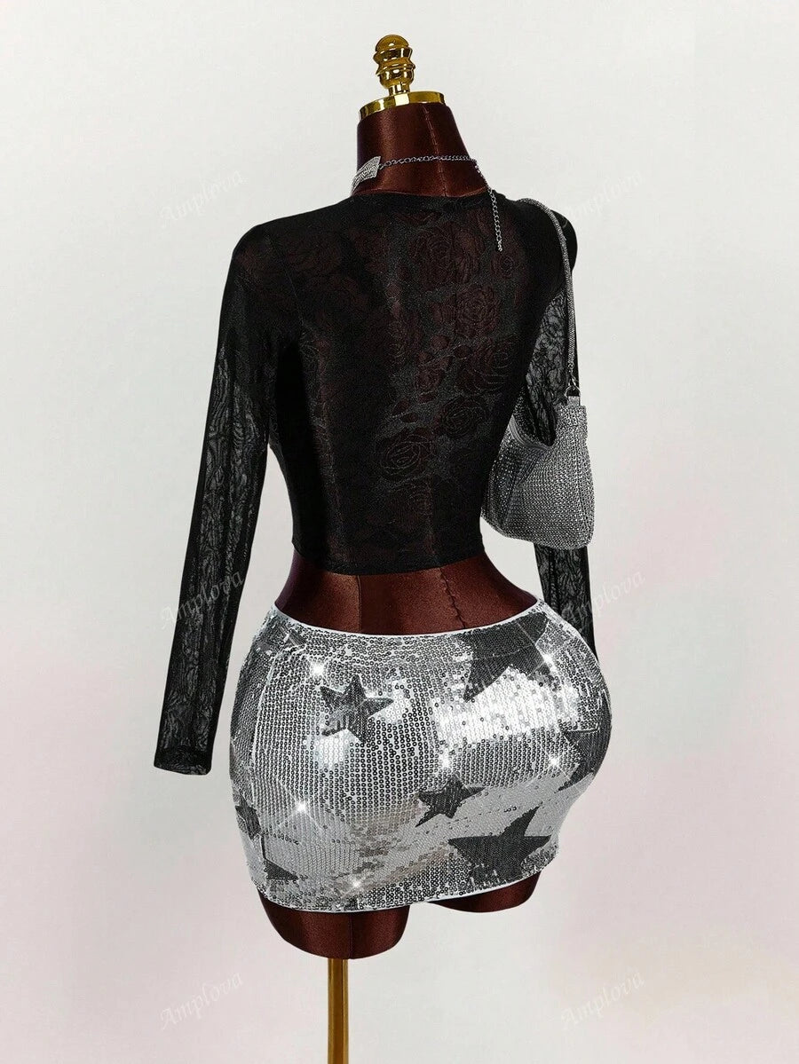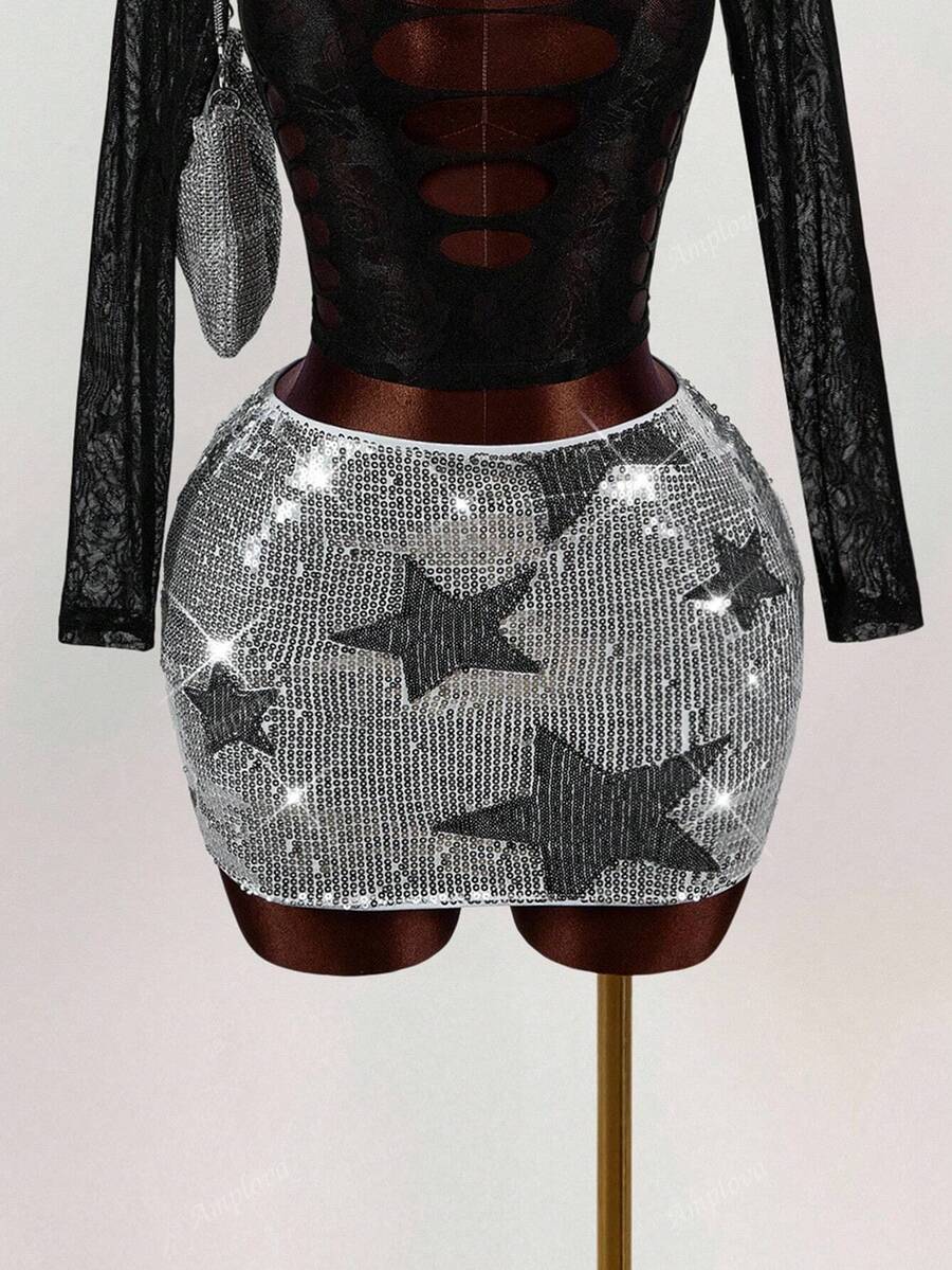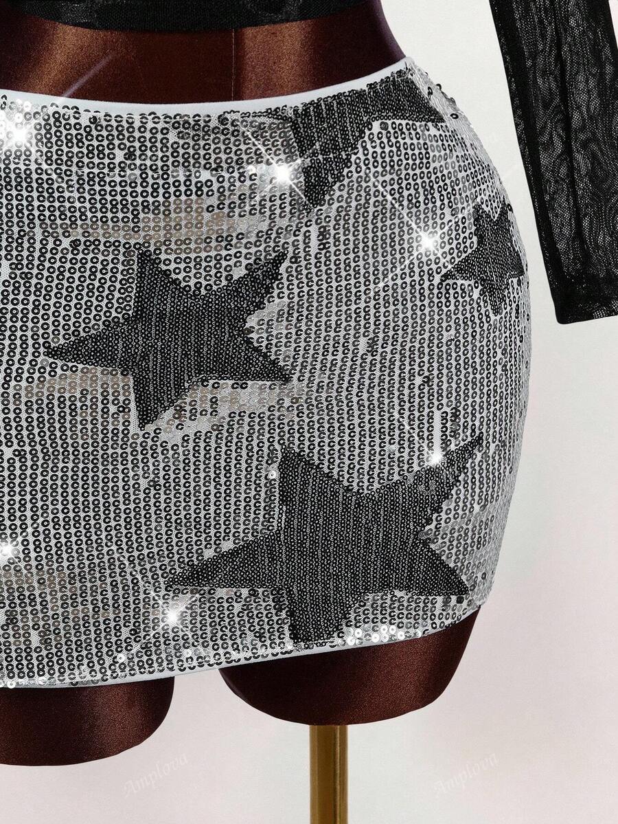 Amplova minifalda ajustada de tiro ultra bajo con estampado de estrellas y lentejuelas