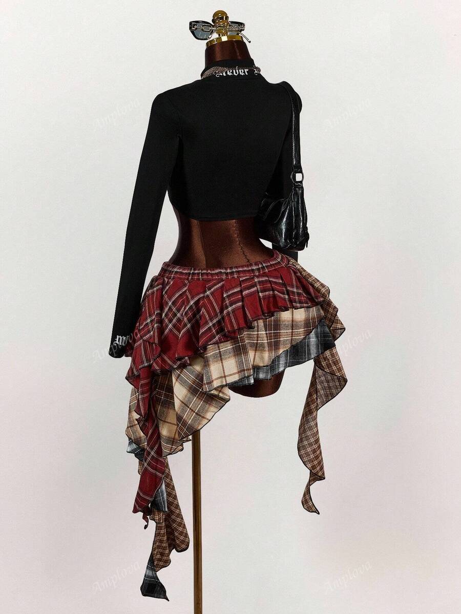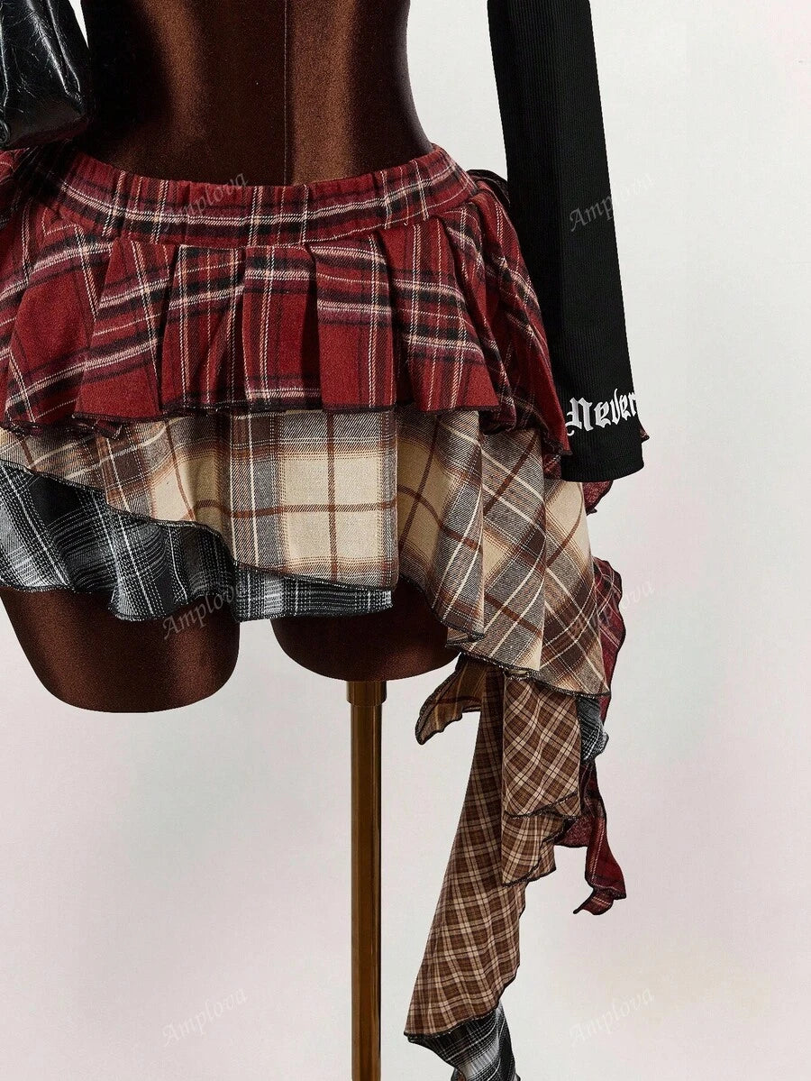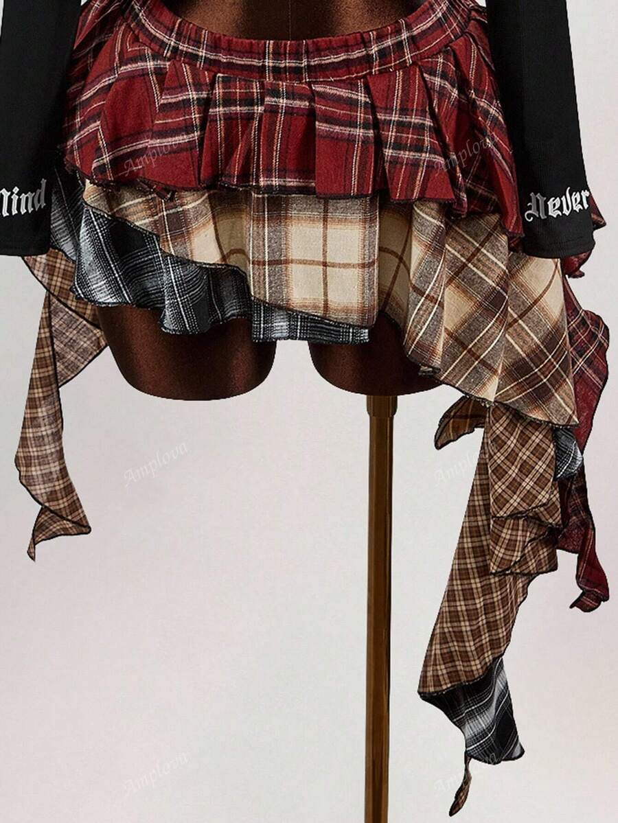 Amplova minifalda asimetrica con volantes y estampado de cuadros mixtos