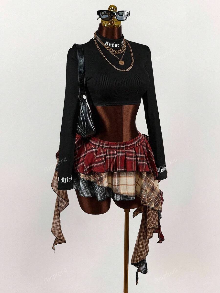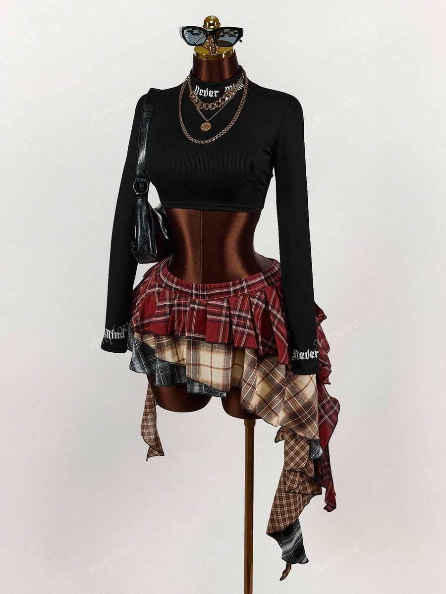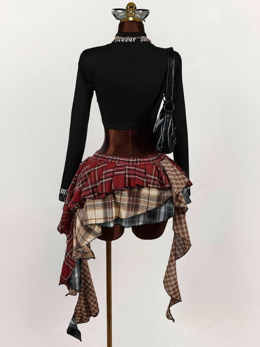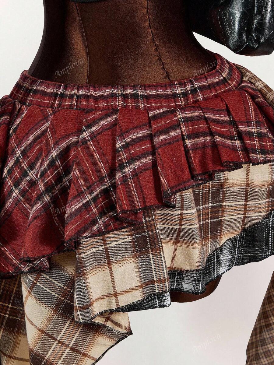 Amplova minifalda asimetrica con volantes y estampado de cuadros mixtos