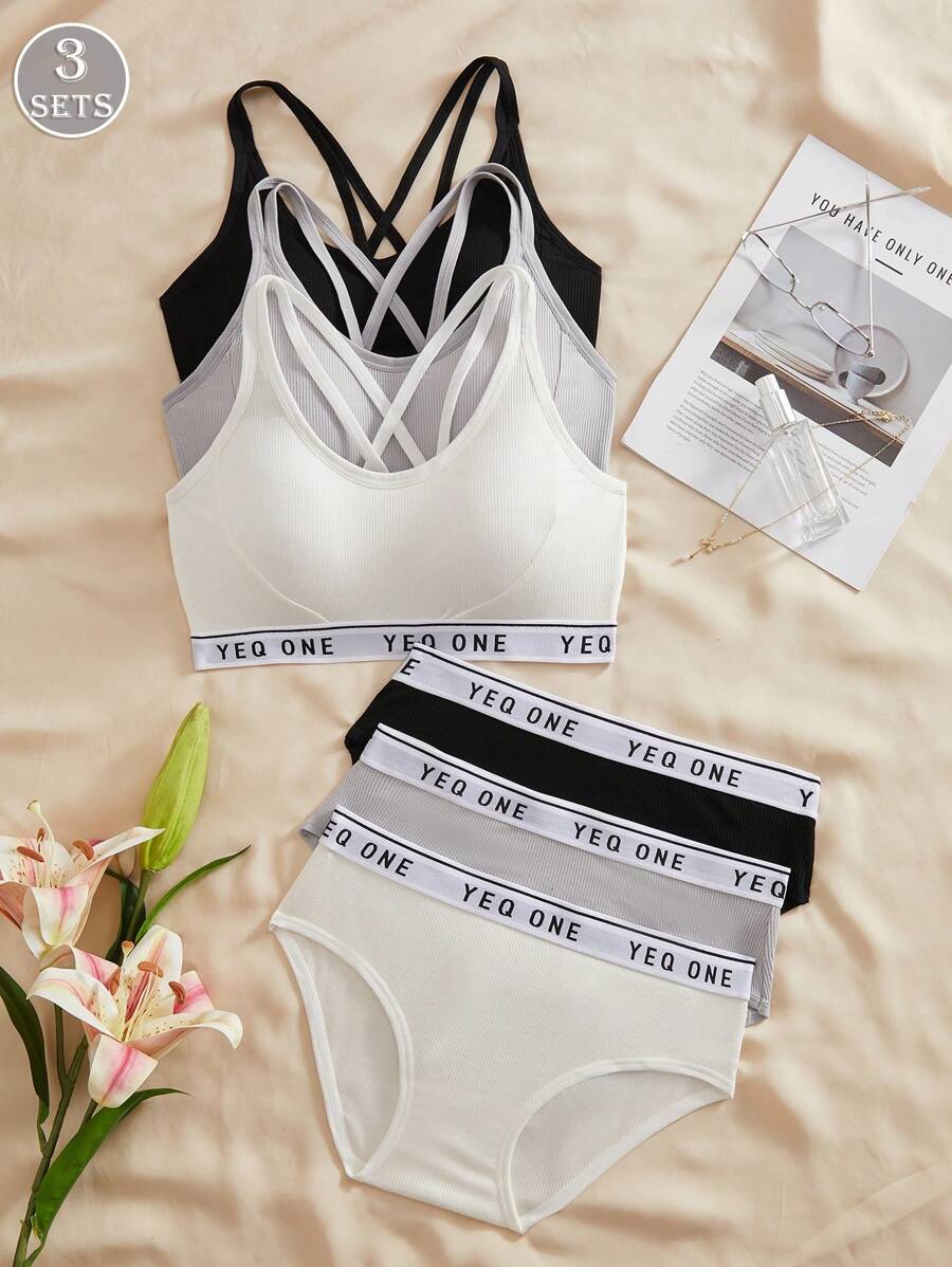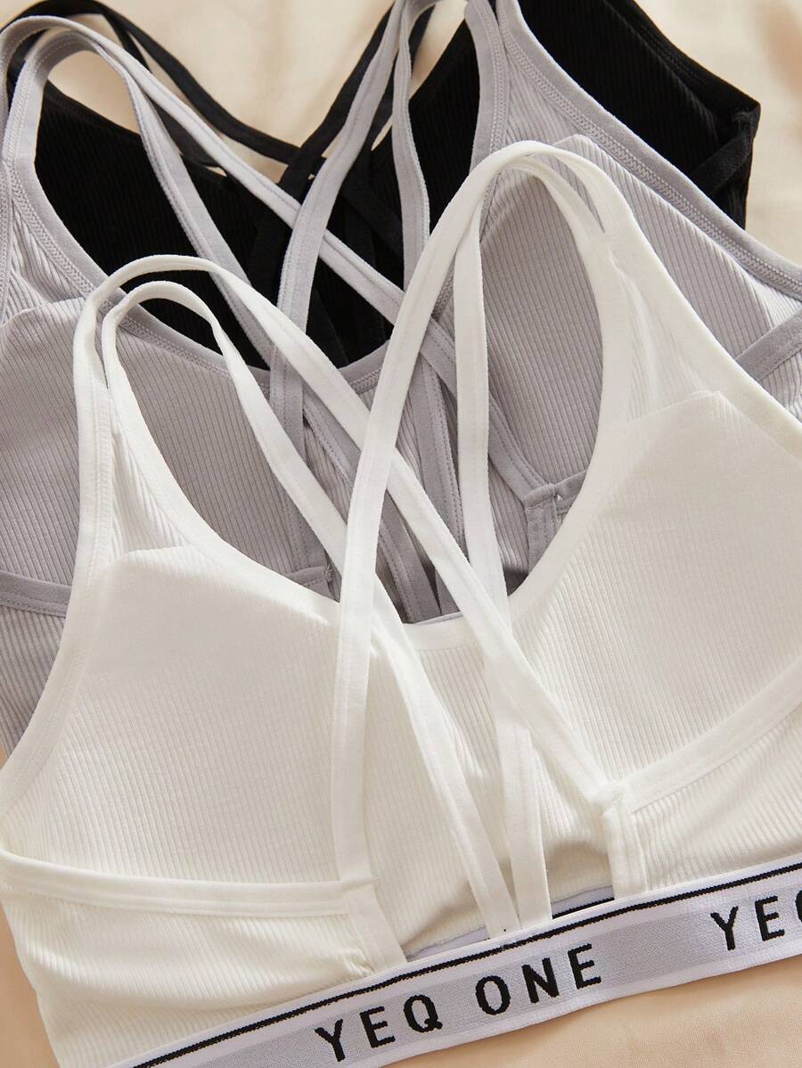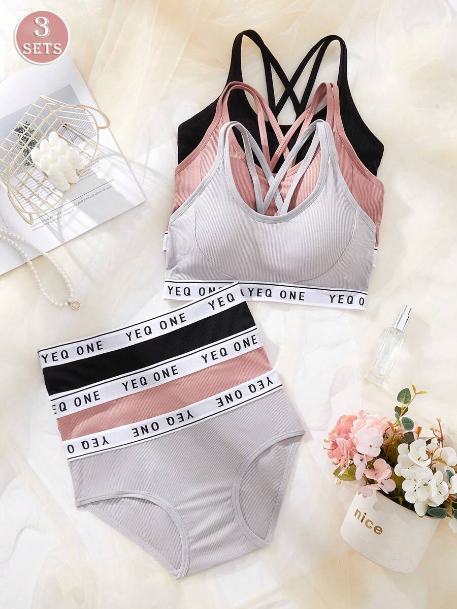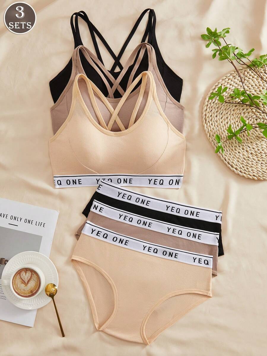 3 conjuntos de ropa interior de mujer con estampado de letra, diseno hueco de cruz y tirantes, sin aro de acero, diseno de espalda comodo y transpirable, conjunto de ropa interior tipo top deportivo.