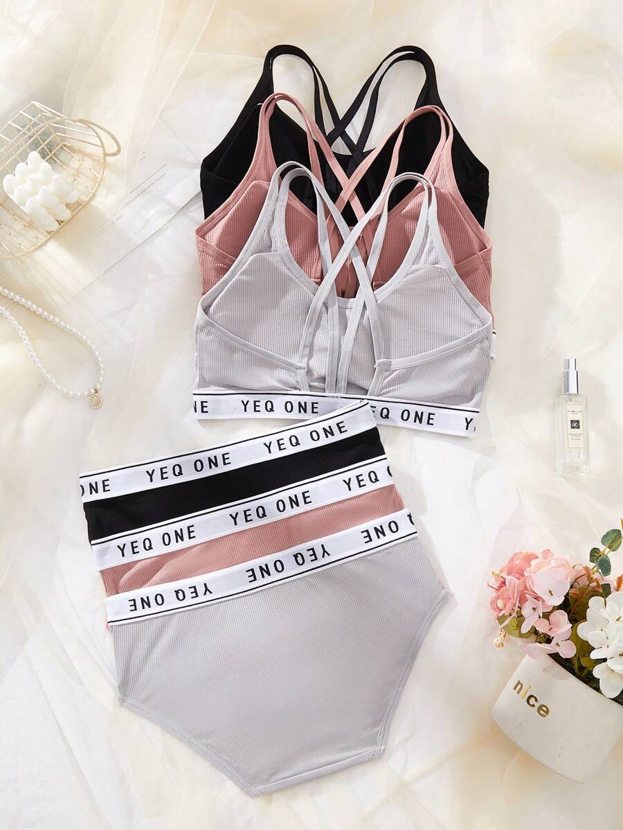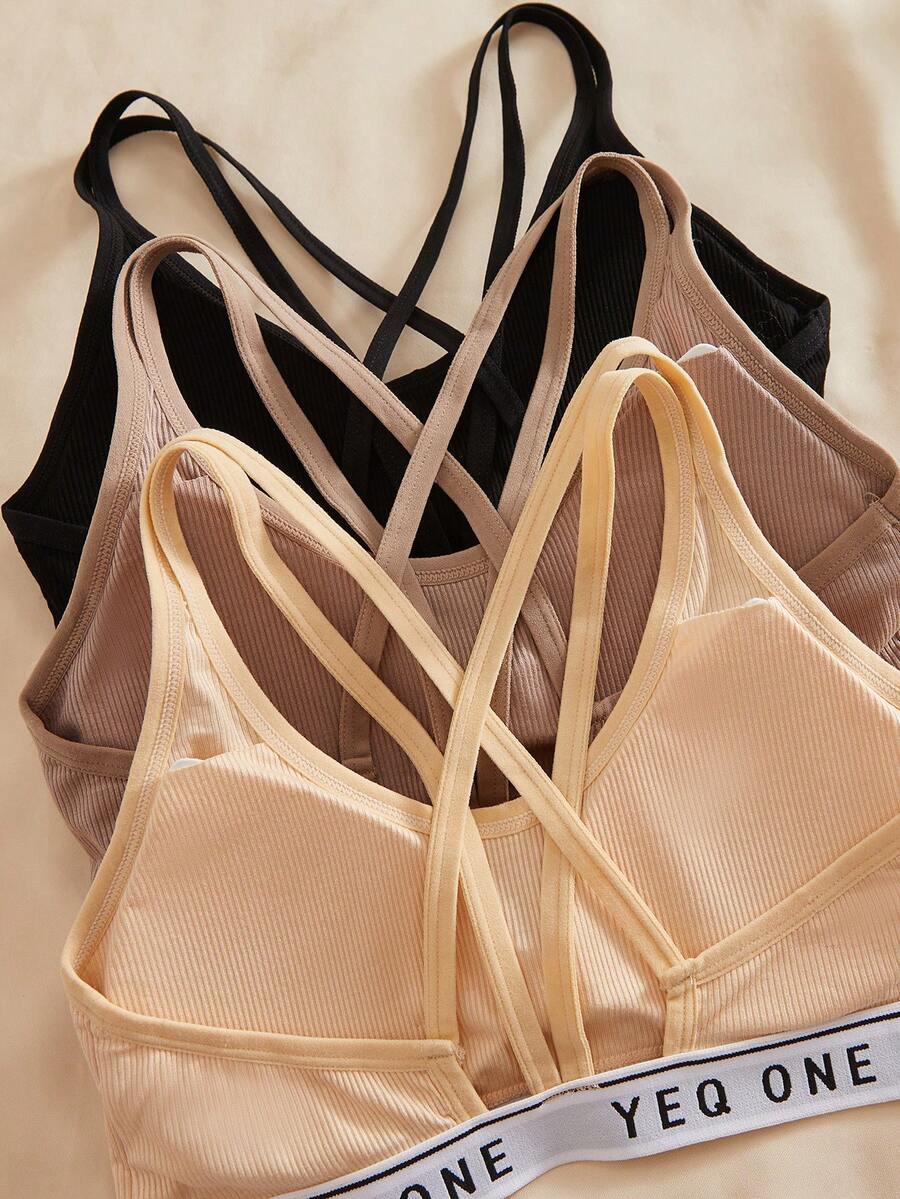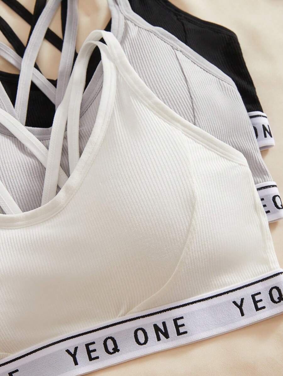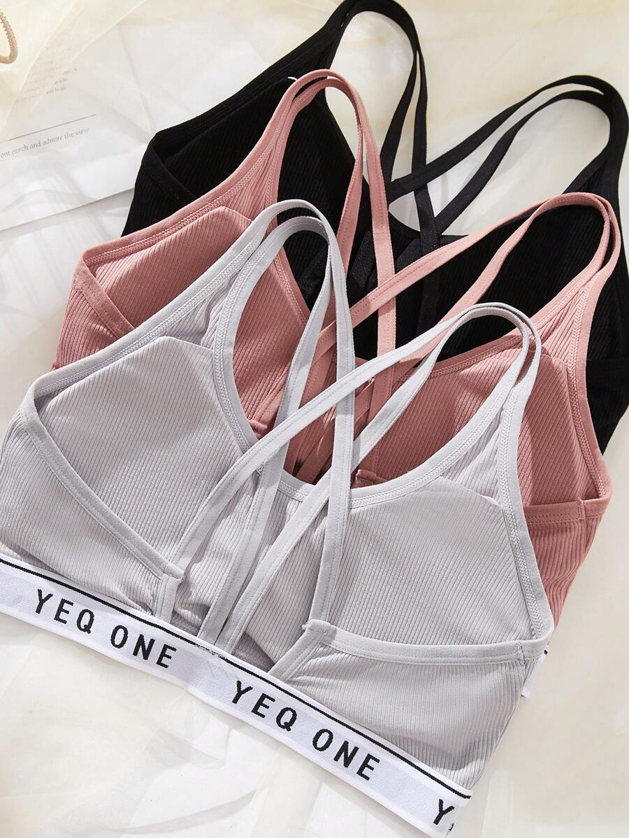 3 conjuntos de ropa interior de mujer con estampado de letra, diseno hueco de cruz y tirantes, sin aro de acero, diseno de espalda comodo y transpirable, conjunto de ropa interior tipo top deportivo.