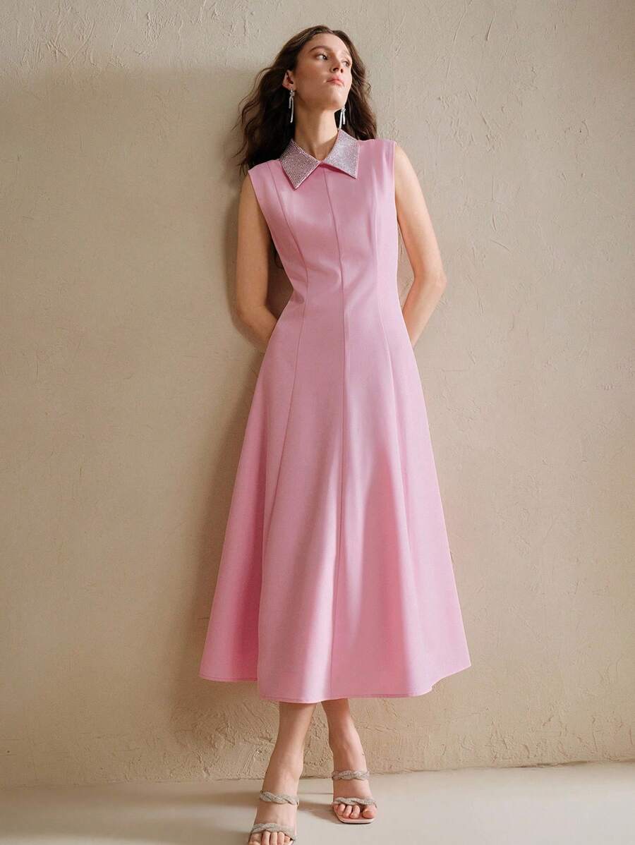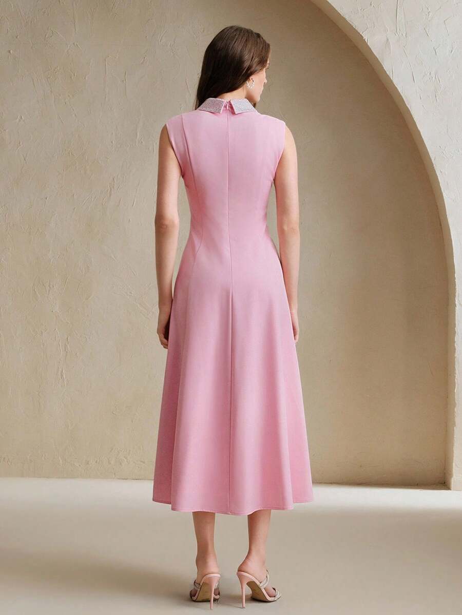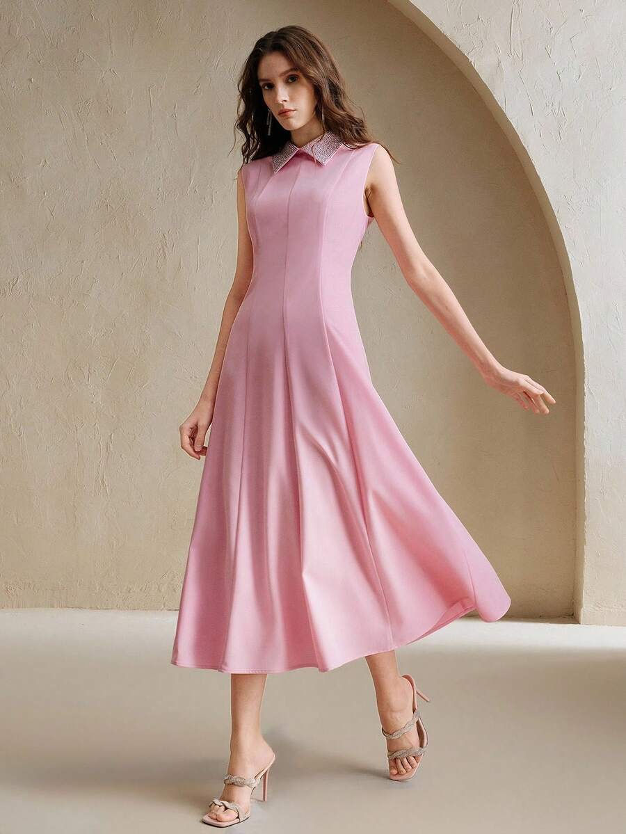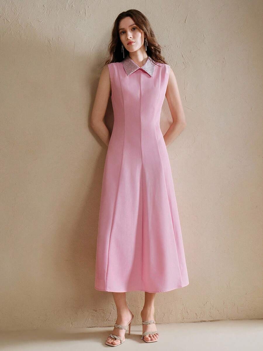 Vestido largo elegante sin mangas con cuello de polo y adornado con cristales para damas, nuevo para el verano