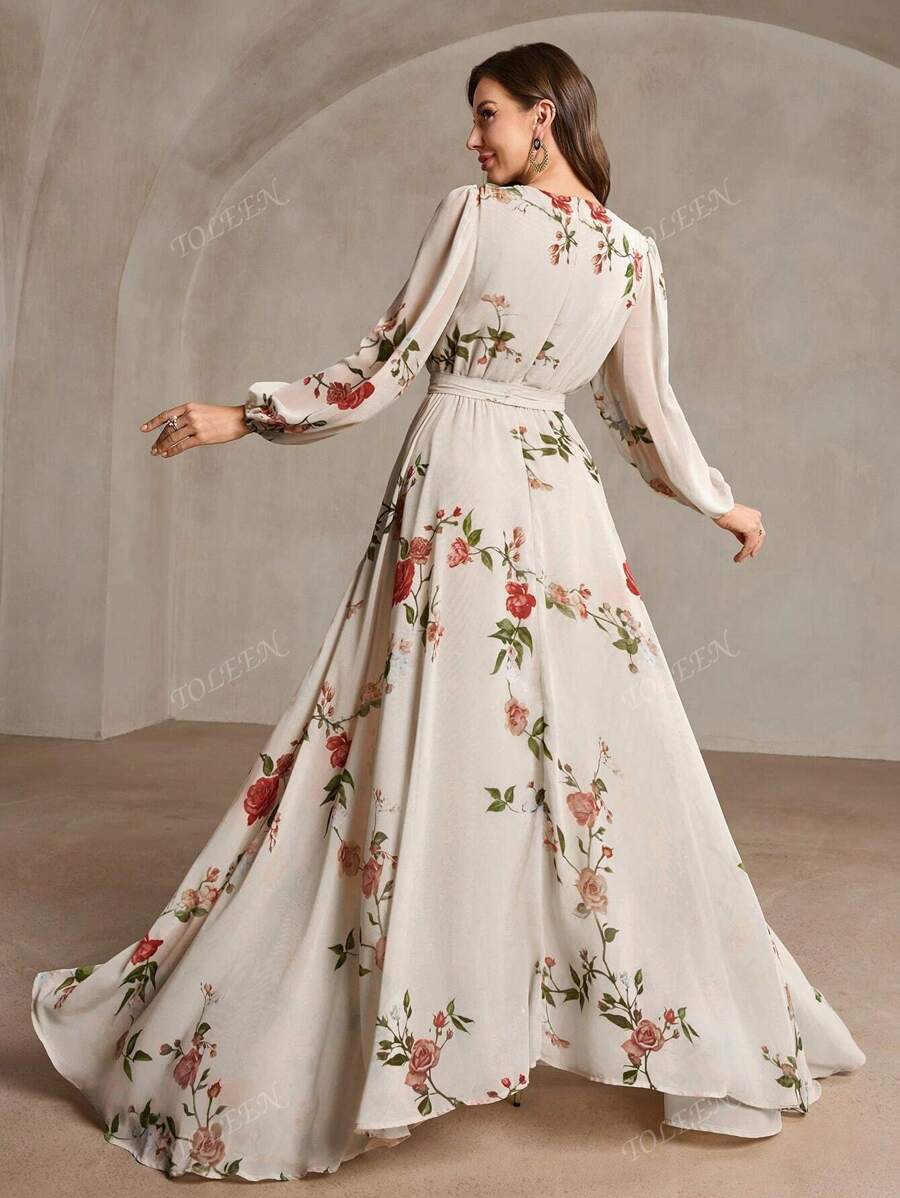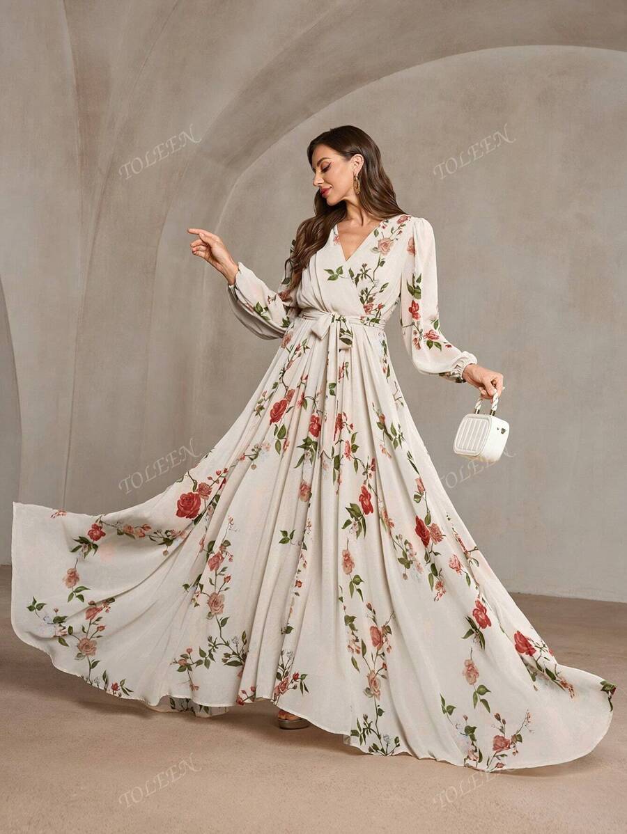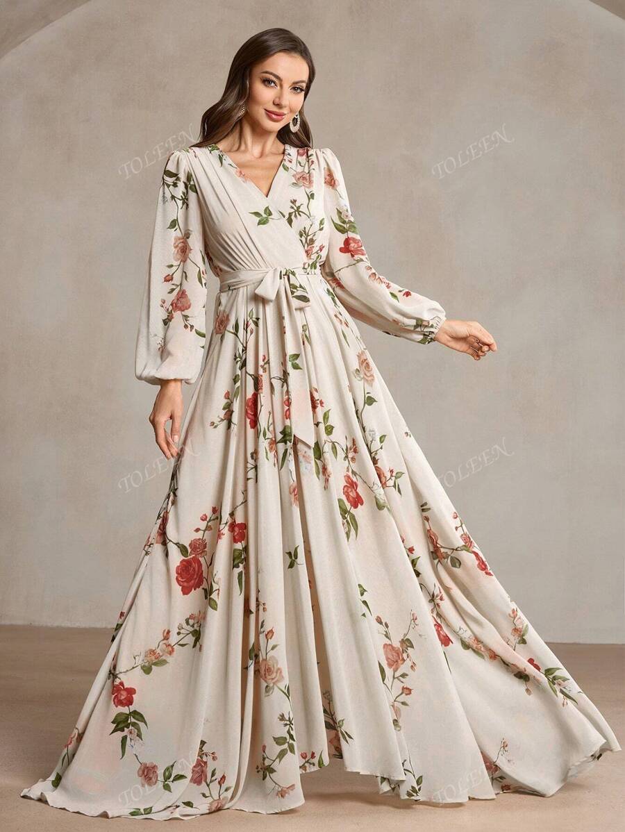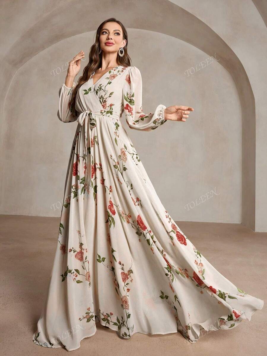 Vestido cruzado con cuello en v, manga abullonada, cintura anudada y estampado aleatorio para mujer