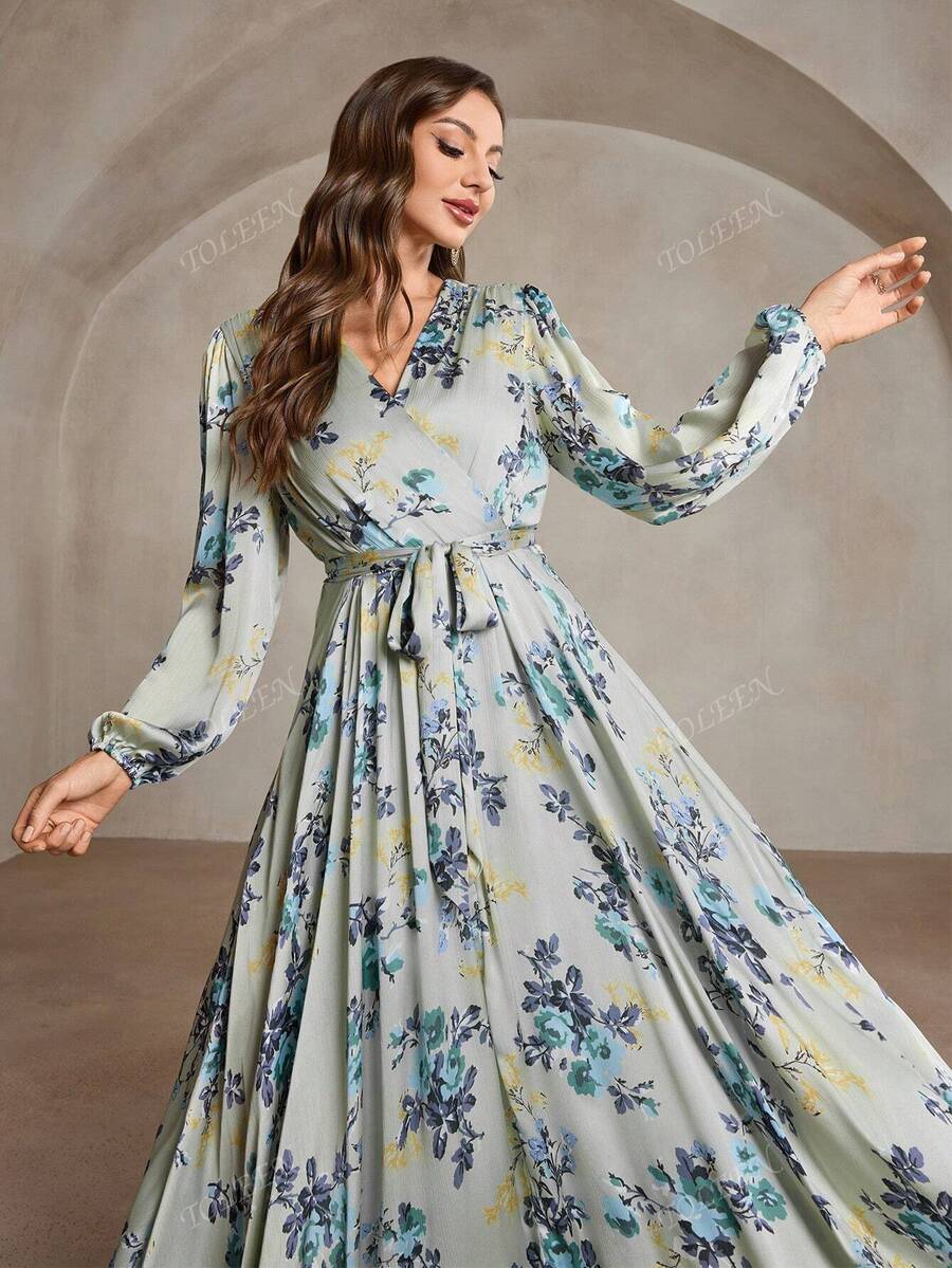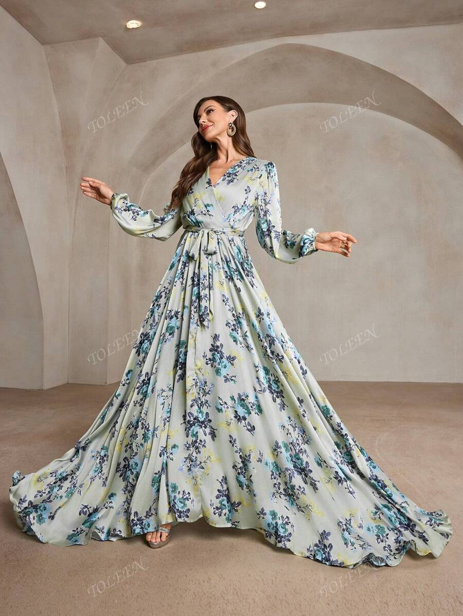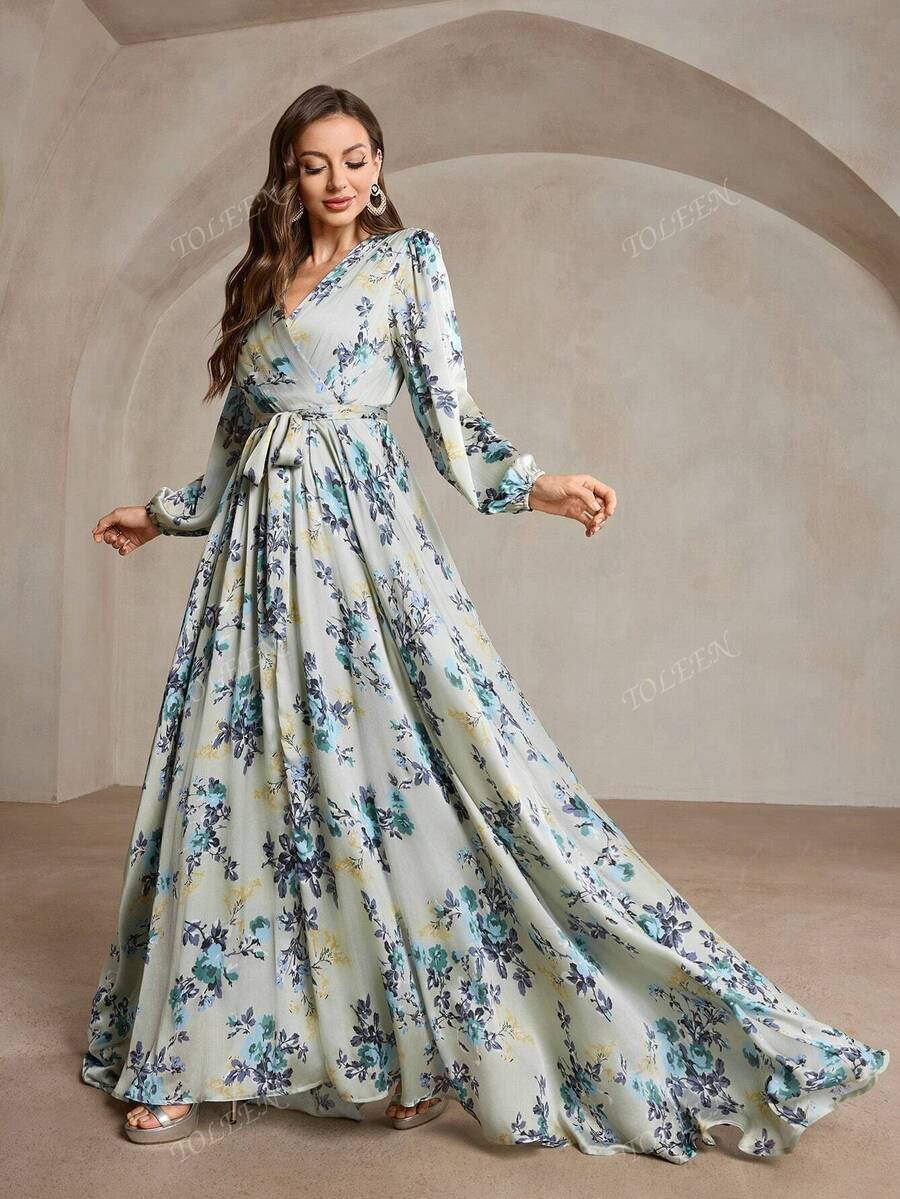 Vestido con manga farol, cuello en v cruzado, impresion aleatoria y cinturon envolvente para mujer