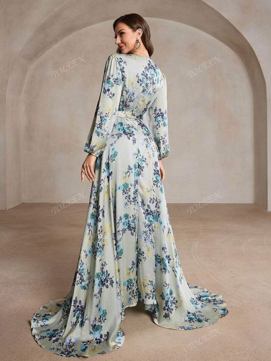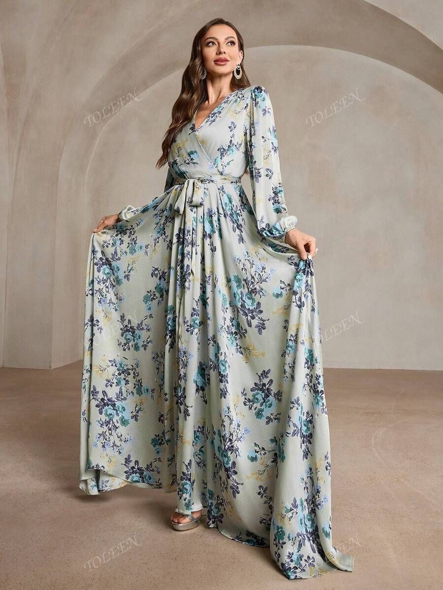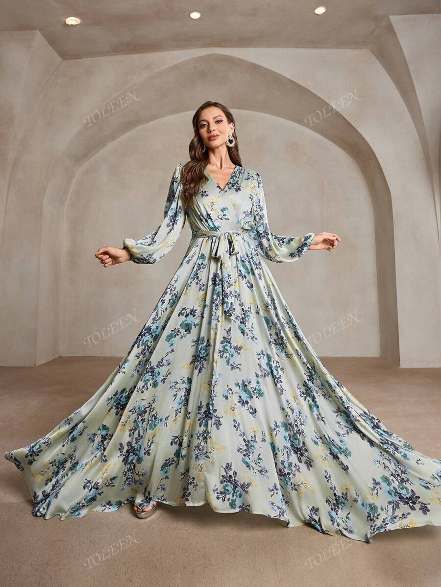 Vestido con manga farol, cuello en v cruzado, impresion aleatoria y cinturon envolvente para mujer