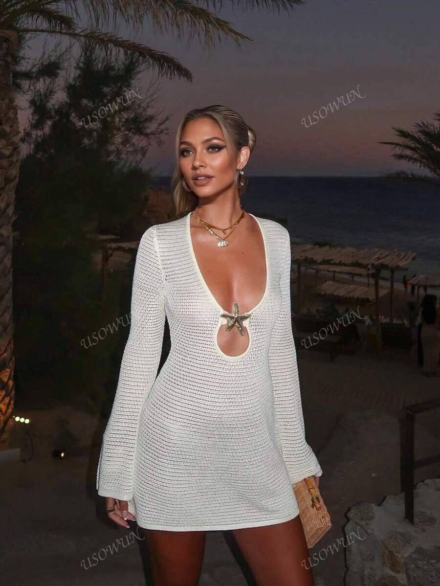 Vestido corto de cubierta de playa de manga larga, vintage, sexy y transparente con diseno de estrella de mar, adecuado para primavera/verano, estilo europeo y americano