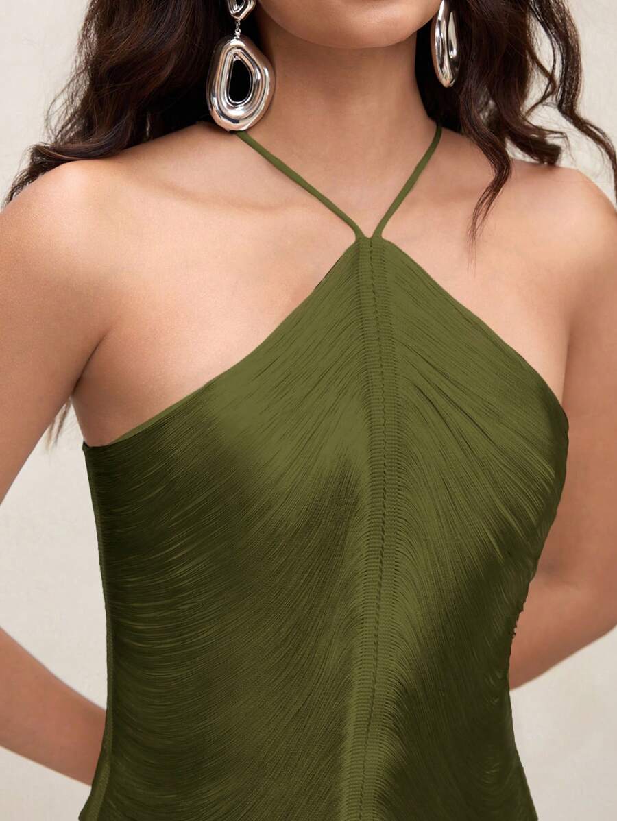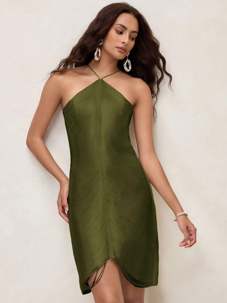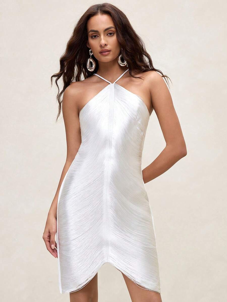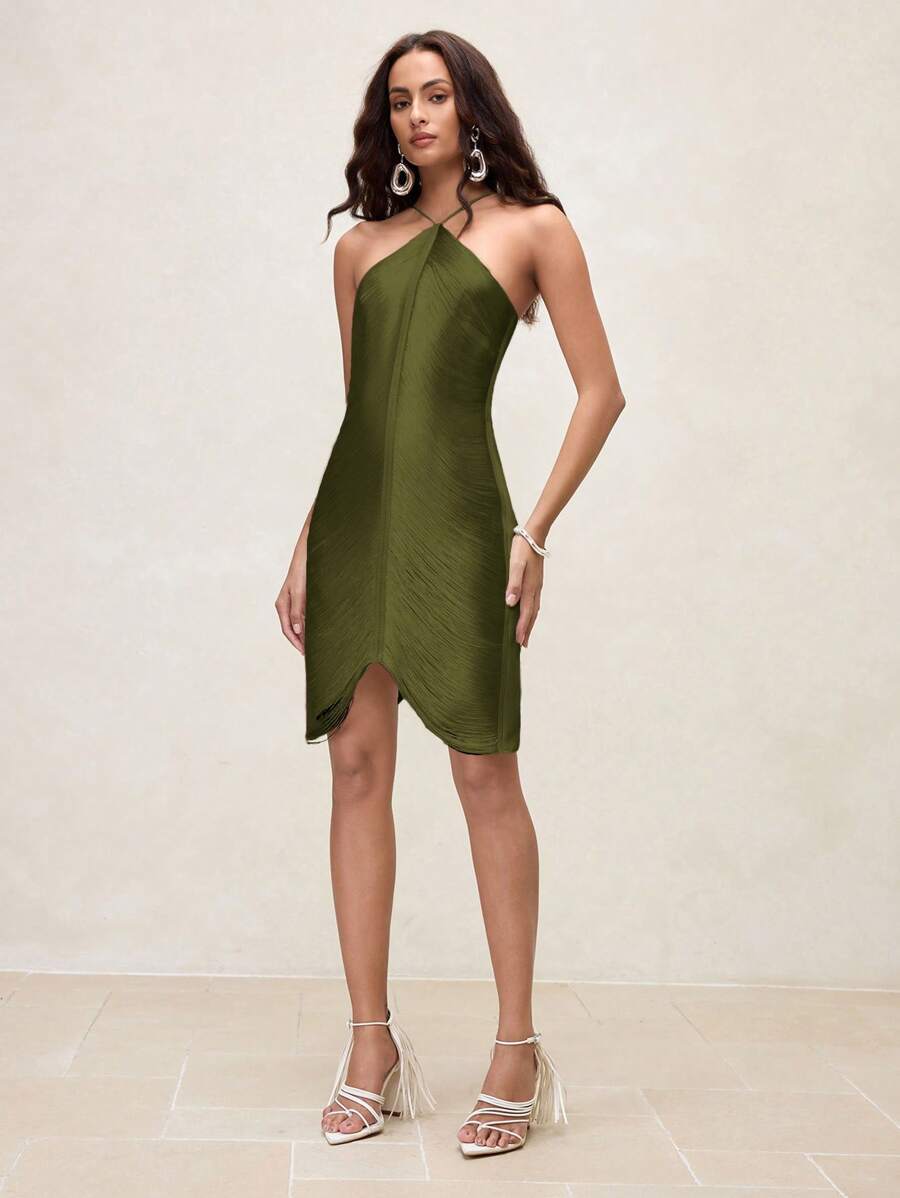 Vestido mini de verano para mujer con tirantes, espalda descubierta, flecos y diseno drapeado de unicolor tejido, ideal para fiestas, vacaciones y citas nocturnas
