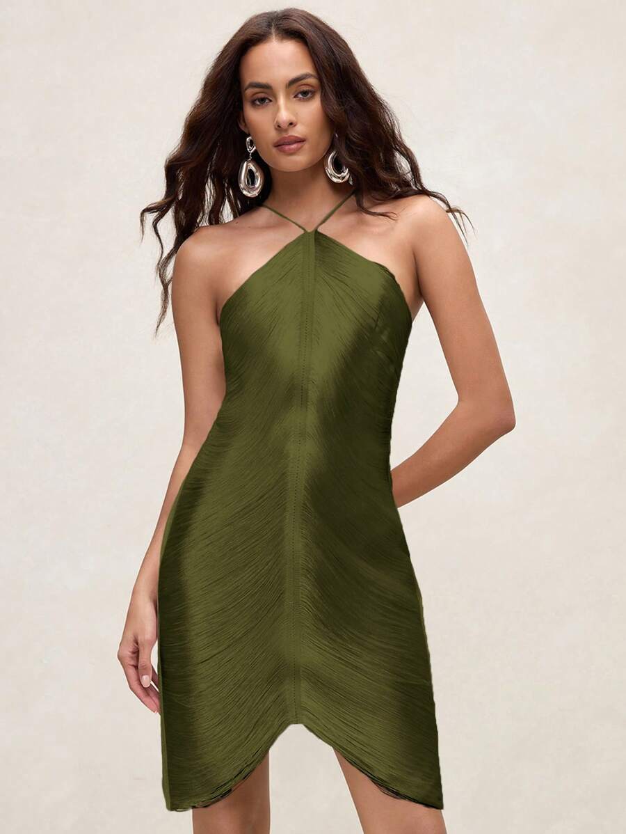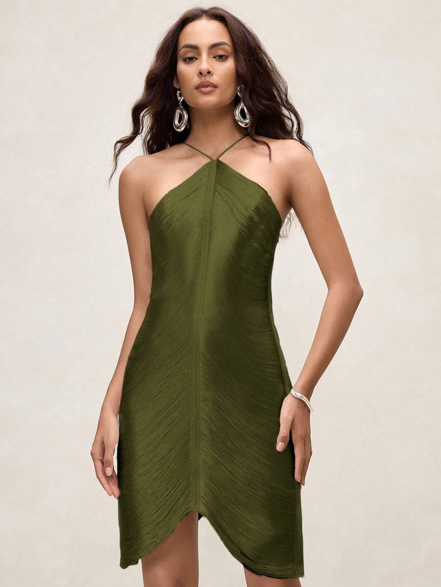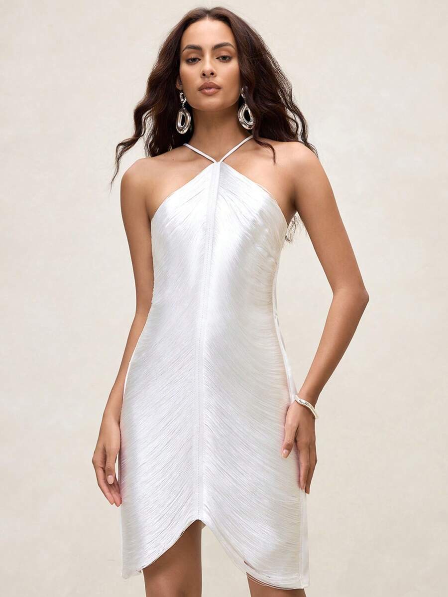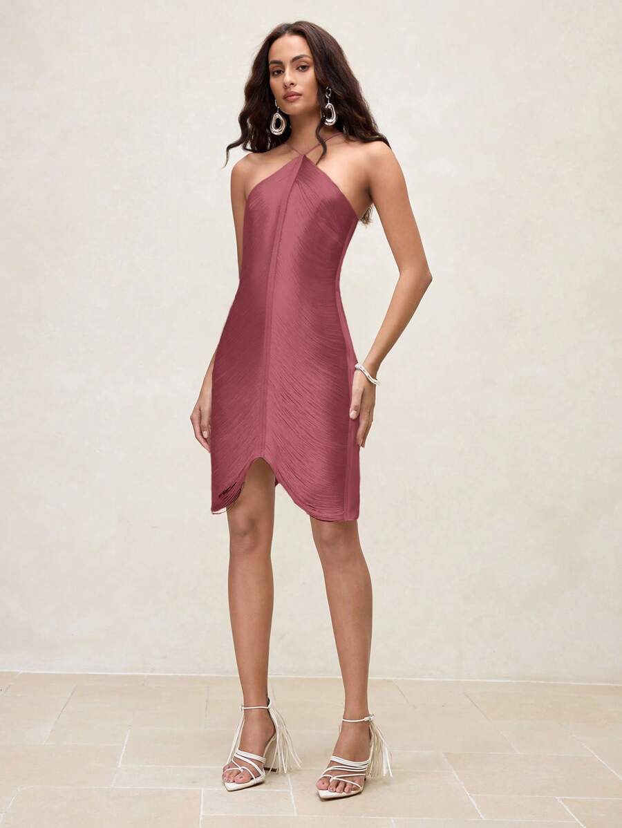 Vestido mini de verano para mujer con tirantes, espalda descubierta, flecos y diseno drapeado de unicolor tejido, ideal para fiestas, vacaciones y citas nocturnas