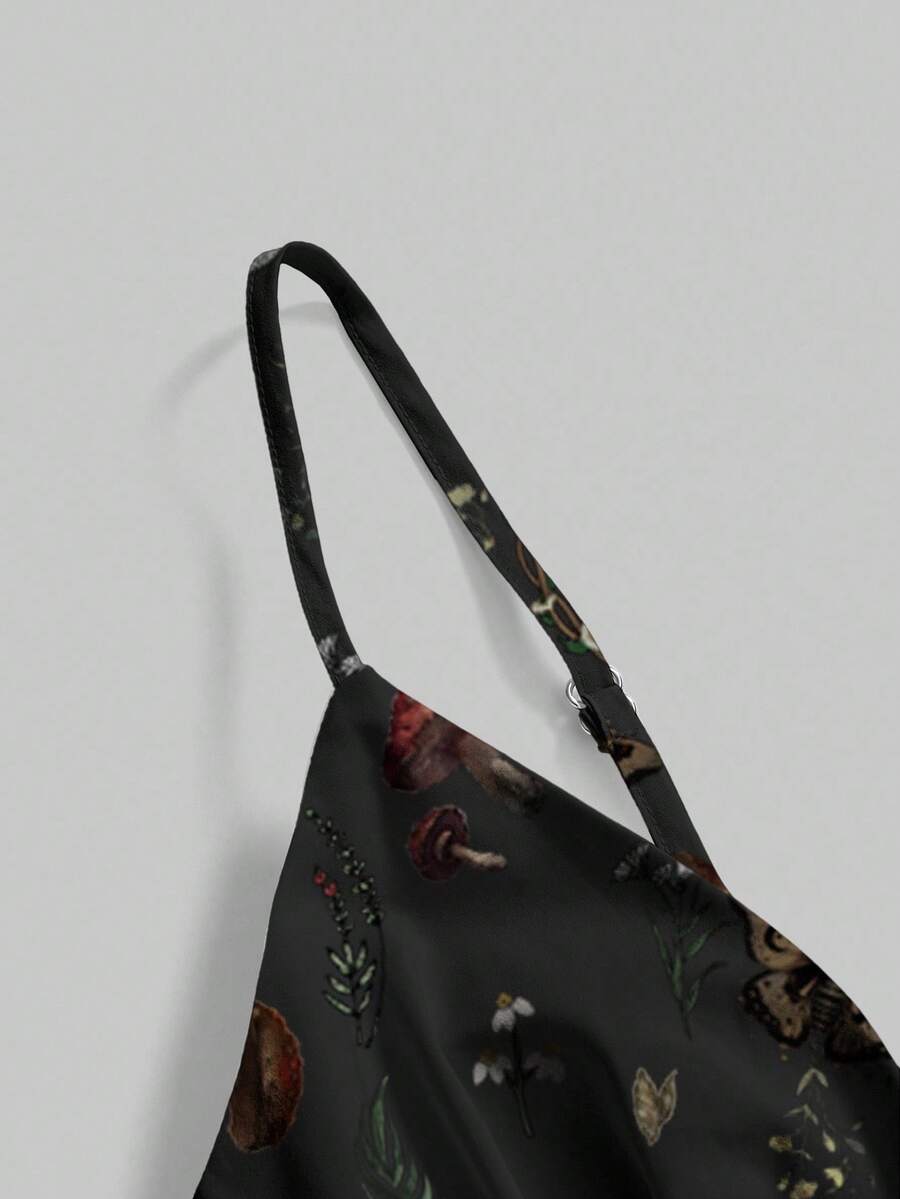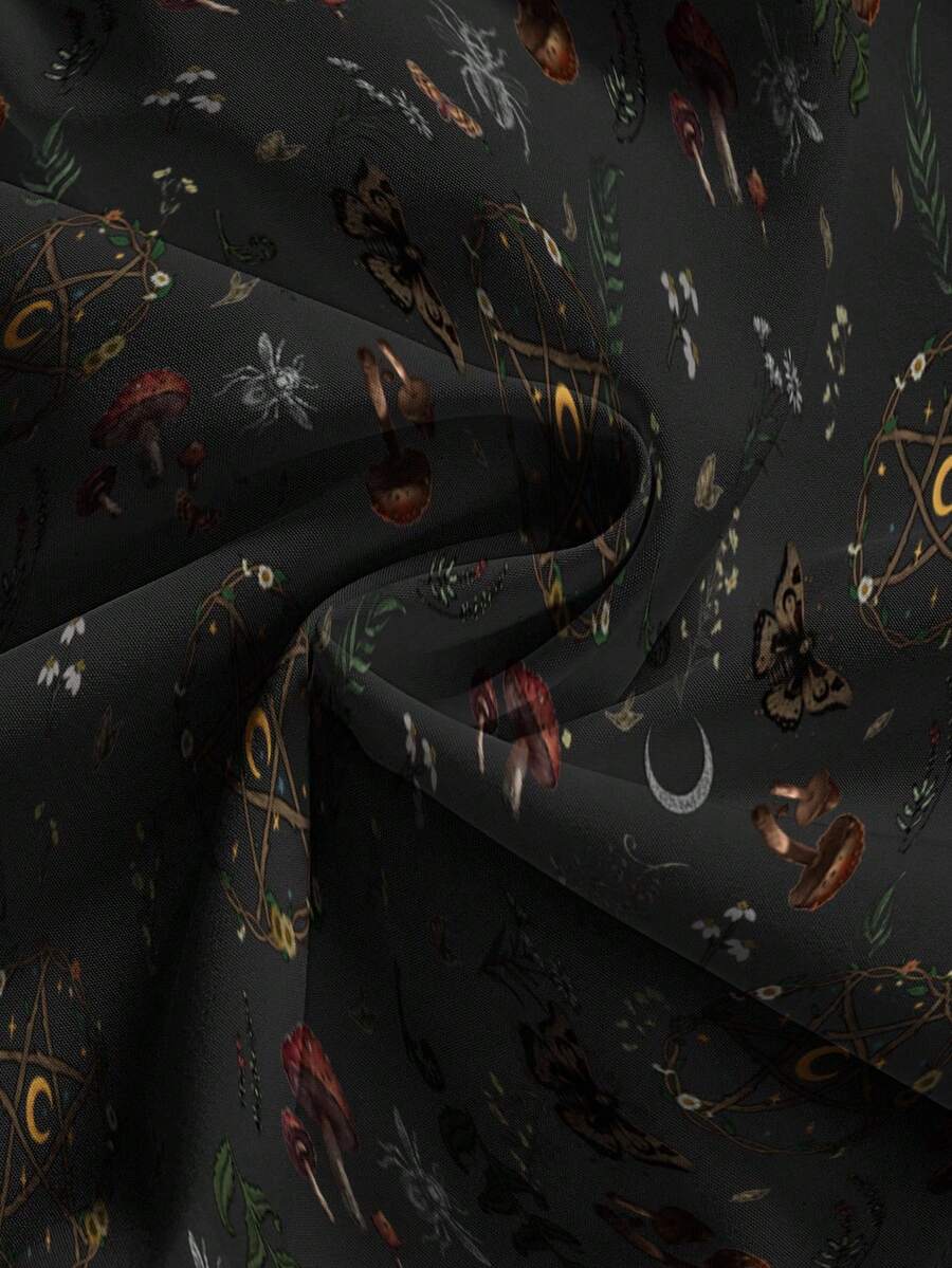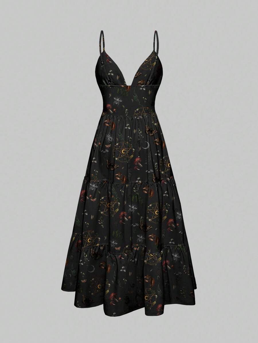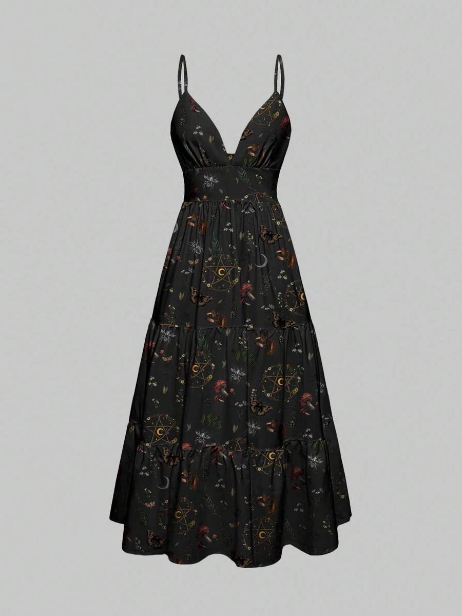 Vestido negro y verde con estampados de mariposa, planta, seta, pentagrama, bruja, polilla y animal para mujer con estilo gotico para vacaciones
