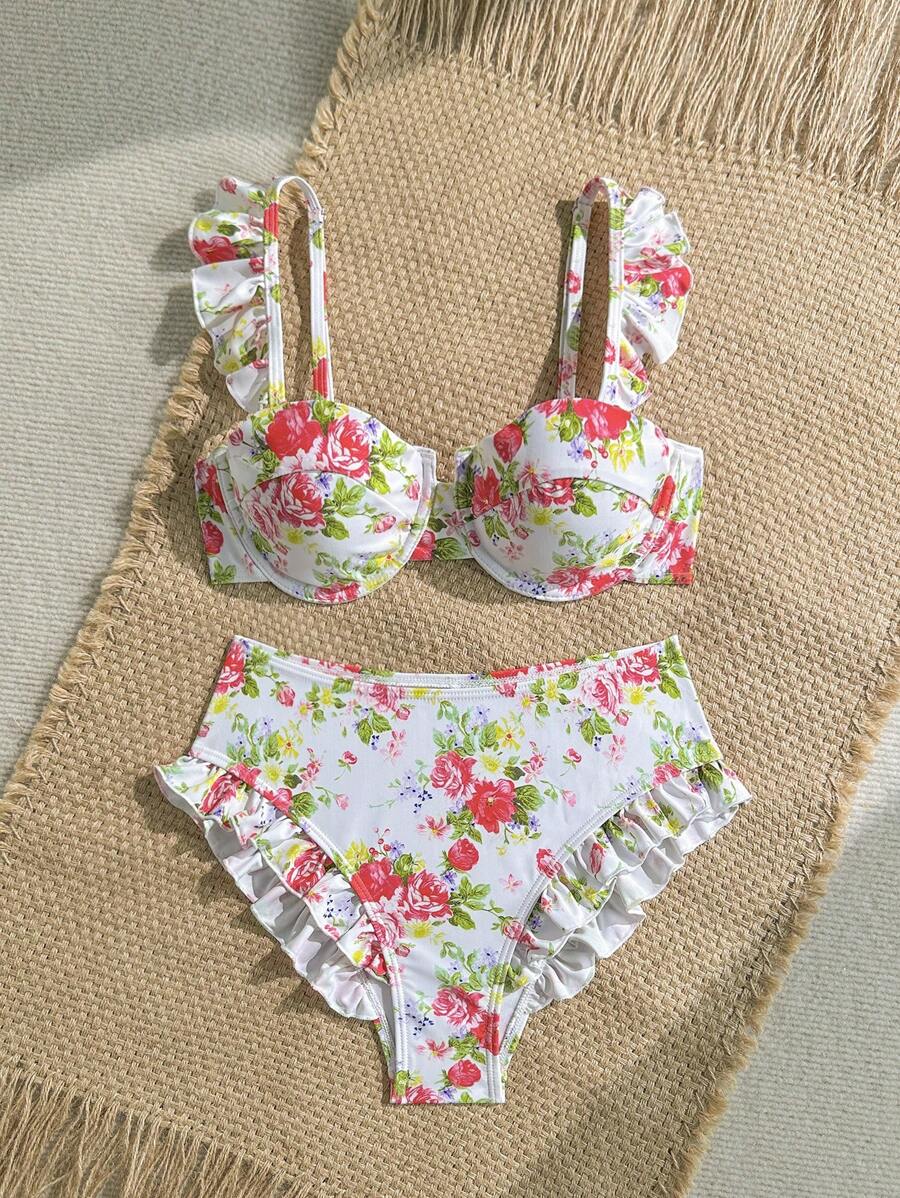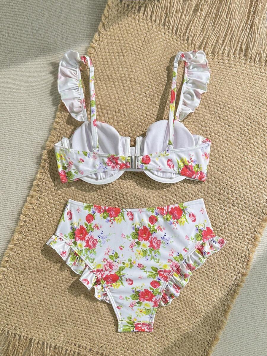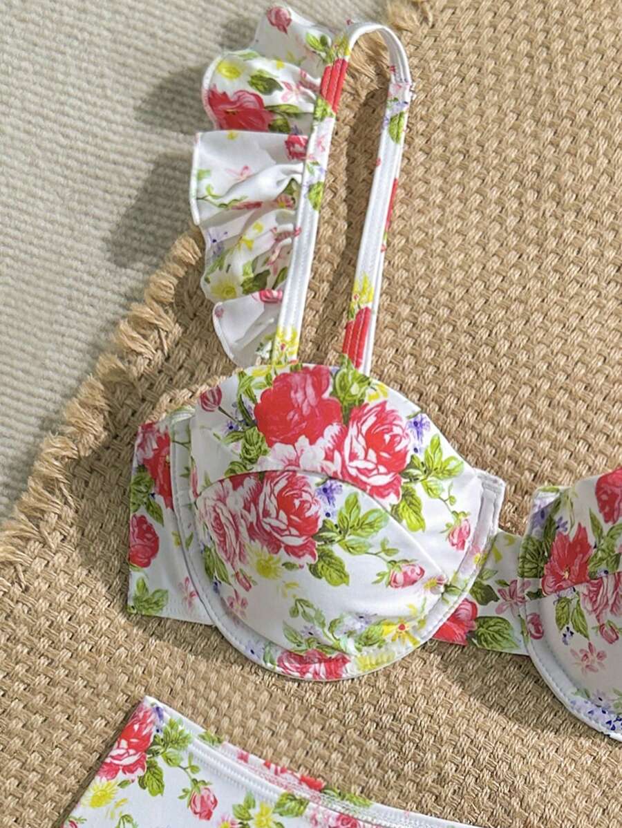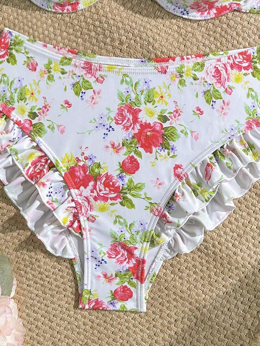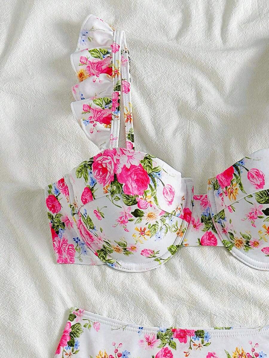 2 piezas conjunto de bikini con estampado floral y ribete de rizo para mujer, estilo romantico de vacaciones