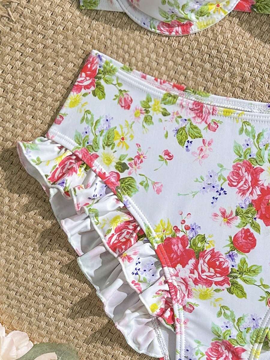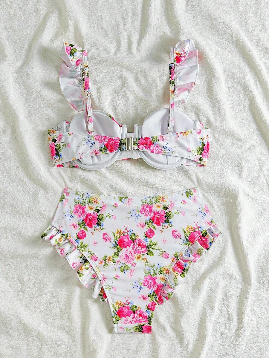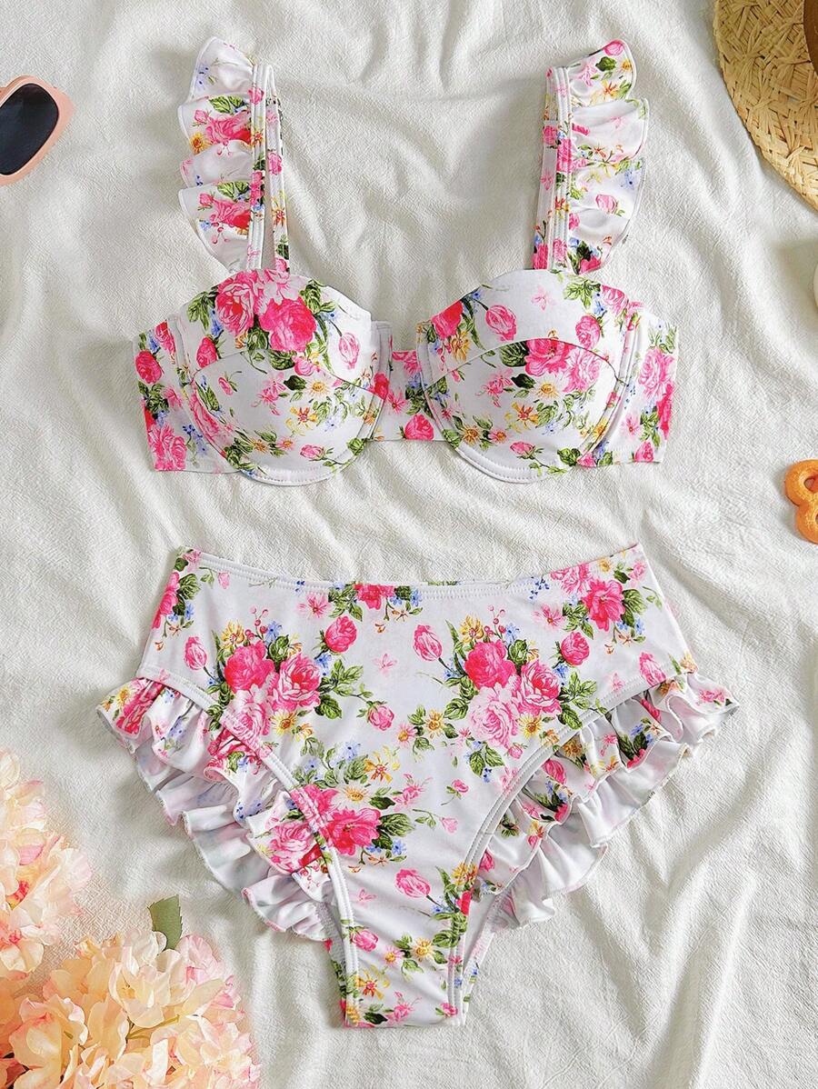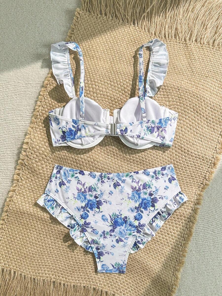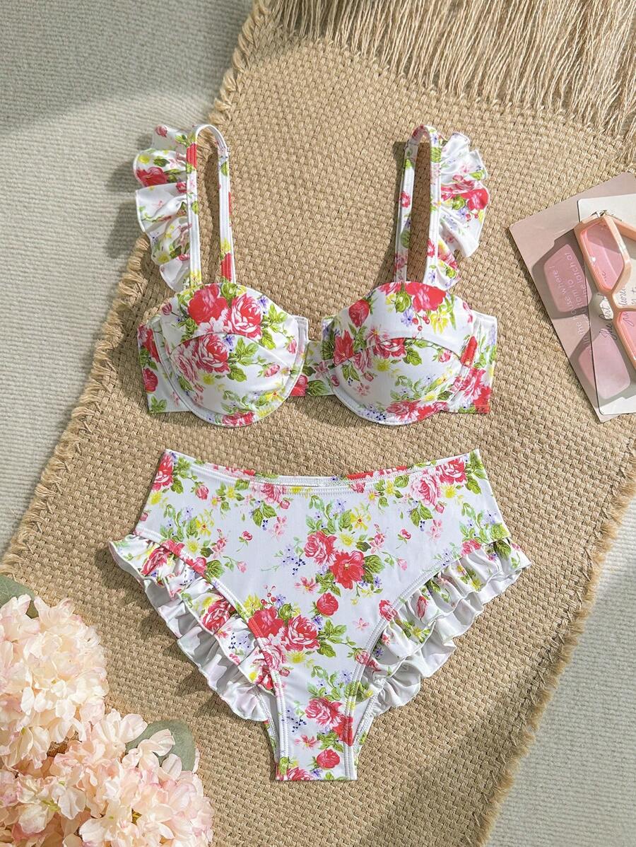 2 piezas conjunto de bikini con estampado floral y ribete de rizo para mujer, estilo romantico de vacaciones