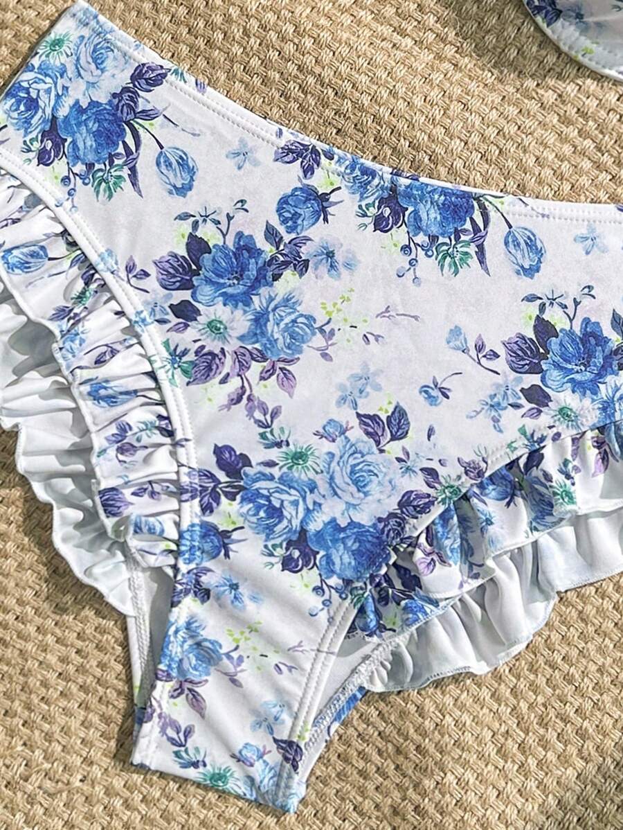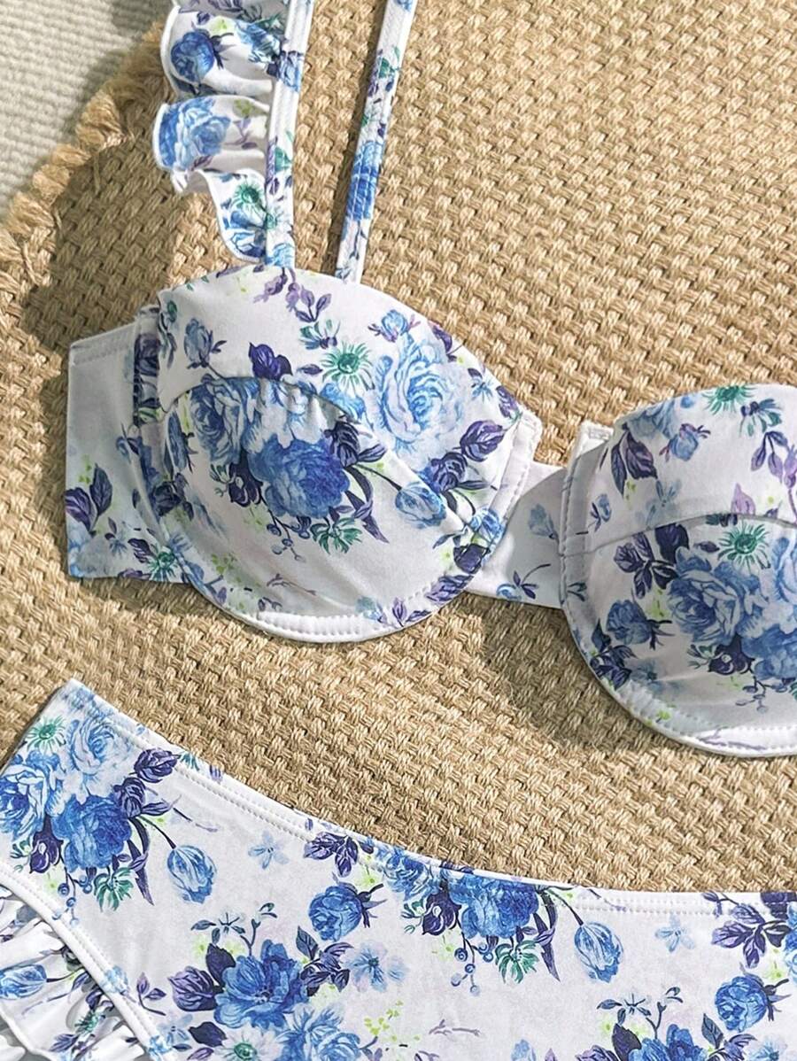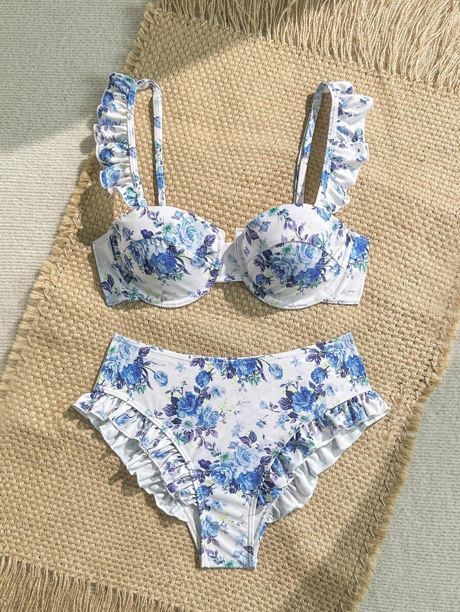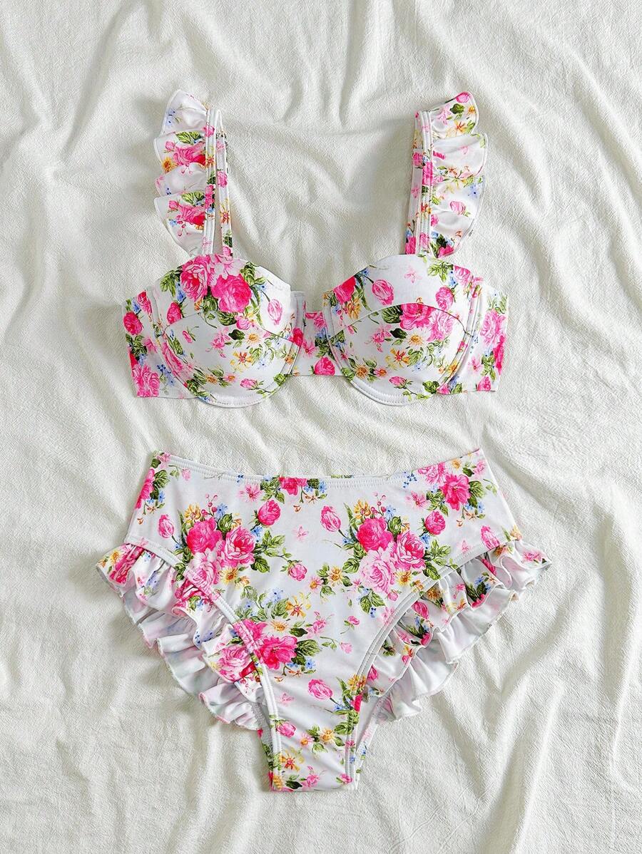 2 piezas conjunto de bikini con estampado floral y ribete de rizo para mujer, estilo romantico de vacaciones