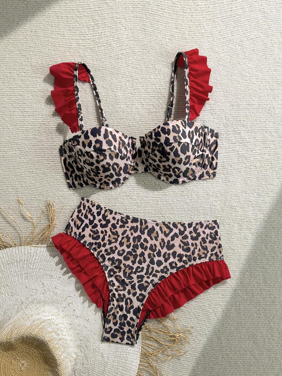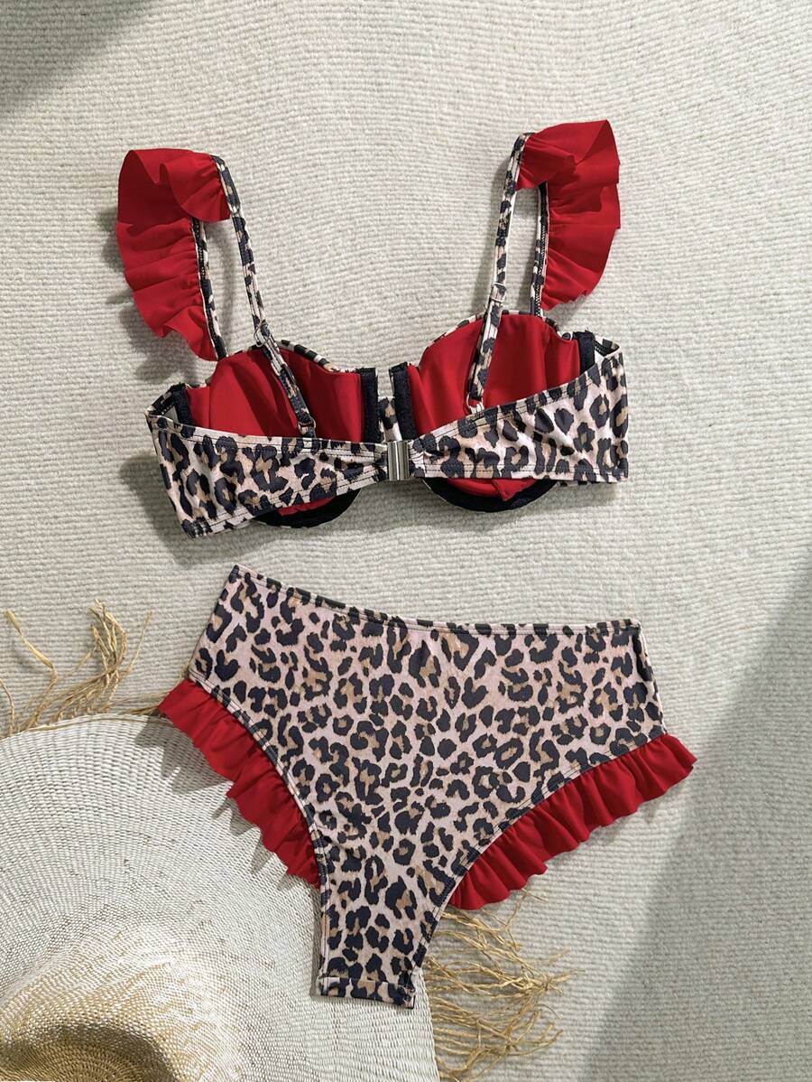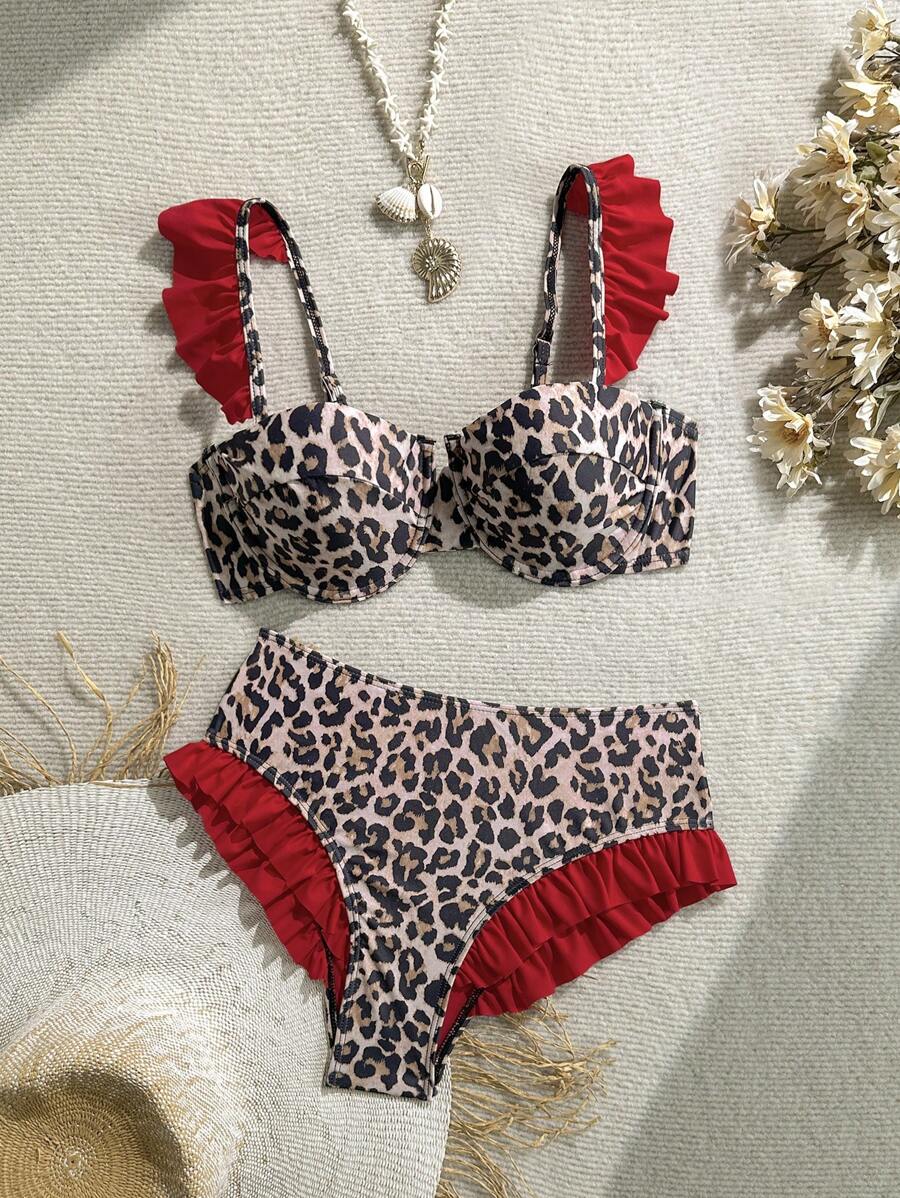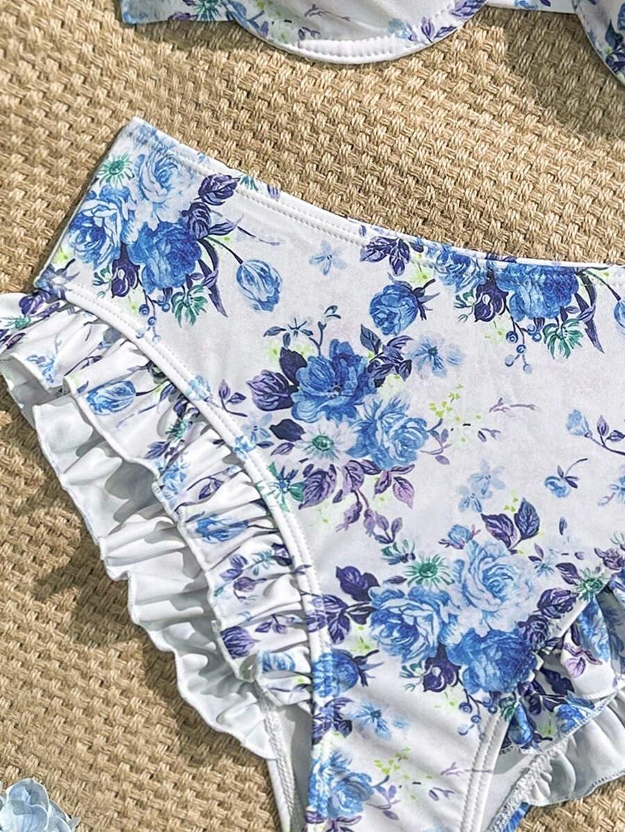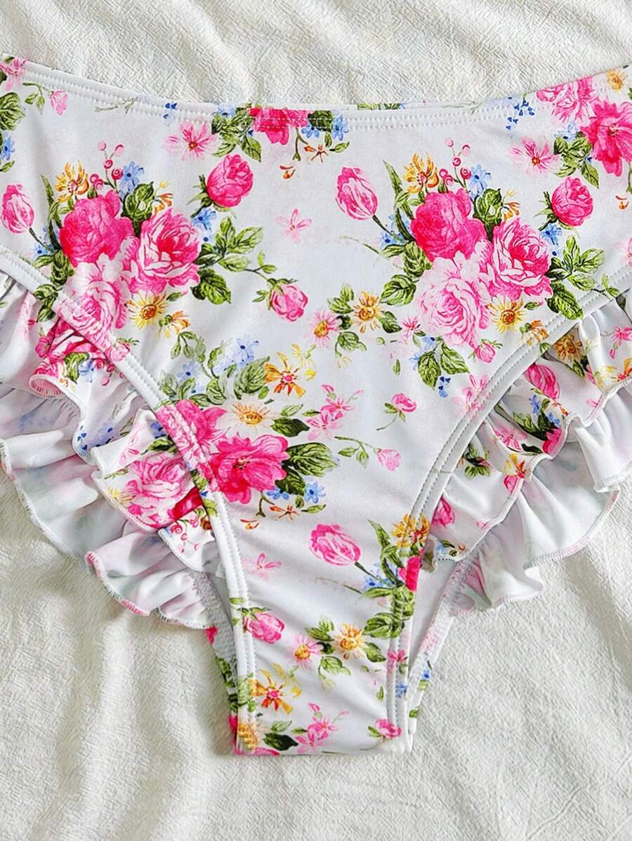 2 piezas conjunto de bikini con estampado floral y ribete de rizo para mujer, estilo romantico de vacaciones