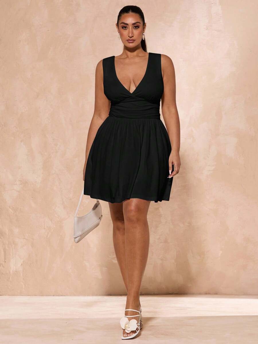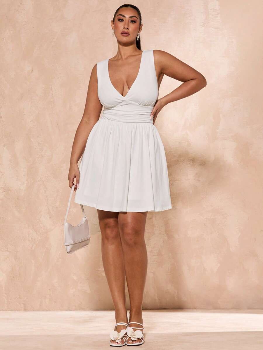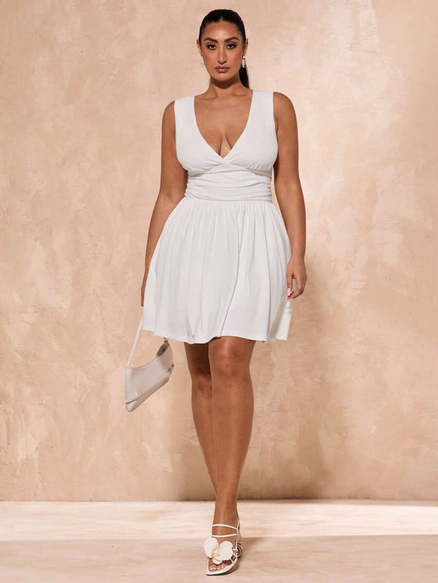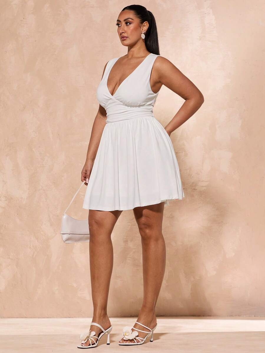 Vestido mini de manga larga con cuello profundo en v, mangas largas y cuello en r simple, talla grande, blanco y simple, adecuado para otono/invierno, navidad, accion de gracias, bodas, salidas nocturnas, san valentin, fiestas en cocktail,
