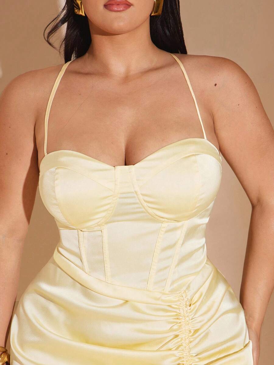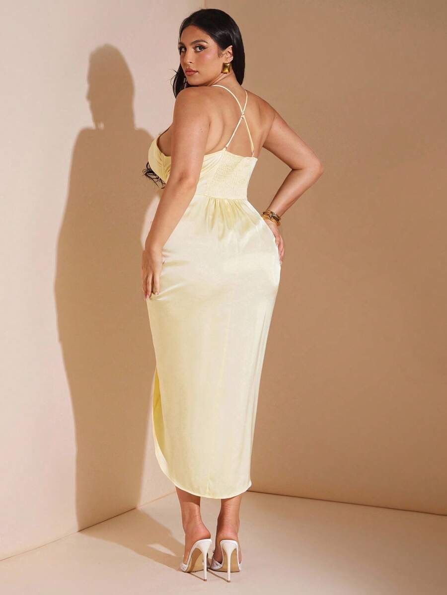 Vestido de saten amarillo con cordon y abertura alta para mujer de talla grande