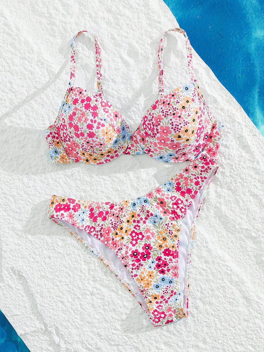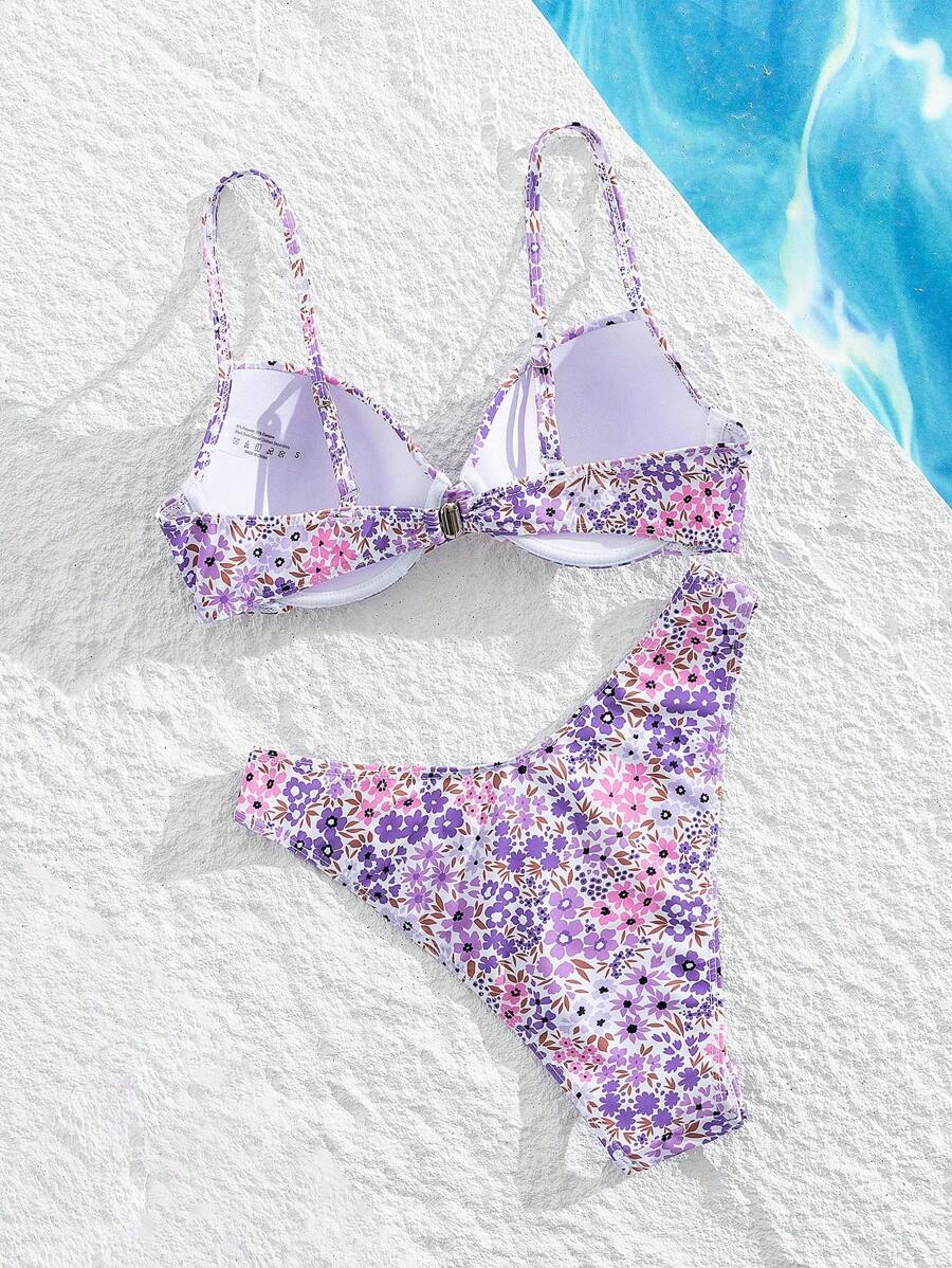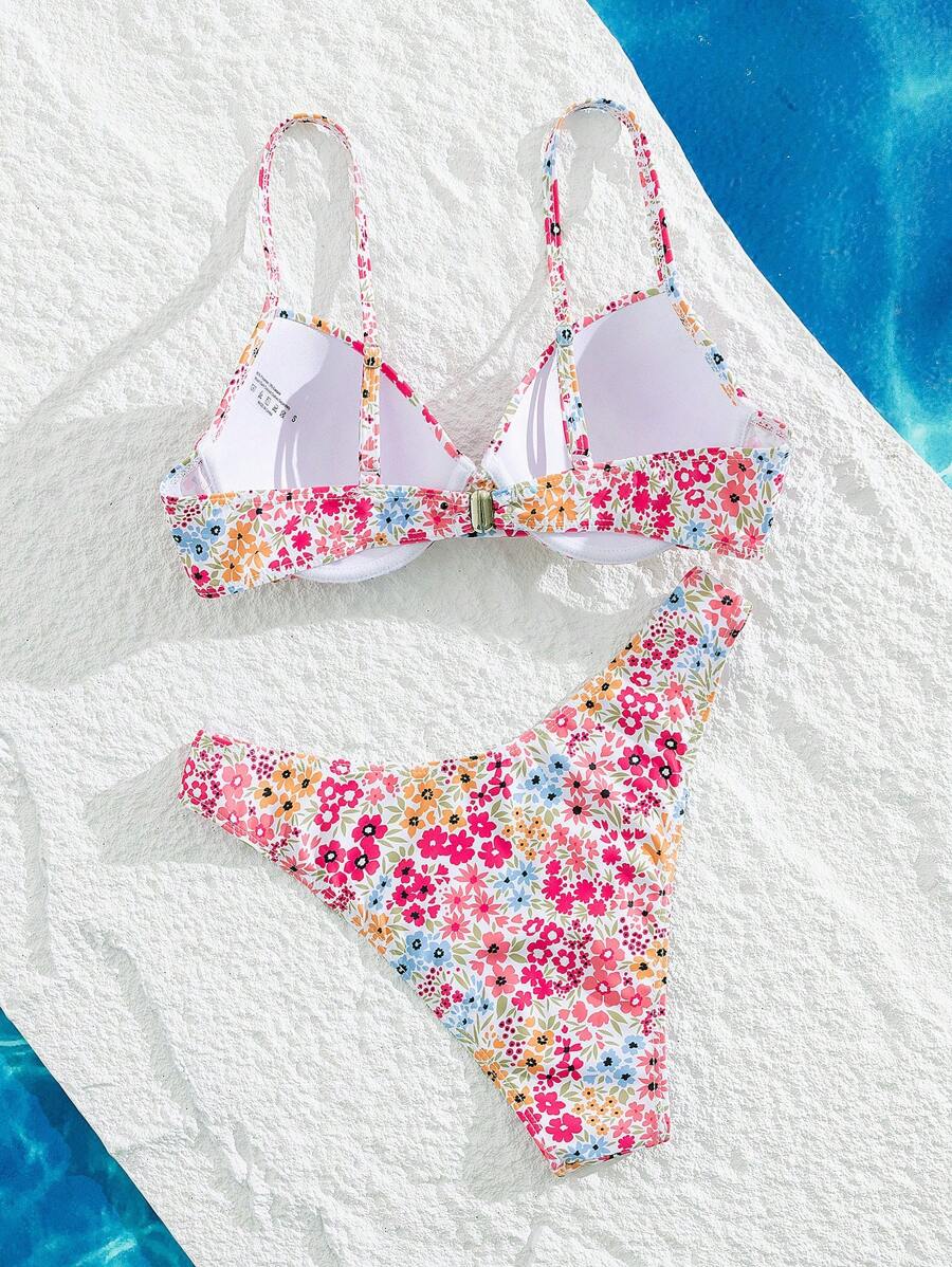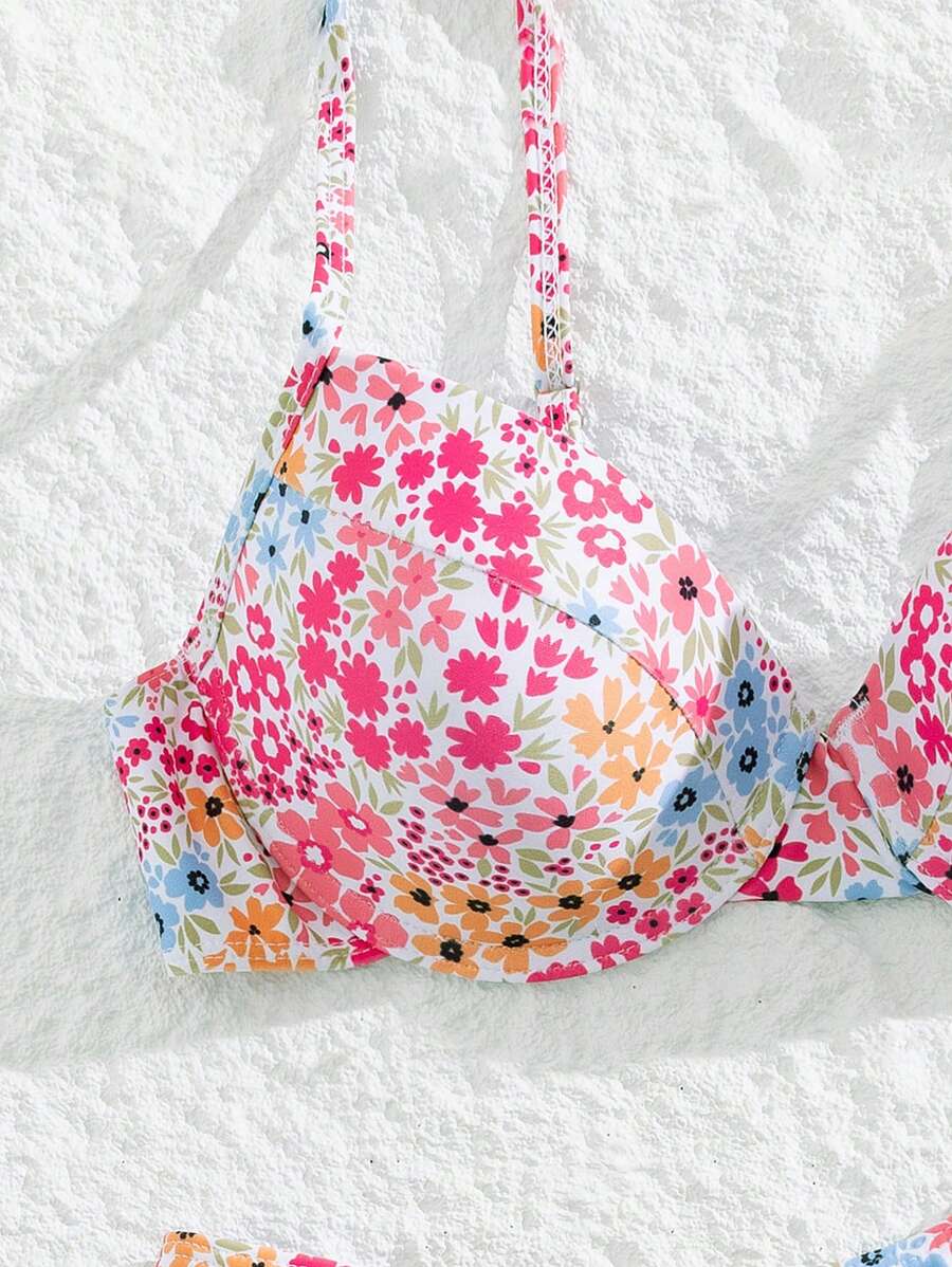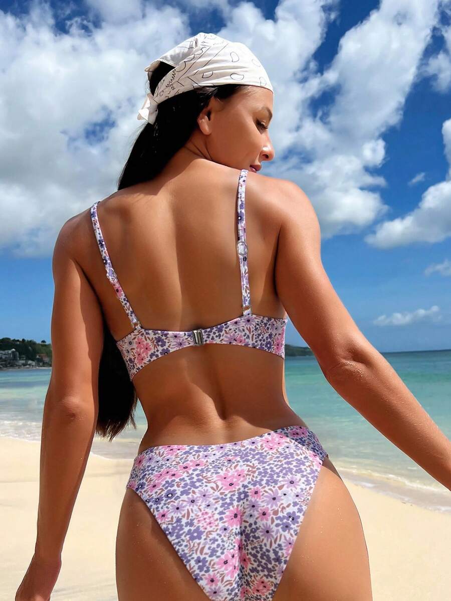 2 piezas/set bikini acolchado con estampado floral ditsy, conjunto de bikini, vacaciones de verano