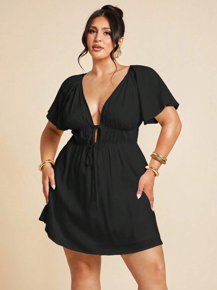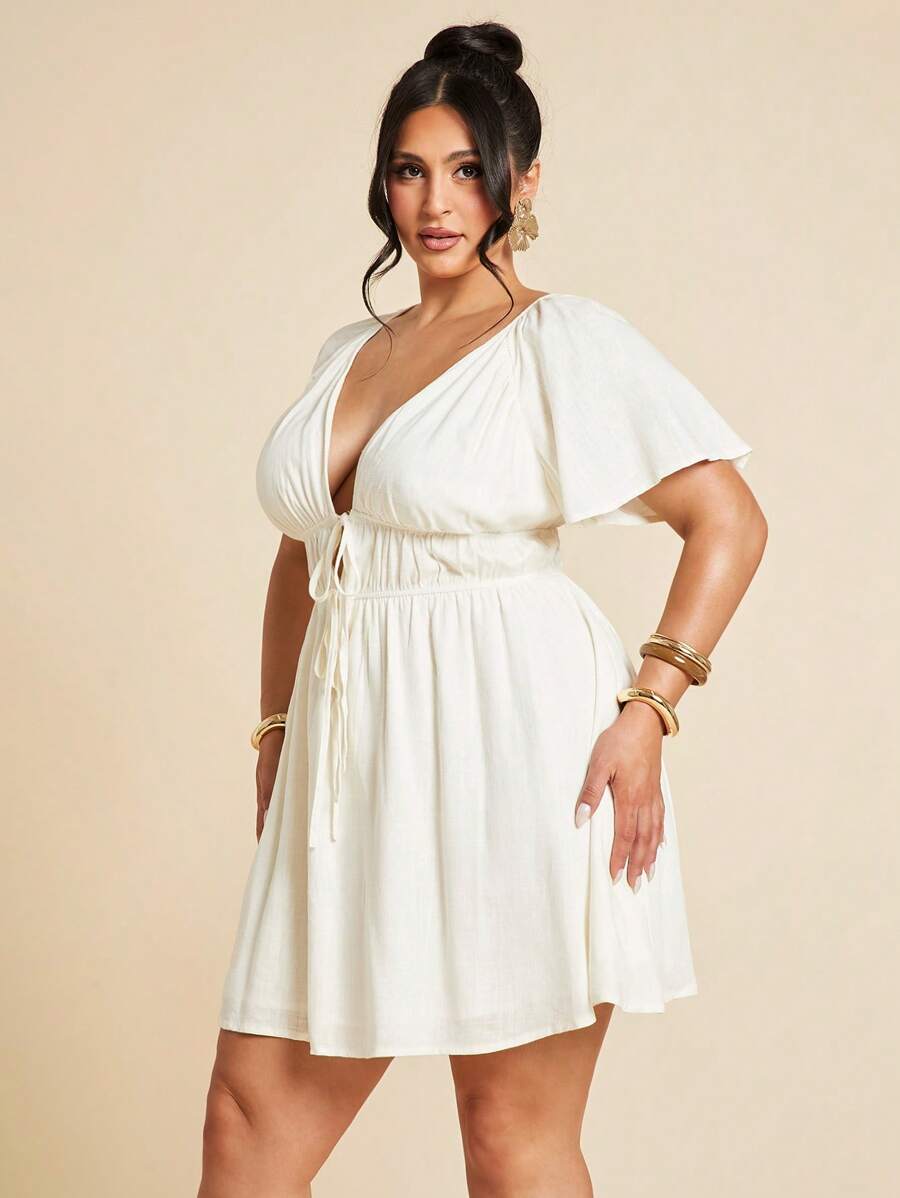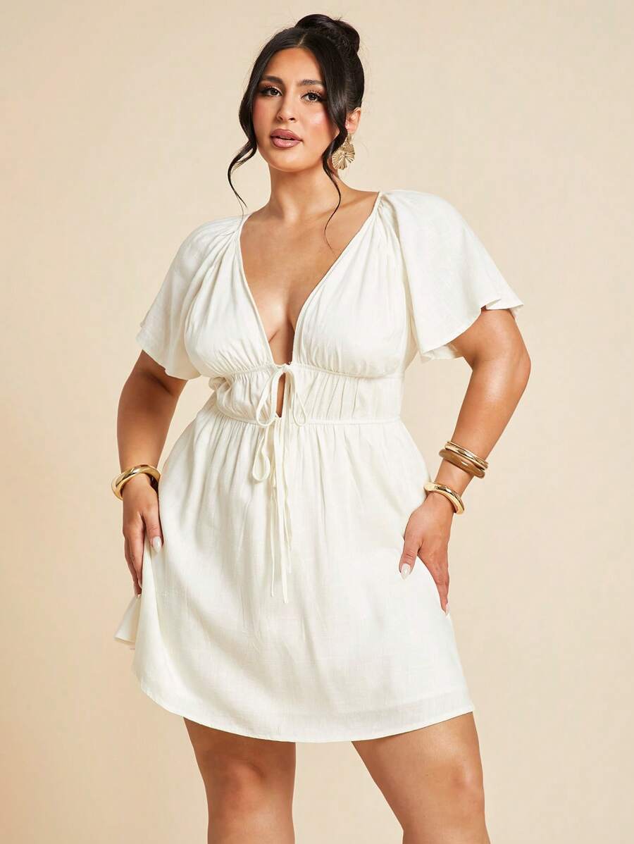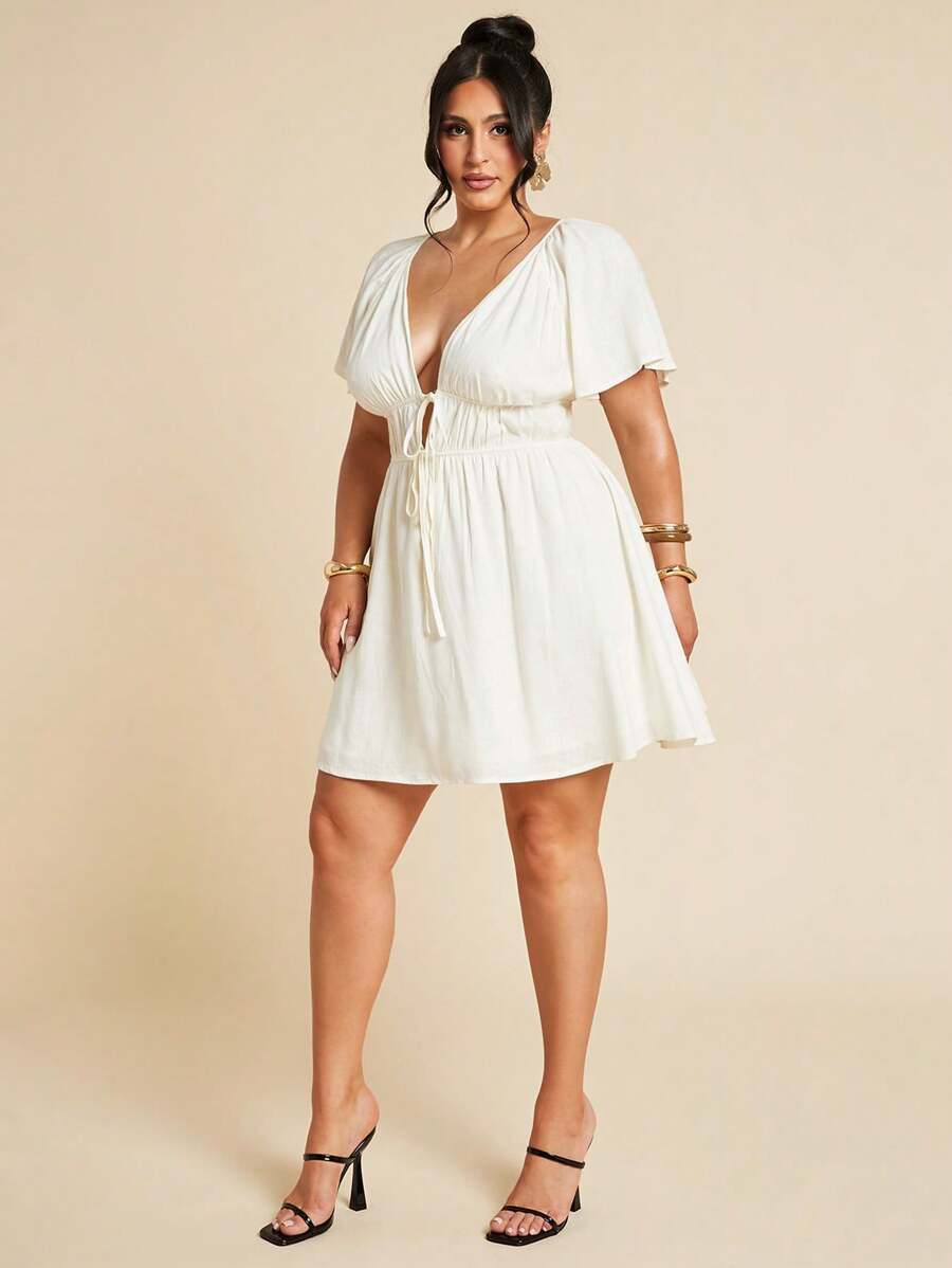 Vestido elegante blanco de manga corta con cuello en v, fruncido y forro de corbata para mujer talla grande, vestido casual de uso diario, mini vestido, moda para uso cotidiano