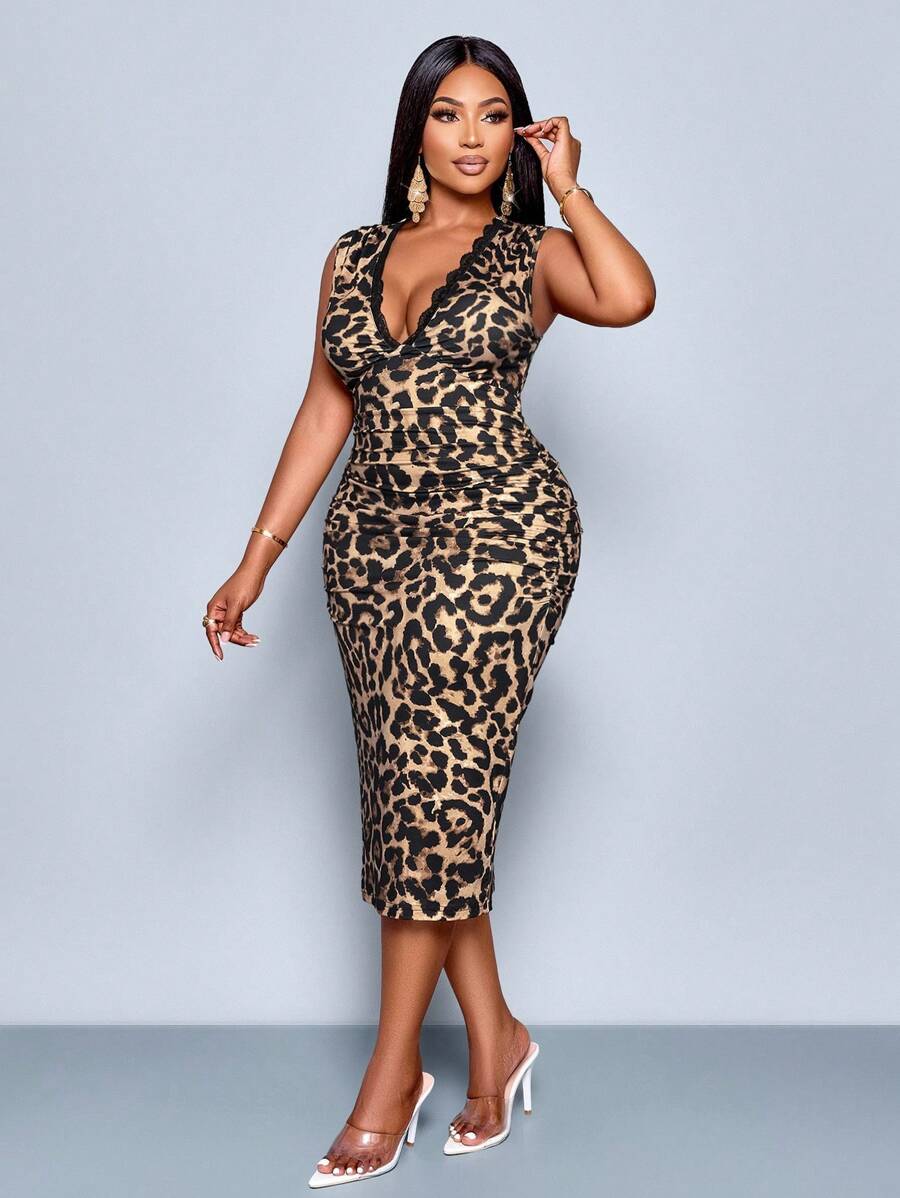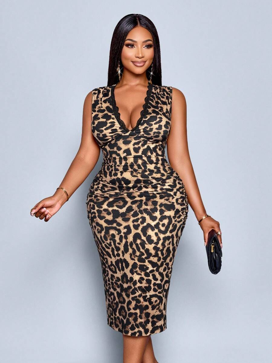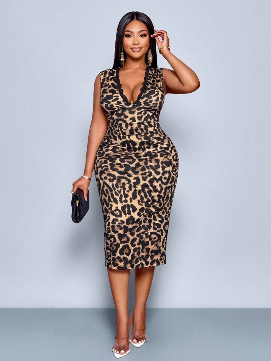 Vestido midi elegante de manga farol con cuello en v profundo, estampado de leopardo y encaje de colores contrastantes para mujer de talla grande. ideal para ir al trabajo, citas casuales, san valentin sexy y romantico, y fiestas de primavera y
